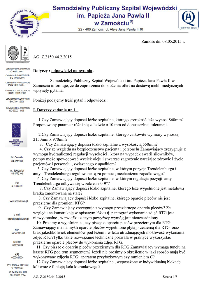 Zamość dn. 08.05.2015 r. AG. Z.2150.44.2.2015 Dotyczy : odpowiedzi na pytania . Samodzielny Publiczny Szpital Wojewódzki im. Papieża Jana Pawła II w Zamościu informuje, że do zaproszenia do złożenia ofert na dostawę mebli medycznych wpłynęły pytania. Poniżej podajemy treść pytań i odpowiedzi: I. Dotyczy zadania nr 1 1.Czy Zamawiający dopuści łóżko szpitalne, którego szerokość leża wynosi 860mm? Proponowany parametr różni się zaledwie o 10 mm od dopuszczlnej tolerancji. 2.Czy Zamawiający dopuści łóżko szpitalne, którego całkowite wymiary wynoszą 2150mm x 970mm? 3. Czy Zamawiający dopuści łóżko szpitalne z wysokością 550mm? 4. Czy ze względu na bezpieczeństwo pacjenta i personelu Zamawiający zrezygnuje z wymogu hydraulicznej regulacji wysokości , która na wypadek awarii siłowników, pompy może spowodować wyciek oleju i stwarzać zagrożenie narażając zdrowie i życie pacjentów i personelu , związanego z upadkiem? 5. Czy Zamawiający dopuści łóżko szpitalne, w którym pozycje Trendelenburga i anty- Trendelenburga regulowane są za pomocą mechanizmu zapadkowego? 6. Czy Zamawiający dopuści łóżko szpitalne, w którym regulacja pozycji antyTrendelenburga odbywa się w zakresie 0-9°? 7. Czy Zamawiający dopuści łóżko szpitalne, którego leże wypełnione jest metalową kratką zmontowaną na stałe? 8. Czy Zamawiający dopuści łóżko szpitalne, którego oparcie pleców nie jest przezierne dla promieni RTG? 9. Czy Zamawiający zrezygnuje z wymogu przeziernego oparcia pleców? Ze względu na konstrukcję w opisanym łóżku tj. pantograf wykonanie zdjęć RTG jest niewykonalne , w zwiążku z czym powyższy wymóg jest nieuzasadniony. 10. Prosimy o wyjaśnienie , czy pisząc o oparciu pleców przeziernym dla RTG Zamawiający ma na myśli oparcie pleców wypełnione płytą przezierną dla RTG oraz brak jakichkolwiek elementów pod leżem i w leżu utrudniających możliwość wykonania zdjęć RTG?Tylko takie rozwiązanie techniczne pozwala w praktyce wykorzystać przezierne oparcie pleców do wykonania zdjęć RTG. 11. Czy pisząc o oparciu pleców przeziernym dla RTG Zamawiający wymaga tunelu na kasetę RTG pod tym segmentem? Jeżeli nie prosimy o określenie w jaki sposób mają być wykonywane zdjęcia RTG: aparatem przyłóżkowym czy ramieniem C? 12.Czy Zamawiający dopuści łóżko szpitalne , wyposażone w indywidualną blokadę kół wraz z funkcją koła kierunkowego? AG. Z.2150.44.2.2015 Strona 1/5 13.Czy Zamawiający dopuści łóżko szpitalne, które nie jest wyposażone w autoregresje segmentu pleców i uda? Odpowiedzi: Dotyczy pytania nr 1. Zamawiający wyraża zgodę na proponowaną szerokość leża która wynosi 860mm. Dotyczy pytania 2-9,11-13. Zamawiający nie wyraża zgody na proponowane zmiany. Dotyczy pytania nr 10. Tak Zamawiający wyraża zgodę na oparcie pleców wypełnione płytą przezierną dla RTG II.Dotyczy zadania nr 1 1. Czy Zamawiający dopuści w zadaniu 1 łóżko szpitalne , którego wymiary leża wynoszą 2000 x 850mm? Odpowiedź:Tak. 2. Czy Zamawiający dopuści łóżko o szerokości maksymalnej 970mm? Co nieznacznie różni się od oferowanego parametru. Odpowiedź:Nie. 3. Czy Zamawiający dopuści łóżko z regulacją kąta przechyłu Trendelenberga oraz anty - Trendelenberga w zakresie 0-16 stopni? Co jest parametrem korzystniejszym od oferowanego. Odpowiedź:Tak. 4. Czy Zamawiający dopuści łóżko z regulacją kąta odchylenia oparcia pleców w zakresie 0-70 stopni? Odpowiedź:Tak. 5. Czy Zamawiający dopuści łóżko z regulacją kąta odchylenia oparcia uda w zakresie 0-40 stopni? Odpowiedź:Tak. 6. Czy Zamawiający dopuści łóżko którego szczyty wypełnione są tworzywem sztucznym w kolorze beżowym? Jest to odpowiednik koloru ambient maple, który stosowany jest w szczytach tworzywowych. Uzyskanie koloru ambient maple w tym przypadku jest niemożliwe ponieważ jest to kolor „drewnopodobny”. Odpowiedź:Tak. III. Dotyczy zadania nr 1 1. Czy Zamawiający dopuści do zaoferowania łóżka szpitalne posiadające leże o wymiarach 2000x850mm? Oferowany wymiar tylko w nieznacznym stopniu odbiega od wymaganego w SIWZ. Odpowiedź:Tak. AG. Z.2150.44.2.2015 Strona 2/5 2. Czy Zamawiający dopuści do zaoferowania łóżka szpitalne o długości całkowitej wynoszącej 2180mm? Oferowany wymiar tylko w nieznacznym stopniu odbiega od wymaganego w SIWZ. Odpowiedź:Tak. 3. Czy Zamawiający dopuści do zaoferowania łóżka szpitalne posiadające szerokość całkowitą wynoszącą 960mm?Oferowany wymiar tylko w nieznacznym stopniu odbiega od wymaganego w SIWZ. Odpowiedź:Tak. 4. Czy Zamawiający dopuści do zaoferowania łóżka szpitalne z regulacją wysokości leża w zakresie 395 do 820 mm?Oferowany wymiar tylko w nieznacznym stopniu odbiega od wymaganego w SIWZ. Odpowiedź:Tak. 5. Czy Zamawiający dopuści do zaoferowania łóżka szpitalne z regulacją kąta przechyłu Trendelenberga od 0 do 17 stopni? Odpowiedź:Tak. 6. Czy Zamawiający dopuści do zaoferowania łóżka szpitalne z regulacją kąta przechyłu anty – Trendelenberga od 0 do 18 stopni? Odpowiedź:Tak. 7. Czy Zamawiający dopuści do zaoferowania łóżka szpitalne z regulacją kąta odchylenia oparcia pleców w zakresie od 0 do 74 stopni?Oferowany wymiar tylko w nieznacznym stopniu odbiega od wymaganego w SIWZ. Odpowiedź:Tak. 8. Czy Zamawiający dopuści do zaoferowania łóżka szpitalne z regulacją segmentu oparcia uda w zakresie od 0 do 40 stopni? Oferowany wymiar tylko w nieznacznym stopniu odbiega od wymaganego w SIWZ. Odpowiedź:Tak. 9. Czy w celu zachowania wymogu z punktu 12 tabeli technicznej dotyczącego przeziemności dla promieni RTG segmentu oparcia pleców, Zamawiający dopuści do zaoferowania łóżko szpitalne z segmentami leża wypełnionymi panelami z płyty HPL? Pragniemy zauważyć , że tylko takie tworzywo ja HPL (w przeciwieństwie do metalowej siatki czy ABS) zapewnia przezierno