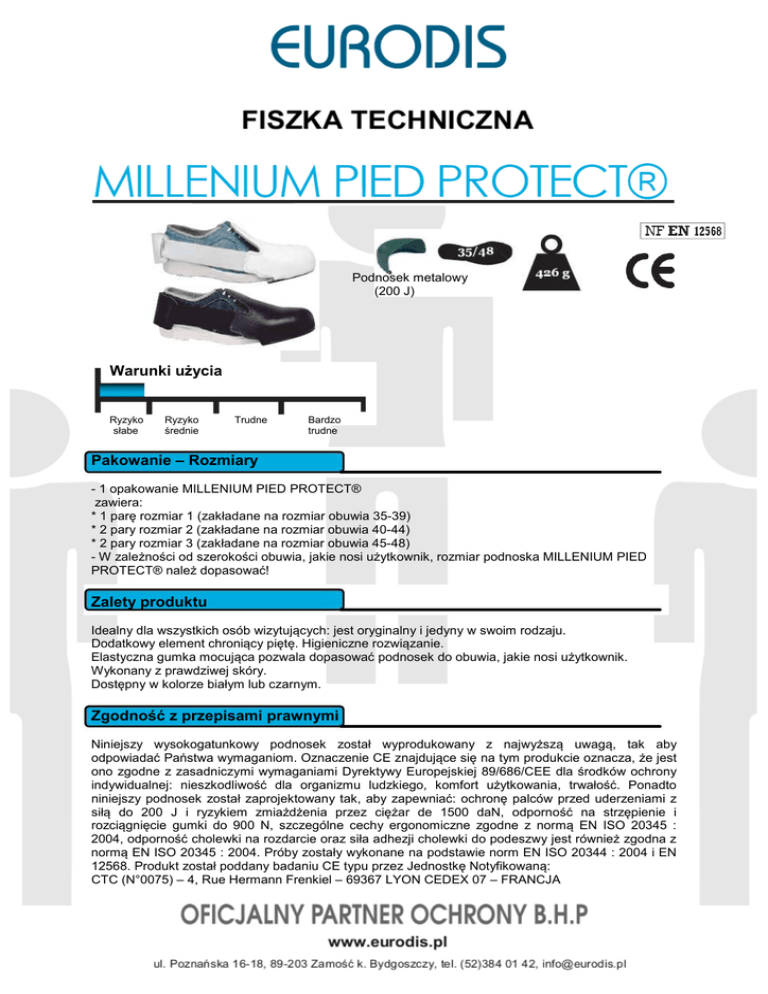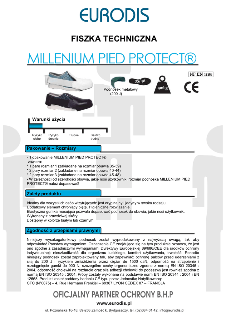 Podnosek metalowy (200 J) Warunki użycia Ryzyko słabe Ryzyko średnie Trudne Bardzo trudne Pakowanie – Rozmiary - 1 opakowanie MILLENIUM PIED PROTECT® zawiera: * 1 parę rozmiar 1 (zakładane na rozmiar obuwia 35-39) * 2 pary rozmiar 2 (zakładane na rozmiar obuwia 40-44) * 2 pary rozmiar 3 (zakładane na rozmiar obuwia 45-48) - W zależności od szerokości obuwia, jakie nosi użytkownik, rozmiar podnoska MILLENIUM PIED PROTECT® należ dopasować! Zalety produktu Idealny dla wszystkich osób wizytujących: jest oryginalny i jedyny w swoim rodzaju. Dodatkowy element chroniący piętę. Higieniczne rozwiązanie. Elastyczna gumka mocująca pozwala dopasować podnosek do obuwia, jakie nosi użytkownik. Wykonany z prawdziwej skóry. Dostępny w kolorze białym lub czarnym. Zgodność z przepisami prawnymi Niniejszy wysokogatunkowy podnosek został wyprodukowany z najwyższą uwagą, tak aby odpowiadać Państwa wymaganiom. Oznaczenie CE znajdujące się na tym produkcie oznacza, że jest ono zgodne z zasadniczymi wymaganiami Dyrektywy Europejskiej 89/686/CEE dla środków ochrony indywidualnej: nieszkodliwość dla organizmu ludzkiego, komfort użytkowania, trwałość. Ponadto niniejszy podnosek został zaprojektowany tak, aby zapewniać: ochronę palców przed uderzeniami z siłą do 200 J i ryzykiem zmiażdżenia przez ciężar de 1500 daN, odporność na strzępienie i rozciągnięcie gumki do 900 N, szczególne cechy ergonomiczne zgodne z normą EN ISO 20345 : 2004, odporność cholewki na rozdarcie oraz siła adhezji cholewki do podeszwy jest również zgodna z normą EN ISO 20345 : 2004. Próby zostały wykonane na podstawie norm EN ISO 20344 : 2004 i EN 12568. Produkt został poddany badaniu CE typu przez Jednostkę Notyfikowaną: CTC (N°0075) – 4, Rue Hermann Frenkiel – 69367 LYON CEDEX 07 – FRANCJA Instrukcja użytkowania i przechowywania Dla optymalnego utrzymania zaleca się, aby użytkownik czyścił produkt w następujący sposób: woskować lub natłuszczać skórę; za pomocą szczotki oczyścić z piasku, cementu i innych zabrudzeń; pozostawić do wyschnięcia, otwarte, z dala od źródła ciepła. Przechowywać w oryginalnym opakowaniu. Maksymalna data używania wynosi 5 lat od daty zaznaczonej na podnosku. LIMIT UŻYTKOWANIA: Produkt chroni jedynie przed określonym ryzykiem. Gwarancja ta jest udzielana tylko na produkt w dobrym stanie i właściwie użytkowany. Stosowanie dodatkowych, nie przewidzianych akcesoriów ochronnych, np. wkładek anatomicznych może mieć wpływ na funkcje ochronne podnoska.