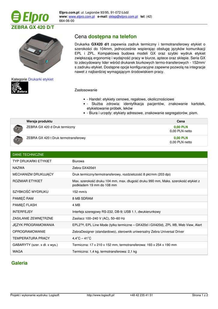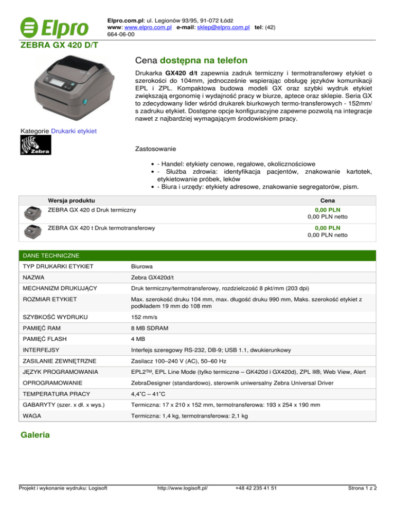 Elpro.com.pl: ul. Legionów 93/95, 91-072 Łódź www: www.elpro.com.pl e-mail: [email protected] tel: (42) 664-06-00 ZEBRA GX 420 D/T Cena dostępna na telefon Drukarka GX420 d/t zapewnia zadruk termiczny i termotransferowy etykiet o szerokości do 104mm, jednocześnie wspierając obsługę języków komunikacji EPL i ZPL. Kompaktowa budowa modeli GX oraz szybki wydruk etykiet zwiększają ergonomię i wydajność pracy w biurze, aptece oraz sklepie. Seria GX to zdecydowany lider wśród drukarek biurkowych termo-transferowych - 152mm/ s zadruku etykiet. Dostępne opcje konfiguracyjne zapewne pozwolą na integracje nawet z najbardziej wymagającym środowiskiem pracy. Kategorie Drukarki etykiet Zastosowanie - Handel: etykiety cenowe, regałowe, okolicznościowe - Służba zdrowia: identyfikacja pacjentów, znakowanie kartotek, etykietowanie próbek, leków - Biura i urzędy: etykiety adresowe, znakowanie segregatorów, pism. Wersja produktu Cena ZEBRA GX 420 d Druk termiczny 0,00 PLN 0,00 PLN netto ZEBRA GX 420 t Druk termotransferowy 0,00 PLN 0,00 PLN netto DANE TECHNICZNE TYP DRUKARKI ETYKIET Biurowa NAZWA Zebra GX420d/t MECHANIZM DRUKUJĄCY Druk termiczny/termotransferowy, rozdzielczość 8 pkt/mm (203 dpi) ROZMIAR ETYKIET Max. szerokość druku 104 mm, max. długość druku 990 mm, Maks. szerokość etykiet z podkładem 19 mm do 108 mm SZYBKOŚĆ WYDRUKU 152 mm/s PAMIĘĆ RAM 8 MB SDRAM PAMIĘĆ FLASH 4 MB INTERFEJSY Interfejs szeregowy RS-232, DB-9; USB 1.1, dwukierunkowy ZASILANIE ZEWNĘTRZNE Zasilacz 100–240 V (AC), 50–60 Hz JĘZYK PROGRAMOWANIA EPL2™, EPL Line Mode (tylko termiczne – GK420d i GX420d), ZPL II®, Web View, Alert OPROGRAMOWANIE ZebraDesigner (standardowo), sterownik uniwersalny Zebra Universal Driver TEMPERATURA PRACY 4,4˚C – 41˚C GABARYTY (szer. x dł. x wys.) Termiczna: 17 x 210 x 152 mm, termotransferowa: 193 x 254 x 190 mm WAGA Termiczna: 1,4 kg, termotransferowa: 2,1 kg Galeria Projekt i wykonanie wydruku: Logisoft http://www.logisoft.pl/ +48 42 235 41 51 Strona 1 z 2 Projekt i wykonanie wydruku: Logisoft Powered by TCPDF (www.tcpdf.org) http://www.logisoft.pl/ +48 42 235 41 51 Strona 2 z 2