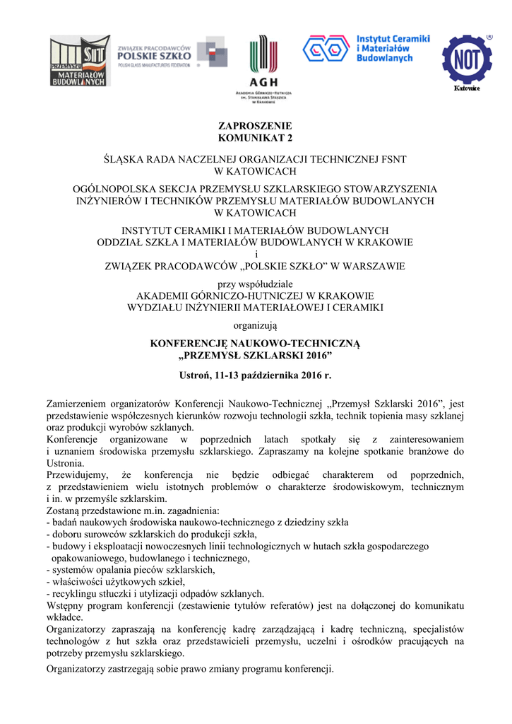 ZAPROSZENIE KOMUNIKAT 2 ŚLĄSKA RADA NACZELNEJ ORGANIZACJI TECHNICZNEJ FSNT W KATOWICACH OGÓLNOPOLSKA SEKCJA PRZEMYSŁU SZKLARSKIEGO STOWARZYSZENIA INŻYNIERÓW I TECHNIKÓW PRZEMYSŁU MATERIAŁÓW BUDOWLANYCH W KATOWICACH INSTYTUT CERAMIKI I MATERIAŁÓW BUDOWLANYCH ODDZIAŁ SZKŁA I MATERIAŁÓW BUDOWLANYCH W KRAKOWIE i ZWIĄZEK PRACODAWCÓW „POLSKIE SZKŁO” W WARSZAWIE przy współudziale AKADEMII GÓRNICZO-HUTNICZEJ W KRAKOWIE WYDZIAŁU INŻYNIERII MATERIAŁOWEJ I CERAMIKI organizują KONFERENCJĘ NAUKOWO-TECHNICZNĄ „PRZEMYSŁ SZKLARSKI 2016” Ustroń, 11-13 października 2016 r. Zamierzeniem organizatorów Konferencji Naukowo-Technicznej „Przemysł Szklarski 2016”, jest przedstawienie współczesnych kierunków rozwoju technologii szkła, technik topienia masy szklanej oraz produkcji wyrobów szklanych. Konferencje organizowane w poprzednich latach spotkały się z zainteresowaniem i uznaniem środowiska przemysłu szklarskiego. Zapraszamy na kolejne spotkanie branżowe do Ustronia. Przewidujemy, że konferencja nie będzie odbiegać charakterem od poprzednich, z przedstawieniem wielu istotnych problemów o charakterze środowiskowym, technicznym i in. w przemyśle szklarskim. Zostaną przedstawione m.in. zagadnienia: - badań naukowych środowiska naukowo-technicznego z dziedziny szkła - doboru surowców szklarskich do produkcji szkła, - budowy i eksploatacji nowoczesnych linii technologicznych w hutach szkła gospodarczego opakowaniowego, budowlanego i technicznego, - systemów opalania pieców szklarskich, - właściwości użytkowych szkieł, - recyklingu stłuczki i utylizacji odpadów szklanych. Wstępny program konferencji (zestawienie tytułów referatów) jest na dołączonej do komunikatu wkładce. Organizatorzy zapraszają na konferencję kadrę zarządzającą i kadrę techniczną, specjalistów technologów z hut szkła oraz przedstawicieli przemysłu, uczelni i ośrodków pracujących na potrzeby przemysłu szklarskiego. Organizatorzy zastrzegają sobie prawo zmiany programu konferencji. TERMIN: KOSZT: MIEJSCE: REFERATY: Konferencja odbędzie się w dniach 11-13 października 2016 roku w Ustroniu. Planowane 4 sesje (ok. 14-16 referatów i prezentacja firm). Koszt uczestnictwa wynosi 1350,00zł + 23% VAT od osoby /płatność do 15.09.2016 r./ w tym pełne wyżywienie, noclegi, materiały sympozjalne, przerwy kawowe, uroczysta kolacja. W przypadku rezerwacji pokoju jednoosobowego koszt konferencji jest wyższy o 150 zł + 23% VAT. Liczba pokoi jednoosobowych jest ograniczona. Wpłaty należy dokonać na nasze konto - ING Bank Śląski S.A. O/Katowice nr rach. 27 1050 1214 1000 0007 0000 8949. Kartę zgłoszenia prosimy przesłać do Śląskiej Rady NOT FSNT w Katowicach (najlepiej równocześnie z przelaniem wpłaty). Ustroń, Hotel Olympic, /pokoje z łazienkami/. Przewiduje się na życzenie rezerwację dodatkowych noclegów z 10 na 11 i z 13 na 14 października 2016 r., płatne odrębnie w recepcji hotelu – rezerwacja dodatkowa zależna od możliwości zakwaterowania w hotelu. Referaty opracowane i prezentowane będą przez znanych specjalistów i technologów zajmujących się zagadnieniami techniki i technologii w przemyśle szklarskim, surowców i materiałów, urządzeń i automatyki, projektantów, konstruktorów i wykonawców pieców szklarskich. /WAŻNE DLA UCZELNI/ możliwość wygłoszenia i zamieszczenia referatów i komunikatów w materiałach sympozjalnych - objętość do 12-15 stron - nieodpłatnie. Termin dostarczenia referatów 14 września 2016 r. Termin zgłoszenia komunikatów: 1 września 2016 r. Warunkiem jest opłacona karta zgłoszeniowa. REFERATY PROMOCYJNE: Wystąpienia promocyjne – referaty i ekspozycje na odrębnych zasadach finansowych, możliwość reklamy w materiałach. Objętość referatów nie powinna przekraczać 10-15 stron, termin zgłoszenia referatów: 1 września 2016 r. ZGŁOSZENIA: Kartę zgłoszenia należy przesłać w terminie j.w. pocztą, faxem - Śląska Rada NOT FSNT w Katowicach, 40-955 Katowice, ul. Podgórna 4, skr. poczt. 468, tel./fax. [32] 256-48-89 lub 256-22-45 lub mailem na adres [email protected]. Informacje pod nr tel. [32] 256-48-89 lub 256-22-45. Zaproszenie ze szczegółowym programem wyślemy pod koniec września 2016 roku. Dyrektor Śląskiej Rady NOT FSNT w Katowicach Tadeusz Zadrożny WYSŁAĆ DO ŚLĄSKIEJ RADY NOT FSNT W KATOWICACH ŚLĄSKA RADA NACZELNEJ ORGANIZACJI TECHNICZNEJ FSNT W KATOWICACH 40-955 Katowice, ul. Podgórna 4 KARTA ZGŁOSZENIA KONFERENCJA NAUKOWO-TECHNICZNA „PRZEMYSŁ SZKLARSKI 2016” Ustroń, 11- 13 października 2016 r. Hotel Olympic Imię i nazwisko Tytuł naukowy Zakład pracy Dokładny adres (tel. i fax) Stanowisko Karta zgłoszenia powinna wpłynąć do Śląskiej Rady NOT FSNT w Katowicach w do 15.09.2016 r. - koszt 1350 zł + 23% VAT od osoby. W przypadku rezerwacji pokoju jednoosobowego koszt konferencji jest wyższy o 150 zł + 23%VAT. Liczba pokoi jednoosobowych jest ograniczona. Prosimy o rezerwację pokoju jednoosobowego Dot.: promocji Zgłaszam: - referat promocyjny – komunikat tytuł ................................................................. .................................................................................................................................................................... - reklamę w materiałach - ekspozycję/stoisko Rezerwacja dodatkowych noclegów 10/11 października i/lub 13/14 października 2016 r. (prosimy o zakreślenie odpowiednich dat) - płatna odrębnie w recepcji hotelu – rezerwacja dodatkowa zależna od możliwości zakwaterowania w hotelu Zobowiązujemy się przekazać należną kwotę: 1350 zł +23%VAT za jednego uczestnika tj. 1660,50 zł brutto, w przypadku rezerwacji pokoju jednoosobowego dodatkowo 150zł +23% VAT na Wasze konto: ING Bank Śląski S.A. O/Katowice nr rach. 27 1050 1214 1000 0007 0000 8949. Jednocześnie oświadczamy, że : nie jestem płatnikiem VAT jesteśmy płatn