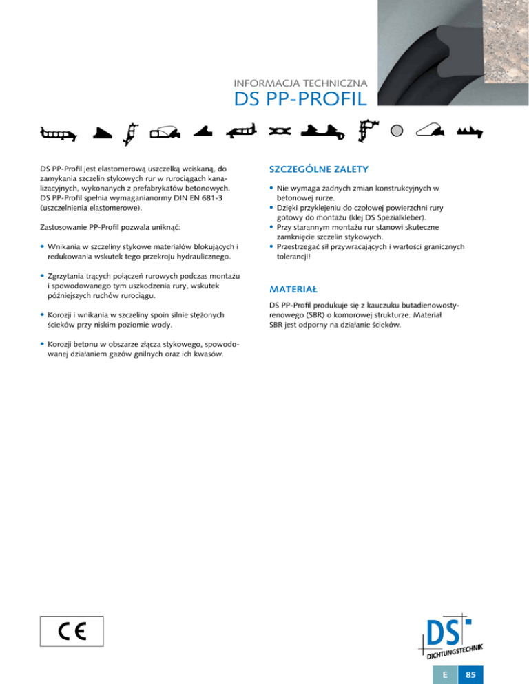 INFORMACJA TECHNICZNA DS PP-PROFIL DS PP-Profil jest elastomerową uszczelką wciskaną, do zamykania szczelin stykowych rur w rurociągach kanalizacyjnych, wykonanych z prefabrykatów betonowych. DS PP-Profil spełnia wymaganianormy DIN EN 681-3 (uszczelnienia elastomerowe). Zastosowanie PP-Profil pozwala uniknąć: zzWnikania w szczeliny stykowe materiałów blokujących i redukowania wskutek tego przekroju hydraulicznego. trących połączeń rurowych podczas montażu i spowodowanego tym uszkodzenia rury, wskutek późniejszych ruchów rurociągu. SZCZEGÓLNE ZALETY zzNie wymaga żadnych zmian konstrukcyjnych w betonowej rurze. zzDzięki przyklejeniu do czołowej powierzchni rury gotowy do montażu (klej DS Spezialkleber). zzPrzy starannym montażu rur stanowi skuteczne zamknięcie szczelin stykowych. zzPrzestrzegać sił przywracających i wartości granicznych tolerancji! zzZgrzytania zzKorozji i wnikania w szczeliny spoin silnie stężonych ścieków przy niskim poziomie wody. MATERIAŁ DS PP-Profil produkuje się z kauczuku butadienowostyrenowego (SBR) o komorowej strukturze. Materiał SBR jest odporny na działanie ścieków. zzKorozji betonu w obszarze złącza stykowego, spowodowanej działaniem gazów gnilnych oraz ich kwasów. E 85 WYBÓR PROFILU I MONTAŻ RUR PRZYGOTOWANIE I MONTAŻ PP-Profil1) wymiary szer. x wys. [mm] Przydatne dla2) szczeliny stykowej po montażu [mm] Siły ściskające3) dla śr. szczeliny [KN /m] 10 x 15 10 ± 2 3,8 18 x 22 14 ± 3 4,5 5,2 25 x 30 20 ± 4 30 x 35 23 ± 5 5,6 35 x 45 30 ± 6 6,0 1) Wielkość profilu PP-Profil zależy od wymiarów i konstrukcji kielicha oraz średnicy rury DN. W poszczególnych przypadkach, przy maksymalnej szczelinie stykowej, należy sprawdzić skuteczność uszczelnienia uszczelki głównej! zzWszystkie elementy poddawane obróbce muszą być czyste, suche i odtłuszczone. zzPowierzchnię czołową kielicha nasmarować klejem DS Kontaktkleber i odczekać, aż lekko podeschnie. zzProfil zwinięty w ślimaka nasmarować na gładkiej stronie klejem DS Kontaktkleber i odczekać, aż lekko podeschnie. zzNasmarowany profil, zaczynając od wierzchołka, docisnąć i przykleić na powierzchni czołowej kielicha ok. 5 –10 mm od średnicy wewnętrznej. zzKońcówki 2) Zmiany szczeliny stykowej, wynikające z nierównoległości powierzchni czołowych rur oraz montażu, razem wzięte, nie mogą przekraczać podanych tolerancji! Konieczne jest wystarczające odkształcenie minimalne profilu PP-Profil ≥ 20% w kanałach wyposażonych również w zamknięcia szczelinowe bez funkcji uszczelnienia. 3) Siły przywracające profili PP-Profil muszą być podczas montażu rur trwale pochłaniane. W tym celu należy przedsięwziąć odpowiednie działania! profilu obciąć gładko w miejscu styku pod kątem prostym. Powierzchnie stykowe posmarować cienką warstwą kleju DS Spezialkleber, odczekać aż lekko podeschnie i mocno ścisnąć. WYDAJNOŚĆ KLEJU Wymiary [mm] Wydajność kleju [l/m] 10 x 15 0,02 - 0,03 18 x 22 0,04 - 0,06 25 x 30 0,05 - 0,08 30 x 35 0,06 - 0,10 35 x 45 0,07 - 0,12 Na podane w tabelach i na wykresach własności udzielamy gwarancji jedynie wtedy, jeżeli spełniają one odpowiednie normy. Nasze instrukcje i ulotki zawierają rzetelne wskazówki, dotyczące produktów. Ich treść nie jest jednak prawnie wiążąca. Ponadto obowiązują nasze Ogólne Warunki Dostaw. 86 E