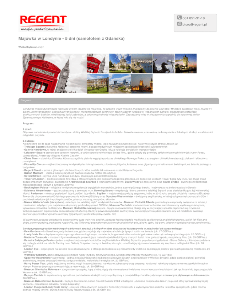061 851-31-18 [email protected] Majówka w Londynie - 5 dni (samolotem z Gdańska) Wielka Brytania Londyn Program Londyn to miasto dynamiczne i tętniące życiem idealne na majówkę. To właśnie w tym mieście znajdziemy dosłownie wszystko! Mnóstwo światowej klasy muzeów i galerii, słynnych teatrów, ekskluzywnych sklepów, monumentalnych pomników, fascynujących kościołów, wspaniałych parków, eleganckich restauracji, ekskluzywnych butików, niezliczonej ilości zabytków, a także oryginalność mieszkańców. Zapraszamy więc w niezapomnianą podróż do kolorowej stolicy Zjednoczonego Królestwa, w której nikt się nie nudzi! Program: 1 dzień: Odprawa na lotnisku i przelot do Londynu - stolicy Wielkiej Brytanii. Przejazd do hotelu. Zakwaterowanie, czas wolny na korzystanie z lokalnych atrakcji w zależności od godzin przylotu. 2-3 dzień: Kolejne dwa dni to czas na poznanie niesamowitej atmosfery miasta, jego najważniejszych miejsc i najsłynniejszych atrakcji, takich jak - Trafalgar Square z kolumną Nelsona i czterema lwami, będące tradycyjnym miejscem spotkań politycznych i sylwestrowych - Galeria Narodowa, w której znajduje się kilka dzieł Vincenta van Gogha i duża kolekcja brytyjskich impresjonistów - Leicaster Square stanowiące centrum rozrywki, a także serce londyńskiego świata filmu, gdzie odbyły się premiery takich światowych hitów jak Harry Potter, James Bond, Avatar czy Alicja w Krainie Czarów - China Town – dzielnica Chińska, która szczególnie pięknie wygląda podczas chińskiego Nowego Roku, z szeregiem chińskich restauracji, piekarni i sklepów z pamiątkami - Piccadilly Circus – najbardziej znany londyński plac i skrzyżowanie, z fontanną i figurką Anterosa oraz gigantycznymi reklamami świetlnymi, na ścianie jednego z budynków - Regent Street – jedna z głównych ulic handlowych, która została tak nazwa na cześć Księcia Regenta - British Muzeum – jedno z największych na świecie muzeów historii starożytnej - Oxford Street – słynna ulica handlowa Londynu skupiająca ponad 300 sklepów - Tower of London – średniowieczna twierdza, z którą związana jest popularna legenda głosząca, że dopóki na wieżach Tower będą żyły kruki, tak długo trwać będzie imperium brytyjskie, zwiedzanie Królewskiego Skarbca z klejnotami koronnymi, Białej Wieży ze zbrojownią oraz Tower Bridge - słynnego zwodzonego mostu będącego jednym z symboli Londynu - Buckingham Palace – oficjalna londyńska rezydencja brytyjskich monarchów, jedna z pereł późnego baroku i największy na świecie pałac królewski - Dzielnica Westminster – gdzie zobaczymy z zewnątrz m.in. Downing Street – rezydencję i biuro premiera Wielkiej Brytanii oraz siedzibę Rządu Jej Królewskiej Mości, Parlament - miejsce posiedzeń Izby Lordów i Izby Gmin, Big Ben – najsłynniejszą wieżę zegarową, która w 2012 roku została oficjalnie nazwana Elizabeth Tower dla uhonorowania 60-letniego panowania królowej Elżbiety oraz Opactwo Westminister – świątynię anglikańską, w której odbywa się koronacja królów i pochówek władców jak i wybitnych poetów, pisarzy, malarzy, muzyków, aktorów - Muzea Wiktoriańskie (do wyboru), należące do „wielkiej trójki” londyńskich muzeów - Muzeum Victorii i Alberta gromadzące eksponaty związane ze sztuką i rzemiosłem artystycznym, najstarsze eksponaty pochodzą sprzed 5000 lat, Muzeum Techniki z modelami samochodów, samolotów czy wystawą poświęconą lądowaniu człowieka na Księżycu, Muzeum Historii Naturalnej miejsce, dające niepowtarzalną okazję aby w porywający sposób zapoznać się z życiem i funkcjonowaniem organizmów zamieszkujących Ziemię. Każdy z pewnością będzie zachwycony poruszającymi się dinozaurami, czy też modelami zwierząt, zachowującymi ich oryginalne rozmiary (gigantyczny płetwal błękitny, żyrafa, itd.) W przerwach podczas zwiedzania proponujemy czas wolny na posiłek, podczas którego będzie możliwość spróbowania angielskich potraw, takich jak Fish and chips, słynny pudding, tradycyjne Apple Pie, czy Trifle oraz posmakowania słynnych angielskich piw, ginów, cydru lub perry (płatne indywidualnie wg zamówienia). Londyn proponuje także wiele innych ciekawych atrakcji, z których można skorzystać fakultatywnie w zależności od czasu wolnego: - Kew Gardens – królewskie ogrody botaniczne, gdzie znajduje się największa kolekcja żywych roślin na świecie (ok. 17 GBP/os.) - Londyńskie Zoo – będące najstarszym ogrodem zoologicznym na świecie, bogactwo i różnorodność gatunków zwierząt zachwycą każdego (ok. 26 GBP/os.) - Madame Tussauds – muzeum figur woskowych, prezentujące naturalnej wielkości figury znanych ludzi, m.in. gwiazd sportu, muzyki czy filmu (ok. 35 GBP/os.) - Katedra Świętego Pawła – jeden z najbardziej znanych kościołów anglikańskich w Wielkiej Brytanii z popularnymi galeriami - Stone Gallery, z której rozpościera się rozległy widok na zakole Tamizy oraz Galerią Szeptów znaną ze świetnej akustyki, umożliwiającej porozumiewanie się szeptem z odległości 30 m (ok. 18 GBP/os.) - London Eye – największe na świecie koło obserwacyjne, z którego rozpościera się niesamowity widok na zapierającą dech w piersiach panoramę miasta (ok. 25 GBP/os.) - Wembley Stadium, gdzie odbywają się mecze rugby i futbolu amerykańskiego, wyścigi oraz imprezy muzyczne (ok. 16 GBP/os.) - Opactwo Westminister (wewnątrz) - jedna z najważniejszych i najbardziej znanych świątyń anglikańskich w Wielkiej Brytanii, gdzie oprócz pięknej gotyckiej architektury, można zobaczyć również antyczne dzieła, malowidła i tekstylia (ok. 20 GBP/os.) - Harry Potter Tour, gdzie wejdziemy w świat magii i czarodziejstwa, na własne zobaczymy oczy zestawy, kostiumy i rekwizyty używane we wszystkich filmach o Harrym Potterze (wymagana wcześniejsza rezerwacja, ok. 30 GBP/os) - Muzeum Sherlo