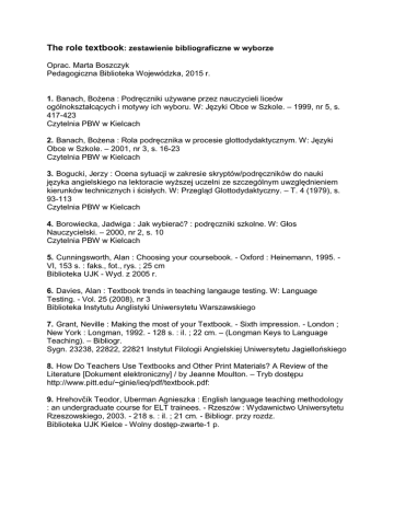 The role textbook: zestawienie bibliograficzne w wyborze Oprac. Marta Boszczyk Pedagogiczna Biblioteka Wojewódzka, 2015 r. 1. Banach, Bożena : Podręczniki używane przez nauczycieli liceów ogólnokształcących i motywy ich wyboru. W: Języki Obce w Szkole. – 1999, nr 5, s. 417-423 Czytelnia PBW w Kielcach 2. Banach, Bożena : Rola podręcznika w procesie glottodydaktycznym. W: Języki Obce w Szkole. – 2001, nr 3, s. 16-23 Czytelnia PBW w Kielcach 3. Bogucki, Jerzy : Ocena sytuacji w zakresie skryptów/podręczników do nauki języka angielskiego na lektoracie wyższej uczelni ze szczególnym uwzględnieniem kierunków technicznych i ścisłych. W: Przegląd Glottodydaktyczny. – T. 4 (1979), s. 93-113 Czytelnia PBW w Kielcach 4. Borowiecka, Jadwiga : Jak wybierać? : podręczniki szkolne. W: Głos Nauczycielski. – 2000, nr 2, s. 10 Czytelnia PBW w Kielcach 5. Cunningsworth, Alan : Choosing your coursebook. - Oxford : Heinemann, 1995. VI, 153 s. : faks., fot., rys. ; 25 cm Biblioteka UJK - Wyd. z 2005 r. 6. Davies, Alan : Textbook trends in teaching langauge testing. W: Language Testing. - Vol. 25 (2008), nr 3 Biblioteka Instytutu Anglistyki Uniwersytetu Warszawskiego 7. Grant, Neville : Making the most of your Textbook. - Sixth impression. - London ; New York : Longman, 1992. - 128 s. : il. ; 22 cm. – (Longman Keys to Language Teaching). – Bibliogr. Sygn. 23238, 22822, 22821 Instytut Filologii Angielskiej Uniwersytetu Jagiellońskiego 8. How Do Teachers Use Textbooks and Other Print Materials? A Review of the Literature [Dokument elektroniczny] / by Jeanne Moulton. – Tryb dostępu http://www.pitt.edu/~ginie/ieq/pdf/textbook.pdf: 9. Hrehovčík Teodor, Uberman Agnieszka : English language teaching methodology : an undergraduate course for ELT trainees. - Rzeszów : Wydawnictwo Uniwersytetu Rzeszowskiego, 2003. - 218 s. : il. ; 21 cm. - Bibliogr. przy rozdz. Biblioteka UJK Kielce - Wolny dostęp-zwarte-1 p. 10. Hutchinson Tom, Torres Eunice : The textbook as agent of change [Dokument elektroniczny]. – Tryb dostępu : http://citeseerx.ist.psu.edu/viewdoc/download?doi=10.1.1.476.1187&rep=rep1&type= pdf 11. Incorporating intercultural communicative competence in language teacher education / Ildikó Lázár [et. al.] ; European Centre for Modern Languages. Strasbourg : Council of Europe Publishing, 2003. - 107 s. : il. ; 24 cm. Zawiera: The views of teachers of English and French on intercultural communicative competence in language teaching / Lucyna Aleksandrowicz-Pędlich [et. al.]; The role of culture in foreign language teaching materials: an evaluation from an intercultural perspective / Liljana Skopinskaja; Introducing Mirrors and windows: an intercultural communication textbook / Ildikó Lázár; Testing times: testing intercultural communicative competance / Raymond Facciol and Rafn Kjartansson. Biblioteka Instytutu Anglistyki Uniwersytetu Warszawskiego 12. Iwan, Piotr : Kryteria analizy jakości dydaktycznej tekstów podręcznikowych. W: Języki Obce w Szkole. – 1998, nr 4, s. 303-308’ Czytelnia PBW w Kielcach 13. Koć, Genowefa : Dydaktyczne problemy podręcznika języków obcych dla lektoratów. W: Przegląd Glottodydaktyczny. – T. 3 (1979), s. 85-102 Czytelnia PBW w Kielcach 14. Kuczyński, Marek : Wygląd, osobowość i duchowość w dydaktyce języków obcych. W: Edukacja Humanistyczna. – 2000, nr 2-3, s. 29-41 Czytelnia PBW w Kielcach 15. Nalepa, Maria : Jak wybrać podręcznik. W: Gazeta Szkolna. – 2000, nr 13, s. 3 Czytelnia PBW w Kielcach 16. Niezgoda, Ewa : O podręcznikach i nie tylko podręcznikach do nauki języków obcych. W: Języki Obce w Szkole. – 1990, nr 4, s. 211-216 Czym dysponujemy, co planujemy, do jakich książek poszukujemy autorów. Czytelnia PBW w Kielcach 17. Nunan, David : Language Teaching Methodology : A textbook for teachers. Nev York : Prentice Hall , 1991. - 264, [7] vol ; 23,5cm. – (Prentice Hall International English Language Teaching) Wrocław - Biblioteka Uniwersytecka Lublin - Biblioteka Główna Uniwersytetu Marii Curie-Skłodowskiej Kraków - Biblioteka Jagiellońska i Biblioteka Collegium Medicum Uniwersytetu Jagiellońskiego Warszawa - Biblioteki Uniwersytetu Warszawskiego Białystok - Biblioteka Uniwersytecka Gdańsk - Biblioteka Główna Uniwersytetu Gdańskiego Poznań - Biblioteka Uniwersytecka 18. Nunan, David : Language teaching methodology : a textbook for teachers. New York [etc.] : Phoenix ELT, 1995. - XIV, [2], 264 s. : il. ; 24 cm. – (Teacher Education & Development) Lublin - Biblioteka Główna Uniwersytetu Marii Curie-Skłodowskiej Gdańsk - Biblioteka Główna Uniwersytetu Gdańskiego Poznań - Biblioteka Uniwersytecka 19. Podromou, Luke : The great ELT textbook debate: the teacher not the textbook. W: Modern English Teacher . - Vol. 11 (2002), nr 4 Biblioteka Instytutu Anglistyki Uniwersytetu Warszawskiego 20. Parizet, Marie-Louise : Analiza i ocena podręczników do nauki języków obcych. W: Języki Obce w Szkole. – 1992, nr 1, s. 36-37 Sześć kryteriów służących do oceny podręczników. Czytelnia PBW w Kielcach 21. Reforma w nauce języka obcego : nowe programy i podręczniki / Hanna Komorowska (red.) ; Instytut Badań Edukacyjnych. - Warszawa : IBE, 2003. - 227 s. : wykr. ; 21 cm Biblioteka UJK 22. Richards, Jack C. : Approaches and methods in language teaching / Jack C. Richards and Theodore S. Rodgers. - 3rd ed., 6th print. - Cambridge : Cambridge University Press, 2015. - 410 s. : il. ; 25 cm Dostęp online: https://books.google.pl/books?id=gibu9KpIUugC&pg=PA44&dq=the+role+textbook+i n+teaching&hl=pl&sa=X&ved=0CGAQ6AEwCWoVChMIkJrvg637xwIVwlgUCh04Nw M_#v=onepage&q=the%20role%20textbook%20in%20teaching&f=false 23. Richards, Jack C. : Beyond training : perspectives on language teacher education / Jack C. Richards. - Cambridge : Cambridge University Press, 1998. – XVI, 208 s. ; 23 cm. – (Cambridge Language Teaching Library) Dostęp online: https://books.google.pl/books?id=luNE6