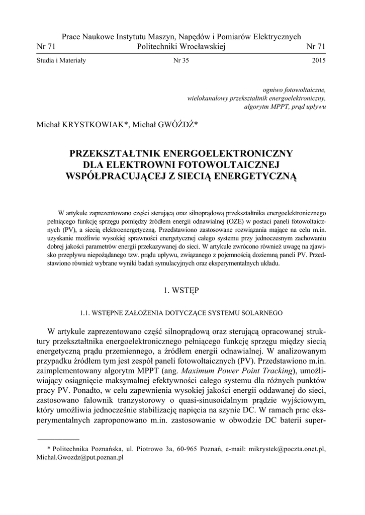 Prace Naukowe Instytutu Maszyn, Napędów i Pomiarów Elektrycznych Nr 71 Politechniki Wrocławskiej Nr 71 Studia i Materiały Nr 35 2015 ogniwo fotowoltaiczne, wielokanałowy przekształtnik energoelektroniczny, algorytm MPPT, prąd upływu Michał KRYSTKOWIAK*, Michał GWÓŹDŹ* PRZEKSZTAŁTNIK ENERGOELEKTRONICZNY DLA ELEKTROWNI FOTOWOLTAICZNEJ WSPÓŁPRACUJĄCEJ Z SIECIĄ ENERGETYCZNĄ W artykule zaprezentowano części sterującą oraz silnoprądową przekształtnika energoelektronicznego pełniącego funkcję sprzęgu pomiędzy źródłem energii odnawialnej (OZE) w postaci paneli fotowoltaicznych (PV), a siecią elektroenergetyczną. Przedstawiono zastosowane rozwiązania mające na celu m.in. uzyskanie możliwie wysokiej sprawności energetycznej całego systemu przy jednoczesnym zachowaniu dobrej jakości parametrów energii przekazywanej do sieci. W artykule zwrócono również uwagę na zjawisko przepływu niepożądanego tzw. prądu upływu, związanego z pojemnością doziemną paneli PV. Przedstawiono również wybrane wyniki badań symulacyjnych oraz eksperymentalnych układu. 1. WSTĘP 1.1. WSTĘPNE ZAŁOŻENIA DOTYCZĄCE SYSTEMU SOLARNEGO W artykule zaprezentowano część silnoprądową oraz sterującą opracowanej struktury przekształtnika energoelektronicznego pełniącego funkcję sprzęgu między siecią energetyczną prądu przemiennego, a źródłem energii odnawialnej. W analizowanym przypadku źródłem tym jest zespół paneli fotowoltaicznych (PV). Przedstawiono m.in. zaimplementowany algorytm MPPT (ang. Maximum Power Point Tracking), umożliwiający osiągnięcie maksymalnej efektywności całego systemu dla różnych punktów pracy PV. Ponadto, w celu zapewnienia wysokiej jakości energii oddawanej do sieci, zastosowano falownik tranzystorowy o quasi-sinusoidalnym prądzie wyjściowym, który umożliwia jednocześnie stabilizację napięcia na szynie DC. W ramach prac eksperymentalnych zaproponowano m.in. zastosowanie w obwodzie DC baterii super__________ * Politechnika Poznańska, ul. Piotrowo 3a, 60-965 Poznań, e-mail: [email protected], [email protected] 41 kondensatorów lub zespołu akumulatorów spełniających funkcję bufora energii elektrycznej. W konsekwencji, w znaczącym stopniu ograniczono wpływ zmiennej wydajności energetycznej paneli fotowoltaicznych (zależnej, np. od panujących warunków atmosferycznych) na funkcjonowanie systemu przetwarzania energii. Rozważono również możliwość implementacji w obwodzie pośredniczącym DC układu przekształtnika typu BOOST w wersji wielokanałowej (ang. interleaved BOOST converter – I-BOOST). W analizach uwzględniono także oddziaływanie na pracę układu negatywnego zjawiska związanego z przepływem tzw. prądu upływu paneli PV oraz zaprezentowano sposób jego eliminacji. W artykule przedstawiono ponadto wybrane wyniki badań symulacyjnych oraz eksperymentalnych, umożliwiających kompleksową ocenę poprawności funkcjonowania całego systemu. 1.2. SCHEMAT BLOKOWY SYSTEMU I OGÓLNA ZASADA DZIAŁANIA Schemat blokowy systemu umożliwiającego przekazywanie energii z zespołu paneli fotowoltaicznych do sieci energetycznej prądu przemiennego zaprezentowano na rysunku 1. Rys. 1. Uproszczony schemat blokowy systemu przetwarzania energii Można w nim wyróżnić następujące bloki i elementy systemu przetwarzania energii: • bloki przekształtników energoelektronicznych pełniących funkcję sprzęgu DC/AC, w skład którego wchodzą: – przekształtnik DC/DC typu BOOST – wraz z obwodem pośredniczącym prądu stałego, – przekształtnik (falownik) sieciowy, • samą sieć energetyczną. W rozważanym przypadku założono wykorzystanie zespołu paneli fotowoltaicznych o zakresie zmienności napięcia wyjściowego (zależnego m.in. od temperatury, stopnia obciążenia oraz natężenia padającego promieniowania słonecznego) od 150 do 450 V – stąd konieczność zastosowania przetwornicy DC/DC typu BOOST. Przykładową rodzinę charakterystyk prądowo-napięciowych zespołu ogniw fotowoltaicznych PV przedstawiono na rysunku 2 [12]. 42 Rys. 2. Przykładowe charakterystyki prądowo-napięciowe zespołu ogniw PV [12] Jak z nich wynika, moc uzyskiwana z baterii słonecznej jest zależna w dużym stopniu od sposobu obciążenia. W konsekwencji istnieje taka wartość napięcia i prądu, dla których moc uzyskiwana ze źródła energii odnawialnej osiąga wartość maksymalną (tzw. punkt mocy maksymalnej). Z tego też powodu, w celu zapewnienia optymalnych – w sensie energetycznym – warunków pracy całego systemu, w układzie sterowania przekształtnikiem DC/DC należy zaimplementować algorytm sterowania wartością pobieranej z paneli mocy. Jego zadaniem jest zapewnienie takiego punktu pracy ogniwa, aby podążać za punktem mocy maksymalnej zależnie od aktualnych warunków pracy systemu (m.in. temperatury otoczenia, natężenia promieniowania słonecznego). Opracowany i zaimplementowany algorytm MPPT [6, 7] przedstawiono w dalszej części artykułu. Rys. 3. Schemat ideowy części silnoprądowej przekształtnika impulsowego (wersja jednokanałowa) 43 Ze względu na przyjęty zakres napięć wyjściowych ogniw fotowoltaicznych (150 V–450 V) oraz minimalną wymaganą wartość napięcia na szynie DC część silnoprądowa przekształtnika DC/DC bazuje na układzie impulsowym typu BOOST. Na rysunku 3 przedstawiono klasyczną strukturę takiego układu. W docelowym prototypie przemysłowym zamierzone jest zaimplementowanie układu BOOST w wersji wielokanałowej (I-BOOST) – gwarantującego większą efektywność przekazywania energii w szerokim zakresie zmienności napięcia wejściowego (tj. wyjściowego paneli PV). 2. ZAIMPLEMENTOWANY ALGORYTM MPPT Zadaniem przekształtnika DC/DC typu BOOST (lub I-BOOST) jest podwyższenie wartości napięcia wejściowego i dostarczanie (doładowywanie) zespołu kondensatorów stanowiących obwód pośredniczący DC/DC, z którego zasilany je