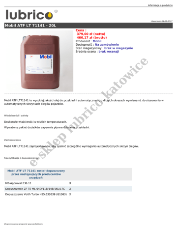 Informacje o produkcie Utworzono 04-03-2017 Mobil ATF LT 71141 - 20L Cena : 379,00 zł (netto) 466,17 zł (brutto) ka to w ic e Producent : Mobil Dostępność : Na zamówienie Stan magazynowy : brak w magazynie Średnia ocena : brak recenzji ic o Mobil ATF LT71141 to wysokiej jakości olej do przekładni automatycznych, o długich okresach wymianami, do stosowania w automatycznych skrzyniach biegów pojazdów. lu br Właściwości i zalety Doskonałe właściwości w niskich temperaturach. ep Wyważony pakiet dodatków zapewnia płynne działanie przekładni. Zastosowania es kl Mobil ATF LT71141 zaprojektowano, aby spełnić szczególne wymagania automatycznych skrzyń biegów. Specyfikacje i dopuszczenia Mobil ATF LT 71141 został dopuszczony przez następujących producentów urządzeń: MB-Approval 236.11 X Dopuszczenie ZF TE-ML 04D/11B/14B/16L/17C X Dopuszczenie Voith Turbo H55.633639 (G1363) X Wygenerowano w programie www.oscGold.com Według ExxonMobil poziom jakości płynu Mobil ATF LT 71141 to: VW TL52162 X Dostępne opcje Mobil ATF LT 71141 - 20L es kl ep lu br ic o ka to w ic e » Rodzaj: Olej do przekładni automatycznych.