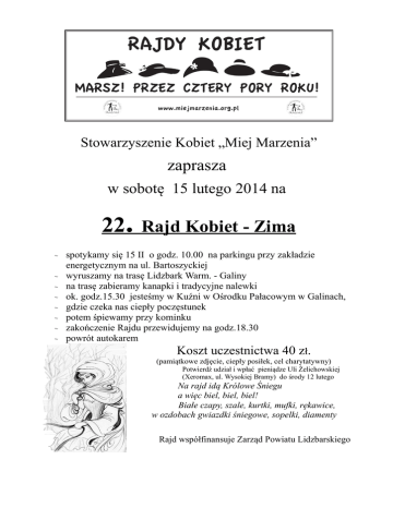 Stowarzyszenie Kobiet „Miej Marzenia” zaprasza w sobotę 15 lutego 2014 na 22. ~ ~ ~ ~ ~ ~ ~ ~ Rajd Kobiet - Zima spotykamy się 15 II o godz. 10.00 na parkingu przy zakładzie energetycznym na ul. Bartoszyckiej wyruszamy na trasę Lidzbark Warm. - Galiny na trasę zabieramy kanapki i tradycyjne nalewki ok. godz.15.30 jesteśmy w Kuźni w Ośrodku Pałacowym w Galinach, gdzie czeka nas ciepły poczęstunek potem śpiewamy przy kominku zakończenie Rajdu przewidujemy na godz.18.30 powrót autokarem Koszt uczestnictwa 40 zł. (pamiątkowe zdjęcie, ciepły posiłek, cel charytatywny) Potwierdź udział i wpłać pieniądze Uli Żelichowskiej (Xeromax, ul. Wysokiej Bramy) do środy 12 lutego Na rajd idą Królowe Śniegu a więc biel, biel, biel! Białe czapy, szale, kurtki, mufki, rękawice, w ozdobach gwiazdki śniegowe, sopelki, diamenty Rajd współfinansuje Zarząd Powiatu Lidzbarskiego
