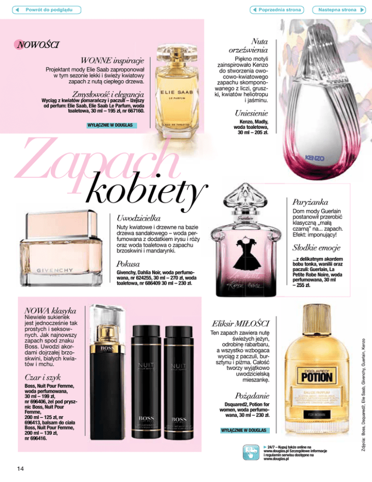 HTMLlink Vorigelink Poprzednia strona Powrót do podgl¹du Nastepna strona Naechstelink Nuta orzeźwienia NOWOŚCI WONNE inspiracje Projektant mody Elie Saab zaproponował w tym sezonie lekki i świeży kwiatowy zapach z nutą ciepłego drzewa. Zmysłowość i elegancja Wyciąg z kwiatów pomarańczy i paczuli – lżejszy od perfum: Elie Saab, Elie Saab Le Parfum, woda toaletowa, 30 ml – 195 zł, nr 667160. WYŁĄCZNIE W DOUGLAS Zapach kobiety Piękno motyli zainspirowało Kenzo do stworzenia owocowo-kwiatowego zapachu skomponowanego z liczi, gruszki, kwiatów heliotropu i jaśminu. Uniesienie Kenzo, Madly, woda toaletowa, 30 ml – 205 zł. Paryżanka Dom mody Guerlain postanowił przerobić klasyczną „małą czarną” na... zapach. Efekt: imponujący! Uwodzicielka Nuty kwiatowe i drzewne na bazie drzewa sandałowego – woda perfumowana z dodatkiem irysu i róży oraz woda toaletowa o zapachu brzoskwini i mandarynki. Słodkie emocje ...z delikatnym akordem bobu tonka, wanilii oraz paczuli: Guerlain, La Petite Robe Noire, woda perfumowana, 30 ml – 255 zł. Pokusa Givenchy, Dahlia Noir, woda perfumowana, nr 624255, 30 ml – 270 zł, woda toaletowa, nr 686409 30 ml – 230 zł. NOWA klasyka Czar i szyk Boss, Nuit Pour Femme, woda perfumowana, 30 ml – 199 zł, nr 696406, żel pod prysznic Boss, Nuit Pour Femme, 200 ml – 125 zł, nr 696413, balsam do ciała Boss, Nuit Pour Femme, 200 ml – 139 zł, nr 696416. Eliksir MIŁOŚCI Ten zapach zawiera nutę świeżych jeżyn, odrobinę rabarbaru, a wszystko wzbogaca wyciąg z paczuli, bursztynu i piżma. Całość tworzy wyjątkowo uwodzicielską mieszankę. Pożądanie Dsquared2, Potion for women, woda perfumowana, 30 ml – 230 zł. WYŁĄCZNIE W DOUGLAS @ 14 24/7 BESTELL- UND LIEFERSERVICE ►24/7 – Kupuj także online na www.douglas.pl Szczegółowe informacje i regulamin serwisu dostępne na www.douglas.pl Zdjęcia: Boss, Dsquared2, Elie Saab, Givenchy, Guerlain, Kenzo Niewiele sukienek jest jednocześnie tak prostych i seksownych. Jak najnowszy zapach spod znaku Boss. Uwodzi akordami dojrzałej brzoskwini, białych kwiatów i mchu.