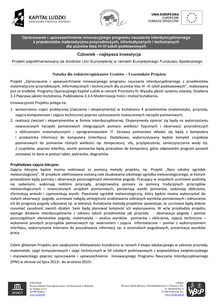 Notatka dla rodziców/opiekunów Uczniów – Uczestników Projektu Projekt „Opracowanie i upowszechnianie innowacyjnego programu nauczania interdyscyplinarnego z przedmiotów matematyczno-przyrodniczych, informatycznych i technicznych dla uczniów klas IV- VI szkół podstawowych”, realizowany jest ze środków Programu Operacyjnego Kapitał Ludzki w ramach Priorytetu III. Wysoka jakość systemu oświaty, Działania 3.3 Poprawa jakości kształcenia, Poddziałania 3.3.4 Modernizacja treści i metod kształcenia. Innowacyjność Projektu polega na: 1. wzmocnieniu części praktycznej (ćwiczenia i eksperymenty) w kształceniu 4 przedmiotów (matematyka, przyroda, zajęcia komputerowe i zajęcia techniczne) poprzez zastosowanie nowoczesnych narzędzi pomiarowych, 2. realizacji ćwiczeń i eksperymentów w formie interdyscyplinarnej. Eksperymenty opierać się będą na wykorzystaniu nowoczesnych narzędzi pomiarowych integrujących pomiary wielkości fizycznych i obserwacji przyrodniczych z obliczeniami matematycznymi i oprogramowaniem IT. Zestawy pomiarowe składać się będą z komputera i przekaźnika informacji do komputera (interfejsu). Dodatkowo, wykorzystywany będzie komplet czujników pomiarowych do pomiarów różnych wielkości np. temperatury, siły, przyśpieszenia, zanieczyszczenia wody itp. Z czujników, poprzez interfejs, wyniki pomiarów będą przesyłane do komputera, gdzie odpowiedni program pozwoli zestawiać te dane w postaci tabel, wykresów, diagramów. Przykładowe zajęcia lekcyjne: Zajęcia lekcyjne będzie można realizować za pomocą metody projektu, np. Projekt „Nasz szkolny ogródek meteorologiczny”. W projekcie zdefiniowane zostaną cele zbudowania szkolnego ogródka meteorologicznego, w którym prowadzone będą pomiary i obserwacje poszczególnych elementów pogody. Pracujący w zespołach uczniowie podzielą się zadaniami, wykonają niektóre przyrządy, przeprowadzą pomiary za pomocą tradycyjnych przyrządów meteorologicznych i nowoczesnych urządzeń pomiarowych, porównają wyniki pomiarów, wykonają obliczenia, sformułują wnioski i zaprezentują wyniki. Powstanie ogródek meteorologiczny, który będzie można wykorzystać do stałych obserwacji pogody, uczniowie nabędą umiejętność analizowania zebranych wyników pomiarowych i odnoszenia ich do prognozy pogody usłyszanej np. w telewizji. Kształcenie metodą projektów spowoduje, że uczniowie będą dobrze rozumieć zasadność swoich działań. Sami będą planować kolejność ich wykonywania. W w/w przykładzie projektu wystąpi działanie interdyscyplinarne z zakresu takich przedmiotów jak przyroda - obserwacja pogody i pomiar poszczególnych elementów pogody, matematyka – analiza wyników pomiarów i obliczenia, zajęcia techniczne – wykonanie prostych przyrządów pomiarowych np. wiatromierz i zajęcia informatyczne – pomiar z wykorzystaniem interfejsu, wykorzystanie Internetu do poszukiwania informacji np. o anomaliach pogodowych, prezentacja wyników pracy. Celem głównym Projektu jest zwiększenie efektywności kształcenia w ramach II etapu edukacyjnego w zakresie przyrody, matematyki, zajęć komputerowych i zajęć technicznych w 50 szkołach podstawowych z województwa świętokrzyskiego i mazowieckiego poprzez opracowanie i upowszechnienie Innowacyjnego Programu Nauczania Interdyscyplinarnego (IPNI) w okresie od lipca 2012r. do września 2015r. PARTNER: Wyższa Szkoła Nauk Społecznych i Technicznych w Radomiu ul. Wodna 13/21 26-600 Radom www.wsnsit.pl LIDER: Wyższa Szkoła Biznesu i Przedsiębiorczości w Ostrowcu Św. ul. Akademicka 12 27-400 Ostrowiec Św. www.wsbip.edu.pl Celem szczegółowym projektu jest wzrost umiejętności wykorzystywania wiedzy w praktyce wśród uczniów ze szkół podstawowych biorących udział w projekcie, w szczególności w zakresie praktycznego zastosowania matematyki i informatyki w wyjaśnianiu zjawisk przyrodniczych oraz zagadnień technicznych. W ramach Projektu nie będą realizowane zajęcia pozalekcyjne, odbywać się będą zgodnie z planem lekcji. Zajęcia w oparciu o IPNI rozpoczną się 1 września 2013r. i zakończą 30 czerwca 2015r. W przypadku kiedy Dyrektor szkoły biorącej udział w projekcie wyrazi zgodę na kontynuowanie realizacji zajęć lekcyjnych w oparciu o IPNI zajęcia będą prowadzone przez cały II etap edukacyjny. Dla uczniów z I rekrutacji (w r.sz. 2013/2014) do czerwca 2016r. dla uczniów z II rekrutacji (w r.sz. 2014/2015) do czerwca 2017 r. W trakcie realizacji projektu Uczniowie wezmą udział w badaniach ewaluacyjnych weryfikujących umiejętności zastosowania wiedzy w praktyce. 1. Przeprowadzenie badań odbędzie się na wejściu wśród uczniów klas IV rozpoczynających IPNI w roku szkolnym 2013/2014 (I rocznik) oraz na wyjściu - zakończenie klasy IV. 2. Przeprowadzenie badań na wejściu wśród kolejnych uczniów klas IV rozpoczynających IPNI w roku szkolnym 2014/2015 (II rocznik) oraz na wyjściu - zakończenie klasy IV. 3. Przeprowadzenie badań w roku szkolnym 2014/2015 na zakończenie klasy V (I rocznik). Dzięki udziałowi w projekcie, uczniowie: - będą pracować na nowoczesnych narzędziach pomiarowych; - nauczą się pracy w grupach/zespołach; - poznają zasady logicznego myślenia; - nauczą się stosować wiedzę w praktyce; - poznają współzależności istniejące w różnych dziedzinach nauki. Uczniowie nie ponoszą żadnych kosztów w związku z uczestnictwem w projekcie. PARTNER: Wyższa Szkoła Nauk Społecznych i Technicznych w Radomiu ul. Wodna 13/21 26-600 Radom www.wsnsit.pl LIDER: Wyższa Szkoła Biznesu i Przedsiębiorczości w Ostrowcu Św. ul. Akademicka 12 27-400 Ostrowiec Św. www.wsbip.edu.pl