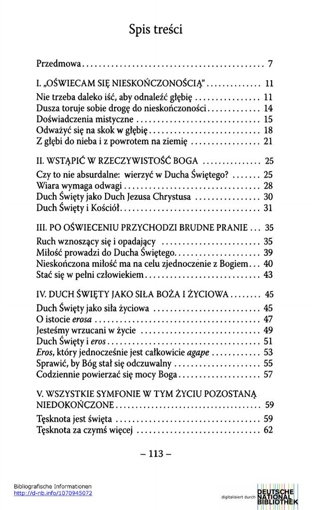 Spis treści Przedmowa.................................................................................. 7 I. „OŚWIECAM SIĘ NIESKOŃCZONOŚCIĄ” ....................... 11 Nie trzeba daleko iść, aby odnaleźć głębię............................11 Dusza toruje sobie drogę do nieskończoności...................... 14 Doświadczenia mistyczne........................................................ 15 Odważyć się na skok w głębię...................................................18 Z głębi do nieba i z powrotem na ziem ię..............................21 II. WSTĄPIĆ W RZECZYWISTOŚĆ BOGA ......................... 25 Czy to nie absurdalne: wierzyć w Ducha Świętego?........... 25 Wiara wymaga odwagi............................................................. 28 Duch Święty jako Duch Jezusa C hrystusa..............................30 Duch Święty i Kościół............................................................... 31 III. PO OŚWIECENIU PRZYCHODZI BRUDNE PRANIE ... 35 Ruch wznoszący się i opadający .............................................35 Miłość prowadzi do Ducha Świętego....................................... 39 Nieskończona miłość ma na celu zjednoczenie z Bogiem... 40 Stać się w pełni człowiekiem.................................................... 43 IV. DUCH ŚWIĘTY JAKO SIŁA BOŻA I ŻYCIOWA............ 45 Duch Święty jako siła życiow a................................................ 45 O istocie erosa.......................................................................... 47 Jesteśmy wrzucani w życie ......................................................49 Duch Święty i eros..................................................................... 51 Eros, który jednocześnie jest całkowicie agape.......................53 Sprawić, by Bóg stał się odczuwalny....................................... 55 Codziennie powierzać się mocy Boga..................................... 57 V. WSZYSTKIE SYMFONIE W TYM ŻYCIU POZOSTANĄ NIEDOKOŃCZONE............................................................... 59 Tęsknota jest św ięta................................................................. 59 Tęsknota za czymś w ięcej........................................................62 Popęd boski i demoniczny........................................................ 65 Końcowy akord pochodzi od Ducha Świętego.......................68 Nasza tęsknota za świętością znajduje ujście w m odlitw ie.............................................................................. 70 VI. WCIĄŻ NA NOWO ŁĄCZYĆ SIĘ Z DUCHEM ŚWIĘTYM.......................................................... 73 Duch Święty przenika każdy moment naszego istnienia___73 Możliwości kontaktu z Duchem Św iętym .............................. 76 Największy pocieszyciel w niedoli........................................... 79 Ogólna nieskończoność staje się osobistym T y.......................82 VII. ODKRYĆ W DUCHU ŚWIĘTYM NIEZNISZCZALNY FUNDAMENT SWOJEGO „JA” .............................................. 88 Znaleźć drogę do prawdziwego „ja”......................................... 88 Doświadczyć związku ze zmarłymi przez Ducha Św iętego..............................................................92 Duch Święty łączy nas z niebem ............................................. 94 Gdy u kresu życia Duch Święty całkiem weźmie mnie w posiadanie...............................................................................96 VIII. NIE OPUSZCZAĆ BOSKIEGO OBIEGU......................... 99 Duch Święty i świat w ieczności...............................................99 Włączyć się do boskiego obiegu w Eucharystii.....................102 Tchnienie wiatru, tchnienie wiatru, wszystko jest tchnieniem w ia tru ............................................................ 104 Tylko Nieskończony jest nieprzemijający.............................. 106 EPILOG................................................................................. 109 Literatura dodatkowa 111