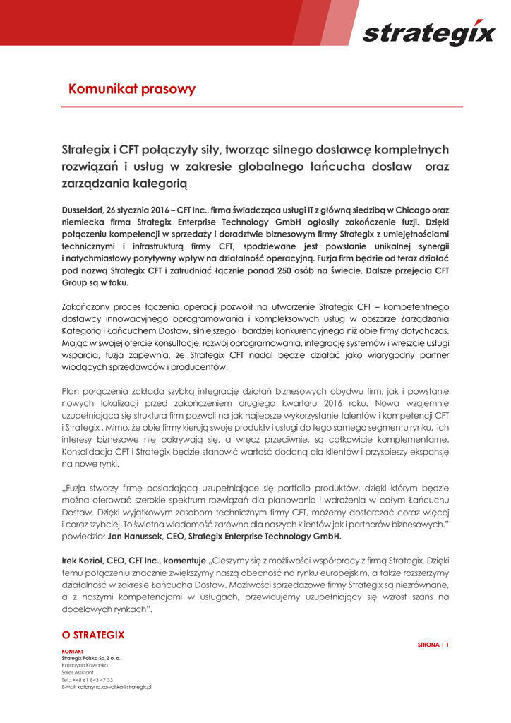 Komunikat prasowy Strategix i CFT połączyły siły, tworząc silnego dostawcę kompletnych rozwiązań i usług w zakresie globalnego łańcucha dostaw oraz zarządzania kategorią Dusseldorf, 26 stycznia 2016 – CFT Inc., firma świadcząca usługi IT z główną siedzibą w Chicago oraz niemiecka firma Strategix Enterprise Technology GmbH ogłosiły zakończenie fuzji. Dzięki połączeniu kompetencji w sprzedaży i doradztwie biznesowym firmy Strategix z umiejętnościami technicznymi i infrastrukturą firmy CFT, spodziewane jest powstanie unikalnej synergii i natychmiastowy pozytywny wpływ na działalność operacyjną. Fuzja firm będzie od teraz działać pod nazwą Strategix CFT i zatrudniać łącznie ponad 250 osób na świecie. Dalsze przejęcia CFT Group są w toku. Zakończony proces łączenia operacji pozwolił na utworzenie Strategix CFT – kompetentnego dostawcy innowacyjnego oprogramowania i kompleksowych usług w obszarze Zarządzania Kategorią i Łańcuchem Dostaw, silniejszego i bardziej konkurencyjnego niż obie firmy dotychczas. Mając w swojej ofercie konsultacje, rozwój oprogramowania, integrację systemów i wreszcie usługi wsparcia, fuzja zapewnia, że Strategix CFT nadal będzie działać jako wiarygodny partner wiodących sprzedawców i producentów. Plan połączenia zakłada szybką integrację działań biznesowych obydwu firm, jak i powstanie nowych lokalizacji przed zakończeniem drugiego kwartału 2016 roku. Nowa wzajemnie uzupełniająca się struktura firm pozwoli na jak najlepsze wykorzystanie talentów i kompetencji CFT i Strategix . Mimo, że obie firmy kierują swoje produkty i usługi do tego samego segmentu rynku, ich interesy biznesowe nie pokrywają się, a wręcz przeciwnie, są całkowicie komplementarne. Konsolidacja CFT i Strategix będzie stanowić wartość dodaną dla klientów i przyspieszy ekspansję na nowe rynki. „Fuzja stworzy firmę posiadającą uzupełniające się portfolio produktów, dzięki którym będzie można oferować szerokie spektrum rozwiązań dla planowania i wdrożenia w całym Łańcuchu Dostaw. Dzięki wyjątkowym zasobom technicznym firmy CFT, możemy dostarczać coraz więcej i coraz szybciej. To świetna wiadomość zarówno dla naszych klientów jak i partnerów biznesowych.” powiedział Jan Hanussek, CEO, Strategix Enterprise Technology GmbH. Irek Kozioł, CEO, CFT Inc., komentuje „Cieszymy się z możliwości współpracy z firmą Strategix. Dzięki temu połączeniu znacznie zwiększymy naszą obecność na rynku europejskim, a także rozszerzymy działalność w zakresie Łańcucha Dostaw. Możliwości sprzedażowe firmy Strategix są niezrównane, a z naszymi kompetencjami w usługach, przewidujemy uzupełniający się wzrost szans na docelowych rynkach”. O STRATEGIX STRONA | 1 KONTAKT Strategix Polska Sp. Z o. o. Katarzyna Kowalska Sales Assistant Tel.: +48 61 843 47 33 E-Mail: [email protected] Założona w 2001, niemiecka firma Strategix jest firmą konsultingową sprzedającą oprogramowanie i działającą na arenie międzynarodowej. Strategix jest ekspertem w technicznych, funkcjonalnych i biznesowych procesach związanych z zarządzaniem kategorią, łańcuchem dostaw i końcowym wdrożeniem na poziomie sklepów. Jako dostawca kompleksowych rozwiązań Strategix posiada wieloletnie doświadczenie i wiedzę z zakresu integracji najlepszego oprogramowania i rozwoju dopasowanych rozwiązań. O CFT Założona w 1991, firma CFT oferuje szeroki zakres usług IT w ramach swoich kluczowych 6 dziedzinach: wsparcie procesów finansowych, zarządzanie i outsourcing w projektach IT, IT Governance, zarządzanie łańcuchem dostaw we współpracy z JDA, rozwój oprogramowania i operacje zdalne. Głównymi klientami CFT są duże korporacje ze Stanów Zjednoczonych, Polski i Europy Zachodniej, a działania CFT koncentrują się na sektorze finansowym i telekomunikacyjnym. STRONA | 2