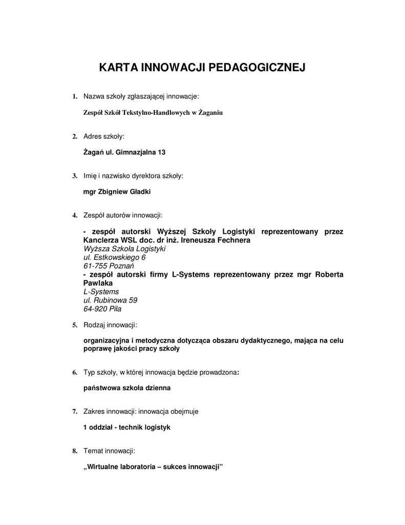 KARTA INNOWACJI PEDAGOGICZNEJ 1. Nazwa szkoły zgłaszającej innowacje: Zespół Szkół Tekstylno-Handlowych w śaganiu 2. Adres szkoły: śagań ul. Gimnazjalna 13 3. Imię i nazwisko dyrektora szkoły: mgr Zbigniew Gładki 4. Zespół autorów innowacji: - zespół autorski WyŜszej Szkoły Logistyki reprezentowany przez Kanclerza WSL doc. dr inŜ. Ireneusza Fechnera WyŜsza Szkoła Logistyki ul. Estkowskiego 6 61-755 Poznań - zespół autorski firmy L-Systems reprezentowany przez mgr Roberta Pawlaka L-Systems ul. Rubinowa 59 64-920 Piła 5. Rodzaj innowacji: organizacyjna i metodyczna dotycząca obszaru dydaktycznego, mająca na celu poprawę jakości pracy szkoły 6. Typ szkoły, w której innowacja będzie prowadzona: państwowa szkoła dzienna 7. Zakres innowacji: innowacja obejmuje 1 oddział - technik logistyk 8. Temat innowacji: „Wirtualne laboratoria – sukces innowacji” 9. Czy wymagana jest zgoda organu prowadzącego: NIE, jest wymagana (poniewaŜ innowacja nie wymaga przyznania szkole dodatkowych środków budŜetowych) 10. Czas trwania innowacji: styczeń – czerwiec 2011 11. Czy planuje się kontynuowanie innowacji (np. powtarzana w kolejnych oddziałach): TAK OPIS INNOWACJI PEDAGOGICZNEJ Typ i nazwa szkoły Zespół Szkół Tekstylno-Handlowych lub śaganiu placówki oraz ul. Gimnazjalna 13 adres 68 – 100 śagań Oddział w III klasa ( technik logistyk ) którym będzie realizowana innowacja w DANE O INNOWACJI PEDAGOGICZNEJ Nazwa innowacji Imię i nazwisko zespołu autorskiego „Wirtualne laboratoria – sukces innowacji” - zespół autorski WyŜszej Szkoły Logistyki reprezentowany przez Kanclerza WSL doc. dr inŜ. Ireneusza Fechnera WyŜsza Szkoła Logistyki ul. Estkowskiego 6 61-755 Poznań - zespół autorski firmy L-Systems reprezentowany przez mgr Roberta Pawlaka L-Systems ul. Rubinowa 59 64-920 Piła Imię i nazwisko osoby wdraŜającej innowację Czas trwania innowacji: • data rozpoczęcia • data zakończenia mgr Krystyna Fic-Obszańska, nauczycielka w ZSTH Styczeń 2011 Czerwiec 2011 RODZAJ INNOWACJI PEDAGOGICZNEJ programowa dotyczy obszaru dydaktycznego - X organizacyjna dotyczy obszaru wychowawczego obejmuje wybrane zajęcia edukacyjne X metodyczna X mieszana - obejmuje jeden przedmiot nauczania obejmuje jeden oddział lub grupę X obejmuje więcej oddziałów / grup dotyczy obszaru opiekuńczego dotyczy obszaru „mieszanego” obejmuje wszystkie edukacyjne obejmuje więcej nauczania - obejmuję całą szkołę lub placówkę - zajęcia X przedmiotów - - - KOSZT INNOWACJI PEDAGOGICZNEJ I ŹRÓDŁA JEJ FINANSOWANIA Czy wdroŜenie innowacji pedagogicznej wymaga nakładu dodatkowych środków finansowych ? TAK NIE X WYMAGANIA FORMALNE Spełnienie wymagań § 4 rozporządzenia MENiS z dnia 9 kwietnia 2002r. w sprawie warunków prowadzenia działalności innowacyjnej przez publiczne szkoły i placówki TAK NIE (Dz. U. z 2002r. nr 56, poz. 506), w tym uzyskanie: - Zgody nauczycieli, którzy będą uczestniczyć w innowacji pedagogicznej. X - Pisemnej zespołu autorskiego innowacji na prowadzenie innowacji pedagogicznej w szkole. - Opinii rady szkoły/rady pedagogicznej w sprawie planowanej innowacji pedagogicznej. - Podjęcie uchwały rady pedagogicznej zatwierdzenia innowacji pedagogicznej. Data podjęcia uchwały pedagogicznej.................................. w X X sprawie TAK rady X - Uzyskanie pisemnej zgody organu prowadzącego szkołę/placówkę na finansowanie planowanych działań innowacyjnych, o czym mowa w § 2 ust. 3 rozporządzenia MENiS z dnia 9 kwietnia 2002r. w sprawie warunków prowadzenia działalności innowacyjnej przez publiczne szkoły i placówki. TAK NIE NIE NIE DOTYCZY X SZCZEGÓŁOWY OPIS INNOWACJI PEDAGOGICZNEJ 1. Uzasadnienie potrzeby innowacji: 2.Cele innowacji Poprawa jakości pracy szkoły poprzez stworzenie modelu innowacyjnej metody kształcenia. Zwiększenie dostępności do zaawansowanych technologii informacyjno – komunikacyjnych (TKI) w prowadzeniu laboratorium logistyczno-spedycyjnego i magazynowego w klasach technikum logistycznego w roku szkolnym 2010/2011 (w okresie od stycznia do czerwca 2011 roku). Projekt odpowiada na problem: niewystarczającego przygotowania praktycznego uczniów do pracy w zawodzie lub kontynuacji nauki na najbardziej wymagających studiach, braku środków na samodzielne stworzenie przez szkołę laboratoriów przedmiotów zawodowych i braku skutecznych i atrakcyjnych narzędzi do prowadzenia zajęć praktycznych. Zapewnia równe szanse poznania nowych technologii w szkołach połoŜonych przede wszystkim na terenie powiatów o wysokim poziomie bezrobocia wśród osób z wykształceniem średnim, o niskich dochodach budŜetu powiatu na jednego mieszkańca z niskim udziałem osób z wykształceniem wyŜszym. Dostęp do nowych technologii w zawodzie technik logistyk ma wpływ na zainteresowanie szkołą uczniów szkół gimnazjalnych. Głównymi celami innowacji jest: pedagogicznej: 3. Spodziewane efekty o wypracowanie nowego sposobu korzystania - „wirtualnego”- z uŜytkowych (drogich dla szkół) programów do: laboratorium logistyczno – spedycyjnego i laboratorium magazynowego umoŜliwiającego realizację podstawy programowej dla tych przedmiotów, określonych w ramowym planie nauczania dla technika logistyka, o konieczność opracowania i pilotaŜowego wdroŜenia innowacyjnych programów dotyczących kształcenia w zawodzie technik logistyk, które poprawią jakość kształcenia, o praktycznego przygotowania uczniów do wykonywania zawodu technik logistyk. Efektami innowacji jest przygotowanie uczniów do zastosowania nowoczesnych technologii informacyjno – komunikacyjnych (TKI) w pracy logistyka oraz: o nabycie umiejętności posługiwania się najnowszymi technologiami zarządzania magazynem i zapasami, które znajdą zastosowanie na egzaminie zawodowym w części praktycznej o poprawa wyników z egzaminów zawodowych o przygotowanie praktyczne kadr do zawodu lub kon