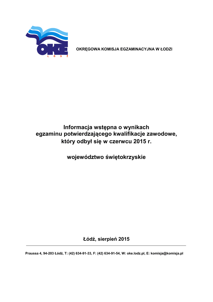 OKRĘGOWA KOMISJA EGZAMINACYJNA W ŁODZI Informacja wstępna o wynikach egzaminu potwierdzającego kwalifikacje zawodowe, który odbył się w czerwcu 2015 r. województwo świętokrzyskie Łódź, sierpień 2015 Praussa 4, 94-203 Łódź, T: (42) 634-91-33, F: (42) 634-91-54, W: oke.lodz.pl, E: [email protected] województwo świętokrzyskie Informacja wstępna o wynikach egzaminu potwierdzającego kwalifikacje zawodowe - czerwiec 2015 r. W czerwcu 2015 r. odbył się egzamin potwierdzający kwalifikacje zawodowe dla absolwentów szkół zawodowych, w których zajęcia dydaktyczno-wychowawcze kończą się w czerwcu. Egzamin odbył się w terminach Etap pisemny – 15 czerwca 2015 roku dla absolwentów wszystkich typów szkół prowadzących kształcenie zawodowe. Etap praktyczny od 16 do 19 stycznia 2015 roku dla absolwentów techników i szkół policealnych, od 30 czerwca do 17 lipca 2015 roku dla absolwentów zasadniczych szkół zawodowych. Egzamin przeprowadzono w 16 zawodach – dla absolwentów zasadniczej szkoły zawodowej oraz w 53 zawodach – dla absolwentów techników i szkół policealnych. W województwie świętokrzyskim do egzaminu zawodowego przystąpiło łącznie 4 601 absolwentów (w tym 64 absolwentów zasadniczej szkoły zawodowej i 4 537 absolwentów techników i szkół policealnych). Do obu etapów egzaminu przystąpiło 4 047 absolwentów (w tym 11 absolwentów zasadniczej szkoły zawodowej w 6 zawodach i 4 036 absolwentów techników i szkół policealnych w 47 zawodach). Dyplom w województwie świętokrzyskim otrzymało 61,87% absolwentów spośród wszystkich, którzy przystąpili do obu etapów egzaminu. W zasadniczej szkole zawodowej zdawalność wyniosła 63,64% natomiast wśród absolwentów techników i szkół policealnych 61,87%. Strona 2 z 7 województwo świętokrzyskie Wyniki egzaminu potwierdzającego kwalifikacje zawodowe w 6 zawodach w zasadniczej szkole zawodowej przystąpiło dyplom otrzymało 11* 7* (63,64%)* w 47 zawodach w technikach i szkołach policealnych przystąpiło dyplom otrzymało 4 036* 2 497* (61,87%)* DYPLOMY otrzymało: 2 504* (61,87%)* * obejmuje tylko absolwentów, którzy mają wyniki z obu etapów egzaminu (przystąpili do obu etapów egzaminu) Wyniki etapu pisemnego i praktycznego egzaminu zawodowego Okręgowa Komisja Egzaminacyjna w Łodzi ustaliła po elektronicznym odczytaniu wypełnionej odpowiednio karty odpowiedzi, karty obserwacji lub karty oceny na podstawie liczby punktów uzyskanych przez zdających. Zdający zdał egzamin zawodowy, jeżeli uzyskał: 1) z etapu pisemnego: z części pierwszej – co najmniej 50% i z części drugiej – co najmniej 30% punktów możliwych do uzyskania oraz 1) z etapu praktycznego – co najmniej 75% punktów możliwych do uzyskania. Strona 3 z 7 województwo świętokrzyskie Zasadnicza Szkoła Zawodowa W województwie świętokrzyskim do egzaminu w 18 zawodach zgłoszono 99 absolwentów. Do egzaminu przystąpiło (przynajmniej do jednego etapu) 64 absolwentów, tj. 64,65% absolwentów zgłoszonych do egzaminu. Przystąpiło Zdało Pisemny 56 34 (60,71%) Praktyczny 19 16 (84,21%) Dyplom otrzymało* 11 7 (63,64%) Etap egzaminu * obejmuje tylko absolwentów, którzy mają wyniki z obu etapów egzaminu (przystąpili do obu etapów egzaminu) Etap pisemny egzaminu zdało 60,71% absolwentów, a etap praktyczny – 84,21%. Dyplom potwierdzający kwalifikacje zawodowe otrzymało 63,64% absolwentów, którzy przystąpili do obu etapów egzaminu. Liczba i procent absolwentów zasadniczej szkoły zawodowej, którzy otrzymali dyplom potwierdzający kwalifikacje zawodowe w podziale na zawody* Dyplom otrzymało Lp. Nazwa zawodu Przystąpiło Liczba absolwentów % absolwentów 1 Kucharz małej gastronomii 1 1 100% 2 Fryzjer 1 1 100% 3 Murarz 2 2 100% 4 Technolog robót wykończeniowych w budownictwie 5 2 40% 5 Ślusarz 1 0 0% 6 Elektromechanik pojazdów samochodowych 1 1 100% * obejmuje tylko absolwentów, którzy mają wyniki z obu etapów egzaminu (przystąpili do obu etapów egzaminu) Strona 4 z 7 województwo świętokrzyskie Technikum i Szkoła Policealna W województwie świętokrzyskim do egzaminu w 54 zawodach zgłoszono 5 260 absolwentów techników i szkół policealnych. Do egzaminu przystąpiło (przynajmniej do jednego etapu) 4 537 absolwentów, tj. 86,3% absolwentów zgłoszonych do egzaminu. Przystąpiło Zdało Pisemny 4 265 3 449 (80,87%) Praktyczny 4 308 2 931 (68,04%) Dyplom otrzymało* 4 036 2 497 (61,87%) Etap egzaminu * obejmuje tylko absolwentów, którzy mają wyniki z obu etapów egzaminu (przystąpili do obu etapów egzaminu) Etap pisemny egzaminu zdało 80,87% absolwentów, a etap praktyczny – 68,04%. Dyplom potwierdzający kwalifikacje zawodowe otrzymało 61,87% absolwentów, którzy przystąpili do obu etapów egzaminu. W 32 zawodach (68%) zdawalność egzaminu wynosi 50 i więcej procent. Liczba i procent absolwentów technikum i szkoły policealnej, którzy otrzymali dyplom potwierdzający kwalifikacje zawodowe w podziale na zawody* Dyplom otrzymało Lp. Przystąpiło Nazwa zawodu 1 Technik analityk 2 Technik budownictwa 3 Liczba % absolwentów absolwentów 24 14 58% 321 204 64% Technik dróg i mostów kolejowych 18 2 11% 4 Technik elektronik 61 32 52% 5 Technik elektryk 67 23 34% 6 Technik geodeta 92 70 76% 7 Technik inżynierii środowiska i melioracji 9 1 11% 8 Technik mechanik 286 193 67% 9 Technik mechanizacji rolnictwa 65 43 66% 10 Technik ochrony środowiska 38 21 55% 11 Technik technologii drewna 9 3 33% Strona 5 z 7 województwo świętokrzyskie Dyplom otrzymało Lp. Przystąpiło Nazwa zawodu 12 Technik technologii odzieży 13 Technik telekomunikacji 14 Liczba % absolwentów absolwentów 10 6 60% 4 2 50% Technik urządzeń sanitarnych 11 2 18% 15 Technik drogownictwa 46 30 65% 16 Technik mechatronik 102 17 17% 17 Technik cyfrowych procesów graficznych 7 5 71% 18 Technik pojazdów samochodowych 125 54 43% 19 Technik energetyk 30 2 7% 20 Technik urzą