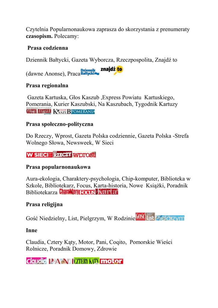 Czytelnia Popularnonaukowa zaprasza do skorzystania z prenumeraty czasopism. Polecamy: Prasa codzienna Dziennik Bałtycki, Gazeta Wyborcza, Rzeczpospolita, Znajdź to (dawne Anonse), Praca Prasa regionalna Gazeta Kartuska, Głos Kaszub ,Express Powiatu Kartuskiego, Pomerania, Kurier Kaszubski, Na Kaszubach, Tygodnik Kartuzy Prasa społeczno-polityczna Do Rzeczy, Wprost, Gazeta Polska codziennie, Gazeta Polska -Strefa Wolnego Słowa, Newsweek, W Sieci Prasa popularnonaukowa Aura-ekologia, Charaktery-psychologia, Chip-komputer, Biblioteka w Szkole, Bibliotekarz, Focus, Karta-historia, Nowe Książki, Poradnik Bibliotekarza Prasa religijna Gość Niedzielny, List, Pielgrzym, W Rodzinie Inne Claudia, Cztery Kąty, Motor, Pani, Coqito, Pomorskie Wieści Rolnicze, Poradnik Domowy, Zdrowie
