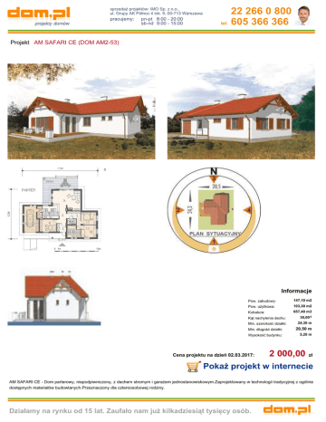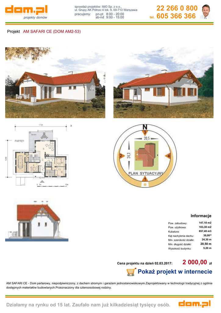 sprzedaż projektów: IMO Sp. z o.o., ul. Grupy AK Północ 4 lok. 9, 00-713 Warszawa pracujemy: pn-pt 8:00 - 20:00 sb-nd 9:00 - 15:00 22 266 0 800 tel. 605 366 366 Projekt AM SAFARI CE (DOM AM2-53) 3 Informacje Pow. zabudowy: 147,10 m2 Pow. użytkowa: 103,30 m2 Kubatura: 657,40 m3 Kąt nachylenia dachu: 30,00 0 Min. szerokość działki: 24,30 m Min. długość działki: 20,50 m Wysokość budynku: 5,20 m Cena projektu na dzień 02.03.2017: 2 000,00 zł Pokaż projekt w internecie AM SAFARI CE - Dom parterowy, niepodpiwniczony, z dachem stromym i garażem jednostanowiskowym.Zaprojektowany w technologii tradycyjnej z ogólnie dostępnych materiałów budowlanych.Przeznaczony dla czteroosobowej rodziny. Działamy na rynku od 15 lat. Zaufało nam już kilkadziesiąt tysięcy osób.
