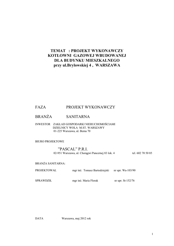 TEMAT : PROJEKT WYKONAWCZY KOTŁOWNI GAZOWEJ WBUDOWANEJ DLA BUDYNKU MIESZKALNEGO przy ul.Brylowskiej 4 , WARSZAWA FAZA PROJEKT WYKONAWCZY BRANŻA SANITARNA INWESTOR ZAKŁAD GOSPODARKI NIERUCHOMOŚCIAMI DZIELNICY WOLA M.ST. WARSZAWY 01-225 Warszawa, ul. Bema 70 BIURO PROJEKTOWE ”PASCAL” P.R.I. 02-951 Warszawa, ul. Chorągwi Pancernej 83 lok. 4 tel. 602 70 50 85 BRANŻA SANITARNA: PROJEKTOWAŁ mgr inż. Tomasz Bartodziejski nr upr. Wa-103/90 SPRAWDZIŁ mgr inż. Maria Florak nr upr. St-152/76 DATA Warszawa, maj 2012 rok 1 SPIS TREŚCI I. OPIS TECHNICZNY 1. Dane ogólne 2. Opis pracy kotłowni. 3 Przewody powietrzno-spalinowe 4.Przewody i armatura 5. Zabezpieczenie antykorozyjne,izolacja 6.Wentylacja kotłowni. 7.Prace budowlane do wykonania. 8.Instalacja wod-kan. 9. Dobór urządzeń 10. Specyfikacja 11.Wykaz przewodów spalinowych system JEREMIAS 12.Wytyczne p.poż. 13. Wytyczne. RYSUNKI 1. 2. 3. 4. Rzut kotłowni Rzut kotłowni –rozmieszczenie urządzeń Przekrój Schemat ideowy rys nr. 1 rys nr. 2 rys.nr. 3 rys.nr. 4 2 OPIS TECHNICZNY 1. Dane ogólne 1.1. Podstawa i zakres opracowania. Projekt techniczny kotłowni wbudowanej opracowano na podstawie: -zlecenia inwestora -inwentaryzacja architektoniczno-budowlana -P.T. inst. C.O., CW ,cyrkulacji -obowiązujące normy i przepisy. -uzgodnienia miedzy branżowe. Opracowanie obejmuje technologię kotłowni gazowej ,wbudowanej dla budynku mieszkalnego przy ul Brylowskiej 4 w Warszawie. Budynek istniejący, Budynek zostanie doposażony w instalację centralnego ogrzewania , instalację ciepłej wody i cyrkulacji. Jako źródło ciepła przewidziano kotłownie gazową wbudowaną zlokalizowaną w adaptowanym pomieszczeniu na poziomie piwnic. Projektowana kotłownia będzie opalana gazem ziemnym. W kotłowni przygotowywany będzie czynnik grzejny dla potrzeb instalacji centralnego ogrzewania oraz ciepła woda użytkowa . Jako kocioł przewidziano kocioł typ LOGANO G 234 o mocy cieplnej 60 kW. Kocioł jest kotłem z palnikiem atmosferycznym. 1.2. Charakterystyka obiektu 1.3. Opis projektowanego obiektu. Budynek mieszkalny przy ul Brylowskiej 4 w Warszawie jest budynkiem istniejącym. Budynek posiada cztery kondygnacje nadziemne. Budynek jest budynkiem podpiwniczonym. Na kondygnacjach nadziemnych zlokalizowane są lokale mieszkalne na poziomie piwnic zlokalizowane są piwnice lokatorskie. Budynek został poddany termorenowacji. W ramach modernizacji przewidziano doposażenie budynku w instalację centralnego ogrzewania oraz w instalację ciepłej wody i cyrkulacji. 2. Opis pracy kotłowni. W kotłowni przygotowywany będzie czynnik grzejny dla potrzeb instalacji centralnego ogrzewania oraz ciepła woda użytkowa . Jako kocioł centralnego przewidziano kocioł typ LOGANO G 234 o mocy 60 kW (dostawa Buderus). Kocioł wyposażony fabrycznie w palniki typ dostarczane wraz ze ścieżką gazową (dostawa Buderus) . Kocioł sterowane przez moduły sterujące typ LOGOMATIC R2107M wyposażony w moduł AW50 i moduł FM 241 . Ciepła woda użytkowa przygotowywana w pojemnościowym podgrzewaczu ciepłej wody- typ LOGALUX SU o pojemności 500dcm3. 3 Kocioł przygotowywać będzie czynnik grzejny dla potrzeb instalacji centralnego ogrzewania oraz ciepłej wody użytkowej. Kotłownia pracuje w priorytecie ciepłej wody użytkowej. Parametry wody instalacyjnej centralnego ogrzewania 70/50oC, ciepła woda użytkowa -55oC. Obieg grzewczy centralnego ogrzewania wyposażony jest w pompę obiegową oraz w zawór trójdrogowy regulujący parametry wody instalacyjnej .Parametry wody instalacyjne sterowane temperaturą zewnętrzną mierzoną czujnikiem dostarczanym wraz z kotłami. Instalacja zabezpieczona przed nadmiernym wzrostem ciśnienia poprzez zawór bezpieczeństwa montowany na kotle oraz poprzez naczynie wzbiorcze systemu zamkniętego. Pomieszczenie kotłowni doposażone jest w inst. wod - kan oraz wentylacji grawitacyjnej. Spaliny z kotła odprowadzone będą kominami ponad dach budynku. Ze względu na trwałość instalacji do uzupełniania zładu w kotłowni jako opcję proponuje się montaż stacji uzdatniania wody . Woda do napełnienia instalacji oraz do uzupełnienia ubytków ma istotne znaczenie dla długowieczności przewodów. Głównymi parametrami powodującymi korozyjność są : - odczyn PH - zawartość tlenu - zawartość jonów korozyjnych SO4-2 i CLWażne jest aby ograniczyć ubytki wody z instalacji do 5% objętości zładu. Woda ma tendencje do samoistnego odtlenienia i alkalizacji w pierwszej fazie pracy , dlatego ważna jest możliwie największa hermetyzacja zładu. Zgodnie z PN-93/C-04607 wskaźniki jakości wody do napełnienia instalacji c.o. powinny wynosić: - zawartość jonów korozyjnych < 150 E( CL + SO4) - odczyn PH 8 - 9.5 - zawartość tlenu < 0,1 mg/l 02. Uzupełnienie zładów instalacji przewidziano ze stacji uzdatniania wody typ LOGANAICE 30 -(dostawa Buderus) 3 Przewody powietrzno-spalinowe Kocioł będzie wyposażony w przewód dla odprowadzenia spalin Odprowadzenie spalin z kotła przewidziano poprzez zastosowanie czopuch jednopłaszczowy (w pom.kotłowni). Na zewnątrz budynku przewidziano montaż komina dwupłaszczowego odprowadzającego spaliny nad dach budynku. Komin prowadzony po ścianie budynku. Zastosowano kanały spalinowe prod. JEREMIAS Sp z o.o. 62-200 Gniezno ul.Kokoszki 6 tel 61 428 46 20 (wg oferty). Zestawienie kształtek wg oferty załączonej do projektu. 4.Przewody i armatura Przewody w kotłowni instalacji C.O. na odcinku od kotła do rozdzielaczy oraz zasilenie wężownicy bojlera C.W.U. wykonać z rur stalowych bez szwu posiadających atest ZETOM wg. PN-80/H-74219. 4 Przewody c.w.u. i cyrkulacji w obrębie kotłowni wykonać z wkładką STABI PN 20. Przewody z.w. wykonać z przewodów AQUATHERM PN 20. Przewody łączyć zgodnie z technologia rur. Na przewodach montować zawory kulowe z przyłączem przyłączem gwintowanym PN 9, T 100oC. W najwyższych punktach instalacji na przewodach odpowietr