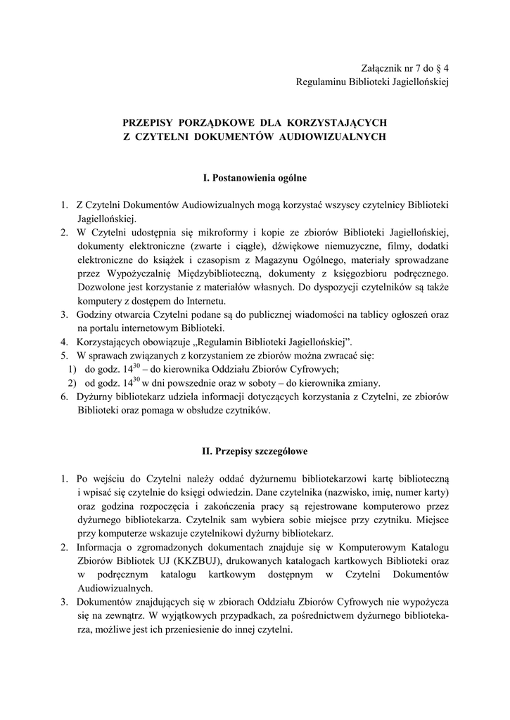 Załącznik nr 7 do § 4 Regulaminu Biblioteki Jagiellońskiej PRZEPISY PORZĄDKOWE DLA KORZYSTAJĄCYCH Z CZYTELNI DOKUMENTÓW AUDIOWIZUALNYCH I. Postanowienia ogólne 1. Z Czytelni Dokumentów Audiowizualnych mogą korzystać wszyscy czytelnicy Biblioteki Jagiellońskiej. 2. W Czytelni udostępnia się mikroformy i kopie ze zbiorów Biblioteki Jagiellońskiej, dokumenty elektroniczne (zwarte i ciągłe), dźwiękowe niemuzyczne, filmy, dodatki elektroniczne do książek i czasopism z Magazynu Ogólnego, materiały sprowadzane przez Wypożyczalnię Międzybiblioteczną, dokumenty z księgozbioru podręcznego. Dozwolone jest korzystanie z materiałów własnych. Do dyspozycji czytelników są także komputery z dostępem do Internetu. 3. Godziny otwarcia Czytelni podane są do publicznej wiadomości na tablicy ogłoszeń oraz na portalu internetowym Biblioteki. 4. Korzystających obowiązuje „Regulamin Biblioteki Jagiellońskiej”. 5. W sprawach związanych z korzystaniem ze zbiorów można zwracać się: 1) do godz. 1430 – do kierownika Oddziału Zbiorów Cyfrowych; 2) od godz. 1430 w dni powszednie oraz w soboty – do kierownika zmiany. 6. Dyżurny bibliotekarz udziela informacji dotyczących korzystania z Czytelni, ze zbiorów Biblioteki oraz pomaga w obsłudze czytników. II. Przepisy szczegółowe 1. Po wejściu do Czytelni należy oddać dyżurnemu bibliotekarzowi kartę biblioteczną i wpisać się czytelnie do księgi odwiedzin. Dane czytelnika (nazwisko, imię, numer karty) oraz godzina rozpoczęcia i zakończenia pracy są rejestrowane komputerowo przez dyżurnego bibliotekarza. Czytelnik sam wybiera sobie miejsce przy czytniku. Miejsce przy komputerze wskazuje czytelnikowi dyżurny bibliotekarz. 2. Informacja o zgromadzonych dokumentach znajduje się w Komputerowym Katalogu Zbiorów Bibliotek UJ (KKZBUJ), drukowanych katalogach kartkowych Biblioteki oraz w podręcznym katalogu kartkowym dostępnym w Czytelni Dokumentów Audiowizualnych. 3. Dokumentów znajdujących się w zbiorach Oddziału Zbiorów Cyfrowych nie wypożycza się na zewnątrz. W wyjątkowych przypadkach, za pośrednictwem dyżurnego bibliotekarza, możliwe jest ich przeniesienie do innej czytelni. 4. Korzystający ze zbiorów Czytelni Dokumentów Audiowizualnych mają wolny dostęp do półek. 5. Na miejscu wyjętej z półki mikroformy zostawia się zakładkę podpisaną nazwiskiem czytelnika. Po skończonej pracy mikroformę odkłada się na półkę w miejsce zaznaczone zakładką. 6. Dokumenty znajdujące się w Magazynie Dokumentów Audiowizualnych lub przechowywane w innych pomieszczeniach podaje dyżurny bibliotekarz. Są one dostarczane w miarę możliwości na bieżąco. 7. W przypadku opuszczenia przez czytelnika stanowiska przy czytniku lub komputerze na dłużej niż 30 minut bez zgłoszenia dyżurnemu bibliotekarzowi, stanowisko może zostać udostępnione innemu użytkownikowi bez zabezpieczenia wyszukanych wcześniej materiałów. 8. Każdorazowo przed wyjściem z Czytelni należy wyłączyć czytnik. 9. Po zamówione egzemplarze z Wypożyczalni Międzybibliotecznej (WMB) należy zgłaszać się bezpośrednio do dyżurnego bibliotekarza. Dzieła wypożyczone przez WMB mają ściśle określony termin zwrotu, po upływie którego zostają odesłane do biblioteki wypożyczającej. 10. Czytelnicy ponoszą pełną odpowiedzialność za stan zachowania udostępnionych im zbiorów, komputerów, czytników oraz pozostałego sprzętu elektronicznego. Wszelkie uszkodzenia zbiorów lub nieprawidłowości w pracy komputerów i czytników należy niezwłocznie zgłaszać dyżurnemu bibliotekarzowi. 11. Dozwolone jest samodzielne fotografowanie m.in. własnym aparatem cyfrowym obrazów z czytnika oraz kopiowanie dokumentów elektronicznych z wyjątkiem programów komputerowych i baz danych. 12. Dyżurny bibliotekarz przyjmuje zamówienia na reprodukcje z mikroform i kopii cyfrowych. Formularz zamówienia wypełnia czytelnik. Aktualny "Cennik usług specjalnych Biblioteki Jagiellońskiej" znajduje się u dyżurnego bibliotekarza i na portalu internetowym Biblioteki. 13. Możliwe jest korzystanie przez czytelników z własnych komputerów osobistych. Szczegółowe zasady określone są w Załączniku nr 17 do Regulaminu. Studenci i pracownicy Uniwersytetu Jagiellońskiego mogą korzystać w Czytelni z Internetu bezprzewodowego, pod warunkiem posiadania aktywnego konta poczty elektronicznej w domenie uj.edu.pl