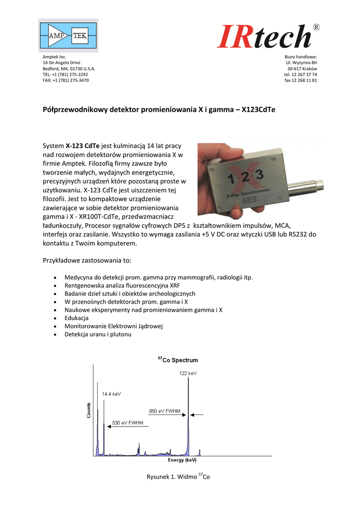 Amptek Inc. 14 De Angelo Drive Bedford, MA. 01730 U.S.A. TEL: +1 (781) 275-2242 FAX: +1 (781) 275-3470 Biuro handlowe: Ul. Wyżynna 8H 30-617 Kraków tel. 12 267 37 74 fax 12 268 11 81 Półprzewodnikowy detektor promieniowania X i gamma – X123CdTe System X-123 CdTe jest kulminacją 14 lat pracy nad rozwojem detektorów promieniowania X w firmie Amptek. Filozofią firmy zawsze było tworzenie małych, wydajnych energetycznie, precyzyjnych urządzeń które pozostaną proste w użytkowaniu. X-123 CdTe jest uiszczeniem tej filozofii. Jest to kompaktowe urządzenie zawierające w sobie detektor promieniowania gamma i X - XR100T-CdTe, przedwzmacniacz ładunkoczuły, Procesor sygnałów cyfrowych DP5 z kształtownikiem impulsów, MCA, interfejs oraz zasilanie. Wszystko to wymaga zasilania +5 V DC oraz wtyczki USB lub RS232 do kontaktu z Twoim komputerem. Przykładowe zastosowania to: Medycyna do detekcji prom. gamma przy mammografii, radiologii itp. Rentgenowska analiza fluorescencyjna XRF Badanie dzieł sztuki i obiektów archeologicznych W przenośnych detektorach prom. gamma i X Naukowe eksperymenty nad promieniowaniem gamma i X Edukacja Monitorowanie Elektrowni Jądrowej Detekcja uranu i plutonu Rysunek 1. Widmo 57Co Amptek Inc. 14 De Angelo Drive Bedford, MA. 01730 U.S.A. TEL: +1 (781) 275-2242 FAX: +1 (781) 275-3470 Biuro handlowe: Ul. Wyżynna 8H 30-617 Kraków tel. 12 267 37 74 fax 12 268 11 81 Specyfikacja X-123 CdTe Właściwości systemu Rozdzielczość energetyczna dla 122 keV, 57Co 9 mm2: <1.2 keV FWHM, typowo 25 mm2: <1.5 keV FWHM, typowo Zakres energii 5 to 150 keV. Może być używany dla wyższych energii z mniejszą wydajnością. Maksymalna liczba zliczeń Zależy od czasu narastania. Rekomendowane maksyma dla 50% czasu martwego z włączonym odrzucanie nakładania się sygnałów widać poniżej. Czas narastania P5 (µs) 2.4 6.4 25.6 Czas kształtowania (µs) 1.0 2.9 11.6 Maks. rekomendowane 1.2 x 105 4.6 x 104 1.2 x 104 Detektor i przedwzmacniacz Typ detektora CdTe – dostępne również Si-PIN i SDD Powierzchnia detektora 9 mm2 lub 25 mm2 Grubość detektora 1 mm, Grubość okienka Be 4 mil (100 µm) Chłodzenie termoelektryczne Dwustopniowe Amptek Inc. 14 De Angelo Drive Bedford, MA. 01730 U.S.A. TEL: +1 (781) 275-2242 FAX: +1 (781) 275-3470 Typ przedwzmacniacza Biuro handlowe: Ul. Wyżynna 8H 30-617 Kraków tel. 12 267 37 74 fax 12 268 11 81 Zaprojektowany przez Amptek Procesor impulsów Wzmocnienie Kombinacje wzmocnienia zgrubnego i dokładnego tworzą przedział od 0.84 do 127.5. Wzmocnienie zgrubne Do wyboru w oprogramowaniu 1.12 do 102 w 16 log krokach. 1.12, 2.49, 3.78, 5.26, 6.56, 8.39, 10.10, 11.31, 14.56, 17.77, 22.42, 30.83, 38.18, 47.47, 66.26, 102.0 Wzmocnienie dokładne Do wyboru w oprogramowaniu od, 0.75 do 1.25, 10 bit rozdzielczość. Pełna skala 1000 mV impuls wekściowy @ X1 wzmocnienie Stabilność wzmocnienia <20 ppm/°C (typowo) Kształt impuslu Trapezoidalny Czas narastania 24 czasy możliwe do wyboru w oprogramowaniu od 0.8 do 102 µs, w odniesieniu do semi-gaussowskiego czasu narastania od 0.4 do 45 µs. Czas martwy Całkowicy czas martwy wynosi 1,05 czasu narastania. Bez czasu konwersji. MCA Liczba kanałów Do wyboru w oprogramowaniu: 8k, 4k, 2k, 1k, 0.5k lub 0.25k Ustawienia Czas, całkowita liczba zliczeń, zliczenia w ROI, zliczenia w pojedynczym kanale Amptek Inc. 14 De Angelo Drive Bedford, MA. 01730 U.S.A. TEL: +1 (781) 275-2242 FAX: +1 (781) 275-3470 Biuro handlowe: Ul. Wyżynna 8H 30-617 Kraków tel. 12 267 37 74 fax 12 268 11 81 Komunikacja USB 2.0 full speed (12 Mbps) Szeregowo Standard RS232 przy 115.2k lub 57.6k baud Ethernet 10base-T Zasilanie Wejście nominalne +5 VDC przy 500 mA (2.5 W) (typowo). Prąd silnie zależy od ΔT detektora. Wacha się w granicach od 300 do 800 mA przy 5 VDC. Adapter AC w zestawie. Zakres wejściowy 4 V do 6 V (300 do 200 mA, 500 mA max) Źródło wysokiego napięcia Wewnętrzny multiplikator ustawiony na 500 V, ustawialne do 750 V Zasilanie chłodziarki Kontroler zamkniętej pętli z Delta_Tmax = 85 °C Ogólne Temperatura pracy -20 °C do +50 °C Gwarancja 1 rok Typowy czas życia 5 do 10 lat w zależności od użytkowania Przechowywanie i transport Długie przechowywanie: 10+ lat w suchym otoczeniu Przechowywanie i dostawa: -20°C do +50°C, 10 do 90% wilgotności bez kondensacji Zgodność RoHS Compliant Amptek Inc. 14 De Angelo Drive Bedford, MA. 01730 U.S.A. TEL: +1 (781) 275-2242 FAX: +1 (781) 275-3470 Biuro handlowe: Ul. Wyżynna 8H 30-617 Kraków tel. 12 267 37 74 fax 12 268 11 81 TUV Certification Certificate #: CU 72101153 01 Tested to: UL 61010-1: 2009 R10.08 CAN/CSA-C22.2 61010-1-04+GI1 Wtyczki USB Standard USB Mini 1.1 jack RS232 Standard 2.5 mm stereo audio jack. Tip Transmit To PC Receive DB9 pin 2 (DB25 pin 3) Ring Receive Sleeve Ground To PC Transmit DB9 pin 3 (DB25 pin 2) To PC Ground DB9 pin 5 (DB25 pin 7) Ethernet Standard Ethernet connector (RJ-45) Zasilanie Hirose MQ172-3PA(55), Mating plug: MQ172-3SA-CV Oprogramowanie DPPMCA X-123CdTe może być kontrolowany przez oprogramowanie Amptek DPPMCA. Pozwala ono na całkowitą kontrolę i konfigurację detektora oraz na zapisywanie i wyświetlanie otrzymywanych wartości. Pozwala na obsługę ROI, kalibracji, wyszukiwania pików i tym podobne. DPPMCA zawiera interfejs XRF-FP do ilościowej analizy prom. X. Działa pod Windows XP PRO SP3 lub późniejszymi. SDK X-123SDD posiada darmowe oprogramowanie Software Developer's Kit (SDK). Użytkownik sam może pisać podstawowy kod kontrolujący X-123SDD lub rozbudowywać je w większy system. Amptek Inc. 14 De Angelo Drive Bedford, MA. 01730 U.S.A. TEL: +1 (781) 275-2242 FAX: +1 (781) 275-3470 VB Demonstration Software Biuro handlowe: Ul. Wyżynna 8H 30-617 Kraków tel. 12 267 37 74 fax 12 268 11 81 VB demonstration software działa na komputerze osobistym i pozwala użytkownikowi na ustawienia parametrów detektora, rozpoczynanie i kończenie akwizycji i zapisywanie danych. Dostarczany je