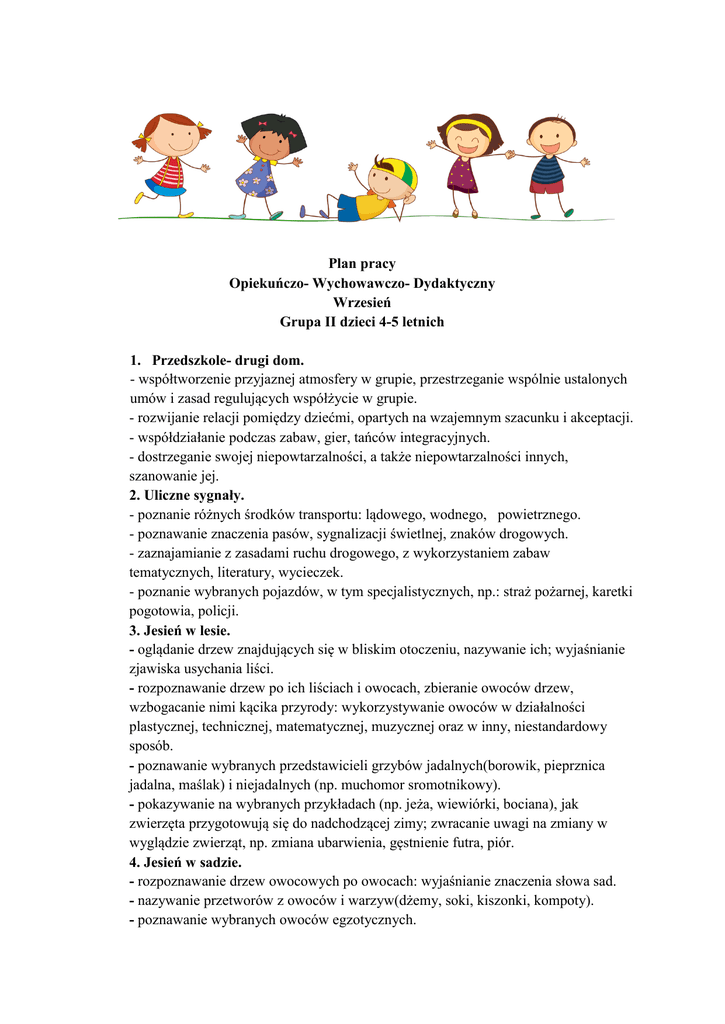 Plan pracy Opiekuńczo- Wychowawczo- Dydaktyczny Wrzesień Grupa II dzieci 4-5 letnich 1. Przedszkole- drugi dom. - współtworzenie przyjaznej atmosfery w grupie, przestrzeganie wspólnie ustalonych umów i zasad regulujących współżycie w grupie. - rozwijanie relacji pomiędzy dziećmi, opartych na wzajemnym szacunku i akceptacji. - współdziałanie podczas zabaw, gier, tańców integracyjnych. - dostrzeganie swojej niepowtarzalności, a także niepowtarzalności innych, szanowanie jej. 2. Uliczne sygnały. - poznanie różnych środków transportu: lądowego, wodnego, powietrznego. - poznawanie znaczenia pasów, sygnalizacji świetlnej, znaków drogowych. - zaznajamianie z zasadami ruchu drogowego, z wykorzystaniem zabaw tematycznych, literatury, wycieczek. - poznanie wybranych pojazdów, w tym specjalistycznych, np.: straż pożarnej, karetki pogotowia, policji. 3. Jesień w lesie. - oglądanie drzew znajdujących się w bliskim otoczeniu, nazywanie ich; wyjaśnianie zjawiska usychania liści. - rozpoznawanie drzew po ich liściach i owocach, zbieranie owoców drzew, wzbogacanie nimi kącika przyrody: wykorzystywanie owoców w działalności plastycznej, technicznej, matematycznej, muzycznej oraz w inny, niestandardowy sposób. - poznawanie wybranych przedstawicieli grzybów jadalnych(borowik, pieprznica jadalna, maślak) i niejadalnych (np. muchomor sromotnikowy). - pokazywanie na wybranych przykładach (np. jeża, wiewiórki, bociana), jak zwierzęta przygotowują się do nadchodzącej zimy; zwracanie uwagi na zmiany w wyglądzie zwierząt, np. zmiana ubarwienia, gęstnienie futra, piór. 4. Jesień w sadzie. - rozpoznawanie drzew owocowych po owocach: wyjaśnianie znaczenia słowa sad. - nazywanie przetworów z owoców i warzyw(dżemy, soki, kiszonki, kompoty). - poznawanie wybranych owoców egzotycznych. Przedszkole- drugi dom. 1. Rozwijanie aktywności językowej. Poznajemy przedszkole- rozmowa kierowana. Słuchanie opowiadania H. Bechlerowej „Wesołe zabawy”. Rozwiązywanie zagadek słownych- „Nasze zabawki”. Zabawa dydaktyczna- Jak dbamy o nasze zmysły? 2. Rozwijanie aktywności poznawczej. Zabawa matematyczna- Porządkujemy zabawki. 3. Rozwijanie aktywności artystycznej. Zabawa muzyczno- ruchowa przy piosence „Do przedszkola”. To jestem ja- rysowanie swojej postaci. Moja dłoń- wycinanie z papieru. Zabawa umuzykalniająca- poznajemy bębenek. 4. Rozwijanie aktywności społecznej. Opracowanie kodeksu grupowego. Zwiedzanie przedszkolnych pomieszczeń. 5. Rozwijanie aktywności ruchowej i zdrowotnej. Ćwiczenia poranne zestaw 1. Zabawa orientacyjno- porządkowa „Odszukaj swojej pary”. Ćwiczenia gimnastyczne wg przewodnika. Numery obszarów z podstawy programowej: 1.1, 1.2, 2.1, 3.1, 5.4, 9.1, 14.6. Uliczne sygnały. 1. Rozwijanie aktywności językowej. Teatrzyk sylwet na podstawie wiersza K. Wiśniewskiego „ Kolorowe znaki”. Zagadki zgadywanki- zajęcia dydaktyczne. 2. Rozwijanie aktywności poznawczej. Zajęcia matematyczne- „Szybko czy wolno? Zapoznanie z pojazdami specjalistycznymi- zagadki słuchowe. 3. Rozwijanie aktywności artystycznej. Znaki drogowe- kolorowanie wybranych znaków. Zabawa umuzykalniająca z piosenką Uwaga- czerwone światła. Przejście dla pieszych- wycinanka z papieru. 4. Rozwijanie aktywności społecznej. Rozmowa na temat wycieczki na pobliskie skrzyżowanie. 5. Rozwijanie aktywności ruchowej i zdrowotnej. Ćwiczenia poranne zestaw nr 2. Zabawa orientacyjno- porządkowa „Samochody z garażu”. Wycieczka na skrzyżowanie w Wiśniewie. Ćwiczenia gimnastyczne wg. przewodnika Numery obszarów z podstawy programowej: 1.1, 1.2, 3.1, 3.2, 5.4, 6.2, 9.1, 13.1, 14.1, 14.6. Jesień w lesie. 1. Rozwijanie aktywności językowej. Opowiadanie ruchowe połączone z ćwiczeniami artykulacyjnymi” Wędrujemy po lesie”. Słuchanie wiersza T. Fiutowskiej „Ranek na leśnej polanie”. Wyjście do GOK w Wiśniewie na przedstawienie teatralne. 2. Rozwijanie aktywności poznawczej. Zajęcia matematyczne- Liczymy dary jesieni. Poznawanie i i umiejętność nazywania liści jesiennych. 3. Rozwijanie aktywności artystycznej. Jesienne drzewo- malowanie farbami. Jesienna wystawa darów p. Jesieni. Zajęcia umuzykalniająca „ Leśna muzyka”. 4. Rozwijanie aktywności społecznej. Oglądanie jesiennych zdjęć wyciętych z gazety. 5. Rozwijanie aktywności ruchowej i zdrowotnej. Ćwiczenia poranne zestaw 3. Zabawa ruchowa usprawniająca duże grupy mięśniowe” Drzewa i wiatr”. Ćwiczenia gimnastyczne wg. przewodnika (metodą W. Sherborne). Wycieczka w poszukiwaniu pani Jesieni. Numery obszarów z podstawy programowej: 1.1, 3.1, 3.2, 5.3, 5.4, 8.1, 9.1, 12.1, 13.1, 14.1, 14.2. Jesień w sadzie. 1. Rozwijanie aktywności językowej. Rozmowa kierowana na temat- W sadzie. Zgadywanki dotykowe- rozpoznawanie owoców po dotyku. Czytanie bajki „Kubuś Puchatek” przez Wójta Gminy Wiśniew p. Krzysztofa Kryszczuka. 2. Rozwijanie aktywności poznawczej. Zabawa matematyczna- Liczymy owoce w zakresie 6. 3. Rozwijanie aktywności artystycznej. Owoce- wylepianki z plasteliny. Zabawa umuzykalniająca- poznajemy instrumenty perkusyjne. Wydzieranka z kolorowego papieru- Kochamy nasze owoce. 4. Rozwijanie aktywności społecznej. Rozmowa kierowana Jak zachowamy się w teatrze? 5. Rozwijanie aktywności ruchowej i zdrowotnej. Ćwiczenia poranne zestaw 4. Zabawa orientacyjno- porządkowa „Zbieramy owoce”. Ćwiczenia gimnastyczne wg. przewodnika (metodą W. Sherborne). Wyjazd do teatru CKiS w Siedlcach. Numery obszarów z podstawy programowej: 1.1, 3.1, 5.4, 12.1, 12.3, 14.1, 9.1, 14.2. Plan pracy Opiekuńczo- Wychowawczo- Dydaktyczny Wrzesień Grupa II dzieci 4-5 letnich mgr. Anna Gawinkowska