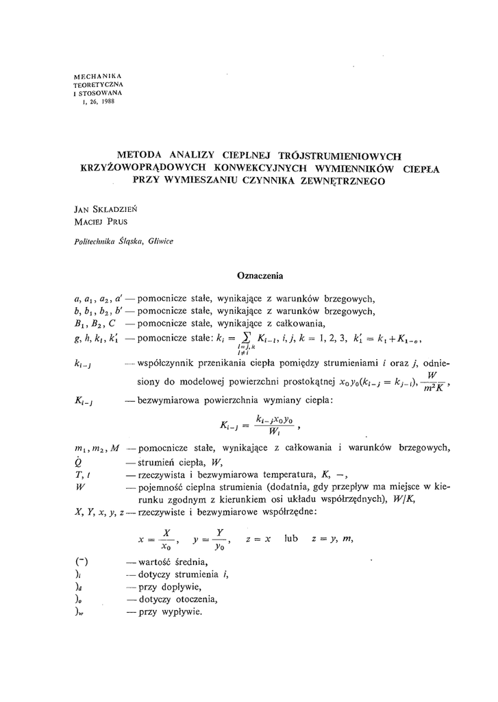 M E C H AN I K A TEORETYCZN A I STOSOWAN A 1, 26, 1988 M ETOD A AN ALIZY CIEPLN EJ TRÓJSTRU M IEN IOWYCH KRZYŻ OWOPRĄ D OWYC H KON WEKCYJN YCH WYMIEN N IKÓW CIEPŁ A PRZY WYMIESZAN IU CZYNNIKA ZEWN Ę TRZN EG O JAN SKŁ ADZIEŃ MACIEJ PRU S Politechnika Ś lą ska, Gliwice Oznaczenia a, a i , a2, a' — pom ocn icze stał e, wynikają b,bi,b2,b'— pom ocn icze stał e, wynikają B1}B2, C —p o m o c n i c z e stał e, wynikają g, h, ki, k[ —p o m o c n i c z e stał e: k t - £ ce z warun ków brzegowych, ce z warun ków brzegowych, ce z cał kowan ia, Ki_ u i,j, k - 1, 2, 3, k[ = fcl ź ft_j —wsp ó ł c zyn n ik przen ikan ia ciepł a pom ię dzy strum ien iam i i o raz j , odn ieW sion y d o m odelowej powierzchn i prostoką tn ej xoy0(ki- .j = fcj_i).—J- F> Kt_j —be zwym ia r o wa powierzchn ia wym ian y ciepł a: ml,m2,M —pom ocnicze stał e, wynikają c e z cał kowania i warunków brzegowych, Q T, t W —strum ień ciepł a, W, — rzeczywista i bezwym iarowa t em perat u ra, K, —, — pojem n ość ciepln a strum ienia ( dodatn ia, gdy przepł yw m a miejsce w kieru n ku zgo d n ym z kierun kiem osi u kł ad u współ rzę dn ych), WjK, X, Y, x, y, z — rzeczywiste i bezwym iarowe współ rzę dn e: X x = (~) )i )d ) 0 ) w Y , y= , —wa r t o ść ś redn ia, — dotyczy strum ien ia /, —p r z y dopł ywie, —d o t yc zy otoczenia, —p r z y wypł ywie. z = x lub z = y, m, J. SKŁADZIEŃ , M. PRUS 150 1. Wstę p Dwa warianty modeli trójstrumieniowych krzyż owoprą dowych wymienników ciepła przedstawiono na rys. 1. Modele te składają się z czterech równoległych prostoką tnych pł yt o wymiarach xoyo. Płyty ś rodkowe reprezentują powierzchnie wymiany ciepła, podczas gdy pł yty zewnę trzne w przypadku wymienników bez strat są adiabatyczne. Yfy 1, Model trójstrumieniowego krzyż owoprą doweg o wymiennika ciepł a; a) wariant I, b) wariant II Media robocze przepływają przez szczeliny, przy czym strumienie 2 i 3 są prostopadłe do strumienia czynnika 1. Czynnik ten wymienia ciepło tylko z jednym z dwóch strumieni równoległ ych (wariant I) lub z obydwoma strumieniami równoległymi (wariant II). Nie ma wówczas wymiany ciepła pomię dzy strumieniami 2 i 3. Strumienie równoległe mogą poruszać się współ prą dowo lub przeciwprą dowo. Strumienie te mogą ponadto być zwią 1.1 e r 1 1.2 • "i ' © 2. Przykł ady zastosowania wariantu I ; a) normalny krzyż owoprą dowy wymiennik Fielda (1. l,ń ), b) trójczynnikowy krzyż owoprą dowy wymiennik ciepł a z przepł ywem współ prą dowym strumieni równoległych (L2.iv) AN ALIZA KONWEKCYJNYCH WYMIENNIKÓW CIEPŁA 151 zane z tym samym czynnikiem i wymiennik ma wtedy charakter dwuczynnikowy (wersja 1). Gdy strumienie 2 i 3 odnoszą się do róż nych mediów, to wymiennik staje się trójczynnikowy (wersja 2). Przykł ady rzeczywistych trójstrumieniowych krzyż owoprą dowych wymienników ciepła pokazano na rys. 2 i 3. Wariant I może być realizowany w wersji 1, tzn. dwuczynnikowej, w postaci normalnego wymiennika Fielda I. 1. n (rys. 2a). Strumienie 2 i 3 mogą również płyną ć w kierunkach przeciwnych, tzn. czynnik zwią zany z tymi strumieniami dopf owadzany jest do przestrzeni mię dzyrurowej, co daje odwrócony wymiennik Fielda I.l.o. Wariant I w wersji trójczynnikowej wystę puje w postaci współ prą dowej I.2.W, jak na rys. 2b, lub w przeciwprą dowej l.2.p, gdy czynnik 3 porusza się w kierunku przeciwnym do zaznaczonego. Wariant II zrealizowany w wersji dwuczynnikowej przybiera postać wymiennika pę tlicowego II. 1 (rys. 3a). Wersja trójczynnikowa wariantu II pokazana jest na rys. 3b dla przypadku współprą dowego II.2.W. Przypadek przeciwprą dowy II.2.p. dotyczy odwrotnego niż na rysunku kierunku przepł ywu czynnika 3. b) II.2 3. Przykł ady zastosowania wariantu I I ; a) krzyż owoprą dow y wymiennik pę tlicowy (TT.l), b) trójczynnikowy krzyż owoprą dowy wymiennik ciepł a z przepł ywem współ prą dowym strumieni równoległ ych Ogólne rozwią zanie równań bilansu energii dla klasycznych konwekcyjnych trójstrumieniowych krzyż owoprą dowych wymienników ciepł a podano w pracy [8]. Przypadki szczególne rozpatrzono w pozycjach [2], [4], [5] i [6]. Wymienione publikacje dotyczą wymiennika klasycznego tzn. takiego, w którym wszystkie strumienie są zł oż one Z odizolowanych strug. Pomię dzy tymi strugami nie wystę puje ani wymiana ciepł a ani wymiana masy. Zał oż enie powyż sz e jest na ogół uzasadnione w odniesieniu do strumieni 2 i 3. Czynnik 1 ulega natomiast czę ś ciowemu wymieszaniu. Sytuacja, gdy wystę puje całkowite wymieszanie czynnika 1, była analizowana dla wybranych przypadków w [3] i [7]. 152 J- SEŁADZIEŃ , M. PRU S Jak wynika z pracy [1] przypadek cał kowitego wymieszania czynnika 1 w przekrojach poprzecznych do kierunku przepływu jest zwykle bardziej oddalony od rzeczywistoś ci niż zał oż enie przepł ywu czynnika 1 adiabatycznymi strugami. Rozpatrzenie przypadku cał kowitego wymieszania czynnika 1 ma jednak uzasadnienie praktyczne. Przypadek ten bowiem, jak wykazały liczne przykł ady obliczeniowe, daje wyniki liczbowe róż nią ec się w znikomy sposób od rezultatów uzyskanych dla przepływu czynnika 1 całkowicie bez wymieszania. Z drugiej strony wzory okreś lają ce temperatury koń cow e czynników dla przypadku "całkowitego wymieszania czynnika 1 są znacznie prostsze. Za stosowaniem tych wzorów przemawia ponadto fakt, że o błę dzie obliczeń decyduje zwykle błą d z jakim są wyznaczane współ czynniki przenikania ciepł a. 2. Założ eni a W pracy przyję to zał oż enia ogólnie stosowane w klasycznej teorii wymienników ciepła. Wyją tek stanowi postulat dotyczą cy wymieszania czynnika 1. Ponadto w ostatnim punkcie zrezygnowano z zał oż enia o niewystę powaniu strat ciepł a do otoczenia. W rezultacie przy analizie równań bilansu energii, z wyją tkiem p. 6, w którym uwzg