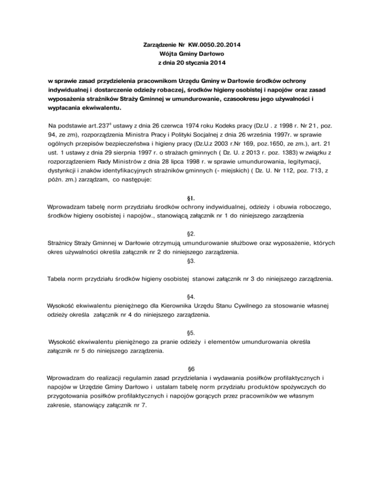 Zarządzenie Nr KW.0050.20.2014 Wójta Gminy Darłowo z dnia 20 stycznia 2014 w sprawie zasad przydzielenia pracownikom Urzędu Gminy w Darłowie środków ochrony indywidualnej i dostarczenie odzieży robaczej, środków higieny osobistej i napojów oraz zasad wyposażenia strażników Straży Gminnej w umundurowanie, czasookresu jego używalności i wypłacania ekwiwalentu. Na podstawie art.2378 ustawy z dnia 26 czerwca 1974 roku Kodeks pracy (Dz.U . z 1998 r. Nr 21, poz. 94, ze zm), rozporządzenia Ministra Pracy i Polityki Socjalnej z dnia 26 września 1997r. w sprawie ogólnych przepisów bezpieczeństwa i higieny pracy (Dz.U.z 2003 r.Nr 169, poz.1650, ze zm.), art. 21 ust. 1 ustawy z dnia 29 sierpnia 1997 r. o strażach gminnych ( Dz. U. z 2013 r. poz. 1383) w związku z rozporządzeniem Rady Ministrów z dnia 28 lipca 1998 r. w sprawie umundurowania, legitymacji, dystynkcji i znaków identyfikacyjnych strażników gminnych (- miejskich) ( Dz. U. Nr 112, poz. 713, z późn. zm.) zarządzam, co następuje: §1. Wprowadzam tabelę norm przydziału środków ochrony indywidualnej, odzieży i obuwia roboczego, środków higieny osobistej i napojów., stanowiącą załącznik nr 1 do niniejszego zarządzenia §2. Strażnicy Straży Gminnej w Darłowie otrzymują umundurowanie służbowe oraz wyposażenie, których okres używalności określa załącznik nr 2 do niniejszego zarządzenia. §3. Tabela norm przydziału środków higieny osobistej stanowi załącznik nr 3 do niniejszego zarządzenia. §4. Wysokość ekwiwalentu pieniężnego dla Kierownika Urzędu Stanu Cywilnego za stosowanie własnej odzieży określa załącznik nr 4 do niniejszego zarządzenia. §5. Wysokość ekwiwalentu pieniężnego za pranie odzieży i elementów umundurowania określa załącznik nr 5 do niniejszego zarządzenia. §6 Wprowadzam do realizacji regulamin zasad przydzielania i wydawania posiłków profilaktycznych i napojów w Urzędzie Gminy Darłowo i ustalam tabelę norm przydziału produktów spożywczych do przygotowania posiłków profilaktycznych i napojów gorących przez pracowników we własnym zakresie, stanowiący załącznik nr 7. §7 Ustalam następujące zasady przydziału pracownikom umundurowania i środków ochrony indywidualnej oraz odzieży i obuwia roboczego: I) pracownik używa przydzielone umundurowanie i środek ochrony indywidualnej do czasu utraty przez ten środek własności ochronnych; środek, którego termin przydatności do użycia określony przez producenta minął,uważa się za nieprzydatny do użycia ,czyli za taki, który utracił już własności ochronne; 2)okresy używalności przydzielonej rzeczy przedłuża się odpowiednio w przypadku, gdy przerwa w wykonywaniu pracy przez pracownika była nieprzerwana i trwała co najmniej 1 miesiąc(30 dni); pracownikom zatrudnionym w niepełnym wymiarze czasu pracy okres używalności przedłuża się odwrotnie proporcjonalnie do wymiaru etatu; 3) przydzielone umundurowanie i środki ochrony indywidualnej powinny spełniać wymagania dotyczące oceny zgodności, a odzież i obuwie robocze-wymagania określone w Polskich Normach; 4)pracownik zobowiązany jest użytkować przydzielone umundurowanie, środki ochrony indywidualnej oraz odzież i obuwie robocze zgodnie z przeznaczeniem i dbać o ich dobry stan; 5)pracodawca zapewnia, aby przydzielone umundurowanie, środki ochrony indywidualnej oraz odzież i obuwie robocze miały stosowny rozmiar oraz zachowały właściwości ochronne i użytkowe po praniu, konserwacji, naprawie, odpylaniu i odkażaniu; .nie dotyczy to odzieży osobistej i obuwia, które pracownik pierze i konserwuje we własnym zakresie; 6) wypłaty ekwiwalentu pieniężnego za pranie i konserwację dokonuje się do 31 stycznia każdego roku, za rok poprzedni. 7) pracodawca może przydzielić pracownikowi używane środki ochrony osobistej lub odzież roboczą, jeżeli rzeczy te zachowały własności ochronne i użytkowe, są czyste i zdezynfekowane w stopniu odpowiadającym wymaganiom higieniczno-sanitarnym; nie dotyczy to obuwia i odzieży osobistej, 8) po rozwiązaniu lub wygaśnięciu umowy o pracę pracownik jest zobowiązany zwrócić w terminie 7 dni przydzielone rzeczy pracodawcy, jeżeli okres ich używalności nie minął; 9) pracodawca może zażądać od pracownika na podstawie art. 124 Kp odszkodowania za przydzielone mu rzeczy w przypadku: a)nie dokonania zwrotu , o którym mowa w pkt. 8, b)utraty z winy pracownika rzeczy lub jej cech ochronnych lub użytkowych, 10) wydawane pracownikom rzeczy podlegają ewidencji w imiennych "Kartach ewidencyjnych wyposażenia", przyjęcie rzeczy potwierdza pracownik podpisem w "Karcie" której wzór stanowi załącznik nr 6 do niniejszego zarządzenia; II) rzeczy jednorazowego użytku są wydawane pracownikowi przez jego bezpośredniego przełożonego. §8 Wykonanie zarządzenia powierzam kierownikowi referatu gospodarczego. §9 Traci moc zarządzenie Wójta Gminy Darłowo z dnia 10 marca 1997 r. w sprawie zasad i wysokości przyznawania ekwiwalentu za pranie odzieży roboczej pracownikom Urzędu Gminy. §10 Zarządzenie wchodzi w życie z dniem podpisania. Załącznik nr 1 do zarządzenia Nr KW.0050.20.2014 Wójta Gminy Darłowo z dnia 20.01.2014 r. TABELA NORM Przydziału środków ochrony indywidualnej, odzieży i obuwia roboczego R- odzież i obuwie robocze O-ochrony indywidualnej o.z.- okres zimowy Załącznik nr 2 do zarządzenia Nr KW.0050.20.2014 Wójta Gminy Darłowo z dnia 20.01.2014 r. Tabela okresów używalności przedmiotów umundurowania 1. Zasadnicze przedmioty umundurowania wchodzące w skład ubioru służbowego. 2..Zasadnicze przedmioty umundurowania wchodzące w skład ubioru wyjściowego 3. Składniki uzupełniające do umundurowania. Załącznik nr 3 do zarządzenia Nr KW.0050.20.2014 Wójta Gminy Darłowo z dnia 20.01.2014 r. Tabela Norm Przydziału środków higieny osobistej Załącznik nr 4 do zarządzenia Nr KW.0050.20.2014 Wójta 