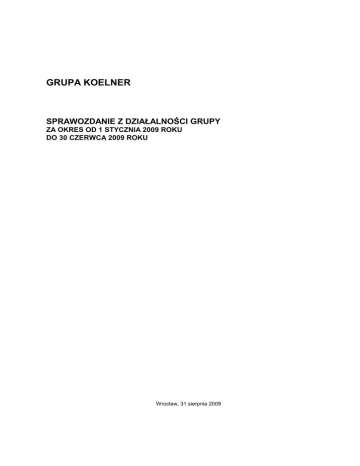 GRUPA KOELNER SPRAWOZDANIE Z DZIAŁALNOŚCI GRUPY ZA OKRES OD 1 STYCZNIA 2009 ROKU DO 30 CZERWCA 2009 ROKU Wrocław, 31 sierpnia 2009 Sprawozdanie z działalności GRUPY KOELNER SA za okres 1.01 – 30.06.2009 SPIS TREŚCI 1. CHARAKTERYSTYKA GRUPY KAPITAŁOWEJ ...............................................................................3 1.1. KSZTAŁTOWANIE SIĘ GRUPY.....................................................................................................3 1.1.1. SPÓŁKA DOMINUJĄCA.........................................................................................................3 1.1.2. SKŁAD GRUPY KAPITAŁOWEJ ............................................................................................3 1.1.3. ROZBUDOWA GRUPY ..........................................................................................................4 1.2. AKCJONARIAT...............................................................................................................................4 1.3. WŁADZE SPÓŁKI DOMINUJĄCEJ ................................................................................................4 1.3.1. ZARZĄD .................................................................................................................................4 1.3.2. RADA NADZORCZA...............................................................................................................4 1.3.3. AKCJE W POSIADANIU CZŁONKÓW WŁADZ SPÓŁKI DOMINUJĄCEJ .............................5 1.4. CHARAKTERYSTYKA POLITYKI W ZAKRESIE KIERUNKÓW ROZWOJU GRUPY KAPITAŁOWEJ ..........................................................................................................................................5 2. CZYNNIKI ISTOTNE DLA ROZWOJU GRUPY, W TYM ZAGROśENIA I RYZYKA ORAZ PERSPEKTYWY ROZWOJU GRUPY ...........................................................................................................6 2.1. CZYNNIKI ZEWNĘTRZNE .............................................................................................................6 2.1.1. SYTUACJA MAKROEKONOMICZNA ORAZ KONIUNKTURA W BRANśY BUDOWLANO-MONTAśOWEJ ......6 2.1.2. KURSY WALUTOWE ...................................................................................................................6 2.1.3. STOPY PROCENTOWE ...............................................................................................................6 2.1.4. CŁA ANTYDUMPINGOWE ............................................................................................................6 2.2. CZYNNIKI WEWNĘTRZNE............................................................................................................7 2.2.1. ZAKOŃCZENIE REORGANIZACJI DZIAŁU LOGISTYKI ......................................................................7 2.2.2. W DROśENIE SYSTEMU DO KONSOLIDACJI SPRAWOZDAŃ FINANSOWYCH ......................................7 2.3. PERSPEKTYWY ROZWOJU .........................................................................................................7 2.4. STRATEGIA GRUPY......................................................................................................................7 3. SEZONOWOŚĆ SPRZEDAśY ..........................................................................................................8 4. INWESTYCJE ORAZ BADANIA I ROZWÓJ ......................................................................................8 4.1. INWESTYCJE GRUPY...................................................................................................................8 4.2. BADANIA I ROZWÓJ .....................................................................................................................9 4.3. PLANY NA II PÓŁROCZE 2009 ROKU...........................................................................................9 5. KADRY .............................................................................................................................................10 6. ZAWARCIE PRZEZ PODMIOTY Z GRUPY TRANSAKCJI Z PODMIOTAMI POWIĄZANYMI........10 7. UDZIELONE PORĘCZENIA KREDYTU LUB POśYCZKI ORAZ UDZIELONE GWARANCJE .......11 8. POSTĘPOWANIA TOCZĄCE SIĘ PRZED SĄDEM, ORGANEM WŁAŚCIWYM DLA POSTĘPOWANIA ARBITRAśOWEGO LUB ORGANEM ADMINISTRACJI PUBLICZNEJ ........................11 9. ZNACZĄCE UMOWY.......................................................................................................................11 9.1. UMOWY UBEZPIECZENIA ..........................................................................................................11 9.2. UMOWY KREDYTOWE ...............................................................................................................12 9.3. UMOWY PORĘCZENIA ...............................................................................................................12 10. WYNIKI FINANSOWE GRUPY KAPITAŁOWEJ..............................................................................12 10.1. CHARAKTERYSTYKA STRUKTURY AKTYWÓW I PASYWÓW SKONSOLIDOWANEGO BILANSU 13 10.2. PRZYCHODY ZE SPRZEDAśY ...............................................................................................13 10.2.1. SPRZEDAś KRAJOWA........................................................................................................14 10.2.2. SPRZEDAś ZAGRANICZNA ................................................................................................14 10.3. KOSZTY OPERACYJNE ..........................................................................................................15 10.4. DZIAŁALNOŚĆ FINANSOWA ..................................................................................................16 10.5. WSKAŹNIKI RENTOWNOŚCI .................................................................................................17 10.6. WSKAŹNIKI PŁYNNOŚCI ...................................................................