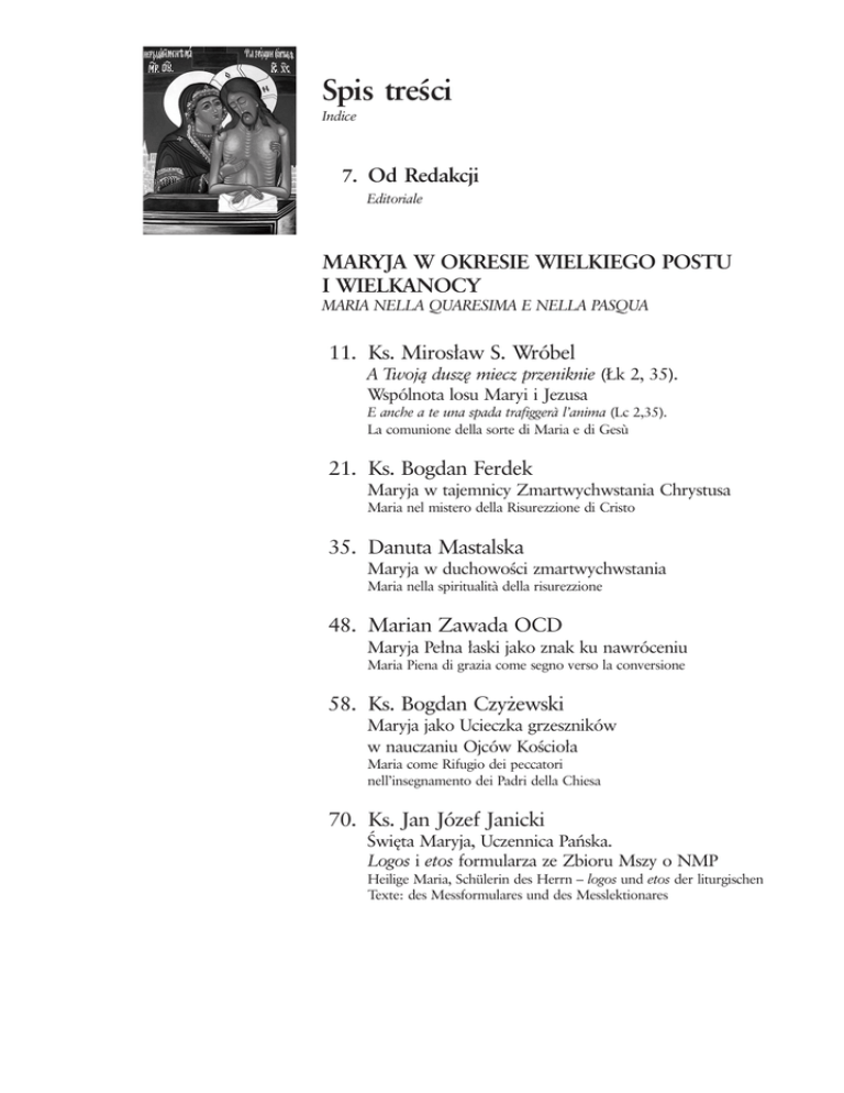 Spis treści Indice 7. Od Redakcji Editoriale MARYJA W OKRESIE WIELKIEGO POSTU I WIELKANOCY MARIA NELLA QUARESIMA E NELLA PASQUA 11. Ks. Mirosław S. Wróbel A Twoją duszę miecz przeniknie (Łk 2, 35). Wspólnota losu Maryi i Jezusa E anche a te una spada trafiggerà l’anima (Lc 2,35). La comunione della sorte di Maria e di Gesù 21. Ks. Bogdan Ferdek Maryja w tajemnicy Zmartwychwstania Chrystusa Maria nel mistero della Risurezzione di Cristo 35. Danuta Mastalska Maryja w duchowości zmartwychwstania Maria nella spiritualità della risurezzione 48. Marian Zawada OCD Maryja Pełna łaski jako znak ku nawróceniu Maria Piena di grazia come segno verso la conversione 58. Ks. Bogdan Czyżewski Maryja jako Ucieczka grzeszników w nauczaniu Ojców Kościoła Maria come Rifugio dei peccatori nell’insegnamento dei Padri della Chiesa 70. Ks. Jan Józef Janicki Święta Maryja, Uczennica Pańska. Logos i etos formularza ze Zbioru Mszy o NMP Heilige Maria, Schülerin des Herrn – logos und etos der liturgischen Texte: des Messformulares und des Messlektionares 86. Waldemar Pałęcki MSF Najświętsza Maryja Panna Matka pojednania. Analiza liturgiczno-teologiczna formularza ze Zbioru Mszy o Najświętszej Maryi Pannie Beata Vergine Maria Madre della riconciliazione. L’analisi liturgico-teologica del formulario dalla Collezione delle messe sulla Beata Vergine Maria 103. Ks. Piotr Kulbacki Najświętsza Maryja Panna z Wieczernika. Analiza liturgiczno-teologiczna formularza ze Zbioru Mszy o NMP Beata Vergine Maria del Cenacolo. L’analisi liturgico-teologica del formulario dalla Collezione delle messe sulla BVM 117. Ks. Kazimierz Matwiejuk Królowa Apostołów na podstawie formularza ze Zbioru Mszy o Najświętszej Maryi Pannie Regina degli Apostoli alla luce del formulario dalla Collezione delle messe sulla Beata Vergine Maria 134. Ks. Wojciech Turowski Maryja w przepowiadaniu wielkopostnym i wielkanocnym Maria nella predicazione quaresimale e pasquale 149. Aneta Kramiszewska Zatopiona w męce Syna. Wizerunki Matki Bożej w otoczeniu arma passionis (XIV-XVIII wiek) Sommersa nella passione del Figlio. Le immagini della Madre di Dio nell’ambiente di arma passionis (XIV-XVIII sec.) 167. Ks. Marek Tatar Duchowość maryjna „Rozmów duszy” w nabożeństwie Gorzkich żali La spiritualità mariana di “Colloqui dell’anima” nel pio esercizio “Amari lamenti” 182. Ryszard Obarski Maryja w Misterium Paschalnym według ekumenicznego uzgodnienia Grupy z Dombes Maria nel Mistero Pasquale secondo accordo ecumenico del Gruppo di Dombes ŚCIEŻKI MARIOLOGII WSPÓŁCZESNEJ SENTIERI DELLA MARIOLOGIA CONTEMPORANEA 225. Marian Kowalczyk SAC Maryja - Stolica Mądrości. Refleksje na kanwie encykliki Jana Pawła II Fides et ratio Maria la Sede della Sapienza. Le riflessioni sull’enciclica Fides et ratio di Giovanni Paolo II MISCELLANEA 243. Iwona Krysiak Wpływ św. Atanazego na rozwój nauki o Matce Bożej L’influenza di san Atanasio sullo sviluppo della dottrina della Madre di Dio 255. Bp Andrzej F. Dziuba Maltańska Matka Boża z Damaszku. Studium historyczno-teologiczne Our Lady of Damascus. Historical and theological study DOKUMENTY DOCUMENTI 289. Nauczanie Benedykta XVI 2011 Insegnamento di Benedetto XVI 2011 RECENZJE RECENSIONI 315. Stanisław C. Napiórkowski OFMConv Minipodręcznik mariologii (J. Jezierski, Maryja początkiem nowego świata. Zarys mariologii katolickiej, Kraków 2012) 319. Ks. Wacław Siwak Historiozbawcza obecność Maryi (D. Mastalska, Maryja w tajemnicy zbawienia, Licheń Stary 2012) 325. Bp Andrzej F. Dziuba Objawienia maryjne w Guadalupe (J. Achmatowicz, Nican Mopohua. Główne źródło studiów nad objawieniami guadalupańskimi w Meksyku w 1531 roku, Wrocław 2010) 331. Bp Andrzej F. Dziuba Maryjne drogi Prymasa Stefana Wyszyńskiego (B. Pylak, Maryjne drogi w życiu i działalności Prymasa Stefana Wyszyńskiego (1901-1981). Łaski i uzdrowienia za wstawiennictwem Sługi Bożego Stefana kardynała Wyszyńskiego, Prymasa Polski, Warszawa 2012) PREZENTACJE PRESENTAZIONI 339. „Marianum. Ephemerides Mariologiae” – 71(2009) nr 1-2 (Adam Stankiewicz MIC) 341. „Theotokos. Ricerche interdisciplinari di Mariologia” – 18(2010) nr 2 (Adam Stankiewicz MIC) INFORMACJE NOTIZIE 345. Śp. ks. prof. dr hab. Józef Kudasiewicz (23 VIII 1926 – 16 XI 2012), biblista i mariolog