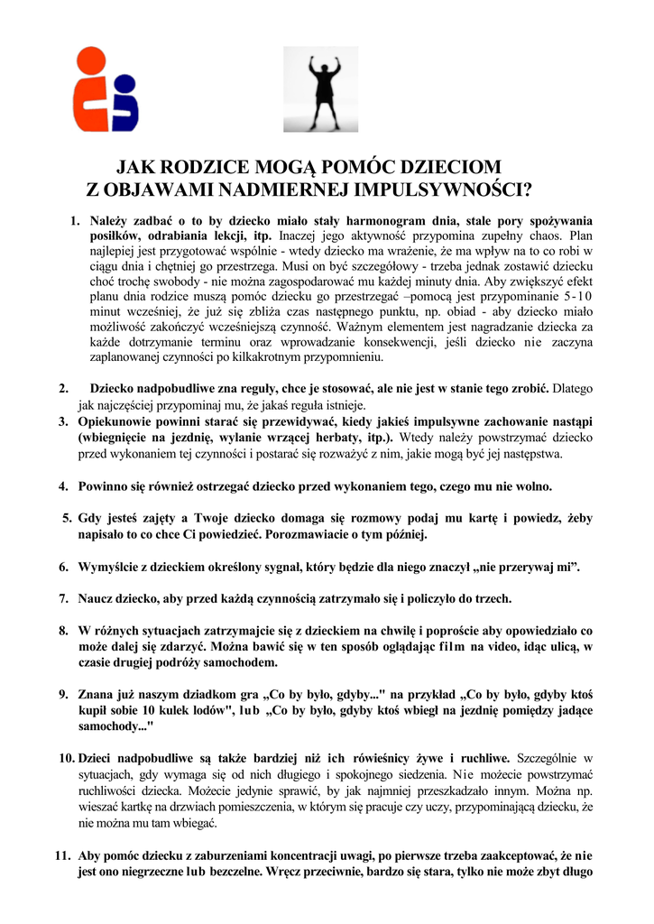 JAK RODZICE MOGĄ POMÓC DZIECIOM Z OBJAWAMI NADMIERNEJ IMPULSYWNOŚCI? 1. Należy zadbać o to by dziecko miało stały harmonogram dnia, stale pory spożywania posiłków, odrabiania lekcji, itp. Inaczej jego aktywność przypomina zupełny chaos. Plan najlepiej jest przygotować wspólnie - wtedy dziecko ma wrażenie, że ma wpływ na to co robi w ciągu dnia i chętniej go przestrzega. Musi on być szczegółowy - trzeba jednak zostawić dziecku choć trochę swobody - nie można zagospodarować mu każdej minuty dnia. Aby zwiększyć efekt planu dnia rodzice muszą pomóc dziecku go przestrzegać –pomocą jest przypominanie 5-10 minut wcześniej, że już się zbliża czas następnego punktu, np. obiad - aby dziecko miało możliwość zakończyć wcześniejszą czynność. Ważnym elementem jest nagradzanie dziecka za każde dotrzymanie terminu oraz wprowadzanie konsekwencji, jeśli dziecko nie zaczyna zaplanowanej czynności po kilkakrotnym przypomnieniu. Dziecko nadpobudliwe zna reguły, chce je stosować, ale nie jest w stanie tego zrobić. Dlatego jak najczęściej przypominaj mu, że jakaś reguła istnieje. 3. Opiekunowie powinni starać się przewidywać, kiedy jakieś impulsywne zachowanie nastąpi (wbiegnięcie na jezdnię, wylanie wrzącej herbaty, itp.). Wtedy należy powstrzymać dziecko przed wykonaniem tej czynności i postarać się rozważyć z nim, jakie mogą być jej następstwa. 2. 4. Powinno się również ostrzegać dziecko przed wykonaniem tego, czego mu nie wolno. 5. Gdy jesteś zajęty a Twoje dziecko domaga się rozmowy podaj mu kartę i powiedz, żeby napisało to co chce Ci powiedzieć. Porozmawiacie o tym później. 6. Wymyślcie z dzieckiem określony sygnał, który będzie dla niego znaczył „nie przerywaj mi”. 7. Naucz dziecko, aby przed każdą czynnością zatrzymało się i policzyło do trzech. 8. W różnych sytuacjach zatrzymajcie się z dzieckiem na chwilę i poproście aby opowiedziało co może dalej się zdarzyć. Można bawić się w ten sposób oglądając film na video, idąc ulicą, w czasie drugiej podróży samochodem. 9. Znana już naszym dziadkom gra „Co by było, gdyby..." na przykład „Co by było, gdyby ktoś kupił sobie 10 kulek lodów", lub „Co by było, gdyby ktoś wbiegł na jezdnię pomiędzy jadące samochody..." 10. Dzieci nadpobudliwe są także bardziej niż ich rówieśnicy żywe i ruchliwe. Szczególnie w sytuacjach, gdy wymaga się od nich długiego i spokojnego siedzenia. Nie możecie powstrzymać ruchliwości dziecka. Możecie jedynie sprawić, by jak najmniej przeszkadzało innym. Można np. wieszać kartkę na drzwiach pomieszczenia, w którym się pracuje czy uczy, przypominającą dziecku, że nie można mu tam wbiegać. 11. Aby pomóc dziecku z zaburzeniami koncentracji uwagi, po pierwsze trzeba zaakceptować, że nie jest ono niegrzeczne lub bezczelne. Wręcz przeciwnie, bardzo się stara, tylko nie może zbyt długo skupiać się na jednej rzeczy. Dlatego aby dotrzeć do dziecka nadpobudliwego konieczne jest: ograniczenie ilości dochodzących do niego bodźców, dostosowanie tempa pracy do możliwości dziecka, zastosowanie metod, które skupią jego uwagę na tym co uważamy w danej chwili za najważniejsze. 12. Co zrobić aby dziecko słuchało tego co do niego mówicie? powiedzcie do dziecka :" posłuchaj, powiem Ci coś bardzo ważnego", „spójrz na mnie", „zobacz", spróbujcie mówić tak, aby dziecko widziało Wasze usta kiedy do niego mówicie, dla zwrócenia uwagi dziecka pomocne bywają różne gesty, które mobilizują jego uwagę, jeśli dziecko jest jeszcze bardzo małe lub jego zaburzenia uwagi są silne, po prostu podejdźcie do niego, przytrzymajcie je za ramiona, kucnijcie (ważne jest, aby wasze oczy były na jednym poziomie) i dopiero wtedy rozpocznijcie mówić, polecenia lub komunikaty wydawane dziecku nadpobudliwemu powinny być krótkie i jednoznaczne, wielokrotnie powtarzaj ważne informacje i upewniaj się, że dziecko je usłyszało i zrozumiało. 13. Jak pomóc dziecku doprowadzić czynność do końca? dziecko nadpobudliwe przez bardzo krótki okres czasu potrafi skupić uwagę, dlatego zadania, które są monotonne, długotrwałe, nudne i skomplikowane zwykle stają się niewykonalne, polecenia lub zadania dziel na niniejsze odcinki, konkretnie powiedz co dziecko ma zrobić (zamiast „posprzątaj pokój", powiedz „zabierz tamte zabawki z podłogi", „podnieś i postaw misia na półkę", „uporządkuj 14. Szukaj możliwych do zaakceptowania form rozładowywania nadruchliwości. Dziecko nadpobudliwe musi się ruszać więcej niż jego koledzy. Karcenie go za to może spowodować jedynie wzmożenie tego zachowania. Ponieważ dla takiego dziecka każda okazja do ruchu jest dobra, można wykorzystać to z pożytkiem dla siebie i klasy; prosząc aby: rozdało wszystkim dzieciom pomoce szkolne, przyniosło coś z zaplecza, starło tablic?, poszło po coś do pokoju nauczycielskiego, itp. Nie tylko zmniejszamy w ten sposób niepożądaną nadruchliwość ucznia, ale jeszcze pozwolimy mu jeszcze poczuć się ważnym, potrzebnym i akceptowanym. 15. Bliska współpraca z rodzicami ułatwia życie obu stronom z pożytkiem dla dziecka. Nauczyciel często uważa, że dziecko biega po klasie, bo rodzice nie potrafią go wychować, ale rodzice mają też prawo sądzić, że ich dziecko nigdy nie wie jak rozwiązać zadanie domowe i czego ma się nauczyć na jutro, bo ma bardzo złego nauczyciela. Można więc np. wprowadzić zeszyt do którego nauczyciel wpisuje nie tylko uwagi, ale główne informacje o tym co jest zadane, czego trzeba się na następną lekcje nauczyć i co przynieść do szkoły. To pomoże również rodzicom wyegzekwować od swoich pociech odrobienia zadania czy przygotowania pomocy.
