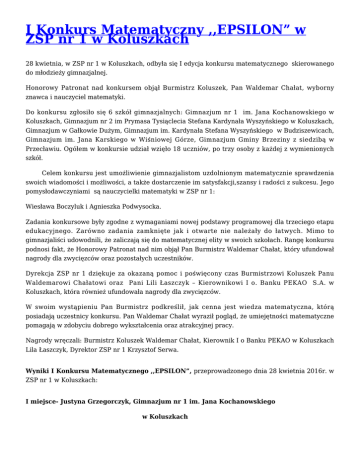I Konkurs Matematyczny ,,EPSILON” w ZSP nr 1 w Koluszkach 28 kwietnia, w ZSP nr 1 w Koluszkach, odbyła się I edycja konkursu matematycznego skierowanego do młodzieży gimnazjalnej. Honorowy Patronat nad konkursem objął Burmistrz Koluszek, Pan Waldemar Chałat, wyborny znawca i nauczyciel matematyki. Do konkursu zgłosiło się 6 szkół gimnazjalnych: Gimnazjum nr 1 im. Jana Kochanowskiego w Koluszkach, Gimnazjum nr 2 im Prymasa Tysiąclecia Stefana Kardynała Wyszyńskiego w Koluszkach, Gimnazjum w Gałkowie Dużym, Gimnazjum im. Kardynała Stefana Wyszyńskiego w Budziszewicach, Gimnazjum im. Jana Karskiego w Wiśniowej Górze, Gimnazjum Gminy Brzeziny z siedzibą w Przecławiu. Ogółem w konkursie udział wzięło 18 uczniów, po trzy osoby z każdej z wymienionych szkół. Celem konkursu jest umożliwienie gimnazjalistom uzdolnionym matematycznie sprawdzenia swoich wiadomości i możliwości, a także dostarczenie im satysfakcji,szansy i radości z sukcesu. Jego pomysłodawczyniami są nauczycielki matematyki w ZSP nr 1: Wiesława Boczyluk i Agnieszka Podwysocka. Zadania konkursowe były zgodne z wymaganiami nowej podstawy programowej dla trzeciego etapu edukacyjnego. Zarówno zadania zamknięte jak i otwarte nie należały do łatwych. Mimo to gimnazjaliści udowodnili, że zaliczają się do matematycznej elity w swoich szkołach. Rangę konkursu podnosi fakt, że Honorowy Patronat nad nim objął Pan Burmistrz Waldemar Chałat, który ufundował nagrody dla zwycięzców oraz pozostałych uczestników. Dyrekcja ZSP nr 1 dziękuje za okazaną pomoc i poświęcony czas Burmistrzowi Koluszek Panu Waldemarowi Chałatowi oraz Pani Lili Łaszczyk – Kierownikowi I o. Banku PEKAO S.A. w Koluszkach, która również ufundowała nagrody dla zwycięzców. W swoim wystąpieniu Pan Burmistrz podkreślił, jak cenna jest wiedza matematyczna, którą posiadają uczestnicy konkursu. Pan Waldemar Chałat wyraził pogląd, że umiejętności matematyczne pomagają w zdobyciu dobrego wykształcenia oraz atrakcyjnej pracy. Nagrody wręczali: Burmistrz Koluszek Waldemar Chałat, Kierownik I o Banku PEKAO w Koluszkach Lila Łaszczyk, Dyrektor ZSP nr 1 Krzysztof Serwa. Wyniki I Konkursu Matematycznego ,,EPSILON”, przeprowadzonego dnia 28 kwietnia 2016r. w ZSP nr 1 w Koluszkach: I miejsce- Justyna Grzegorczyk, Gimnazjum nr 1 im. Jana Kochanowskiego w Koluszkach II miejsce- Filip Jaromin, Gimnazjum im. Jana Karskiego w Wiśniowej Górze III miejsce- Michał Stanowski, Gimnazjum nr 1 im. Jana Kochanowskiego w Koluszkach Komisja konkursowa: Krzysztof Serwa, Wiesława Boczyluk, Małgorzata Wawrzonowska. Składamy podziękowania uczestnikom konkursu i ich opiekunom. Gratulacje kierujemy do dyrektorów gimnazjów. Pragniemy przypomnieć, że I miejsce w naszym konkursie uzyskała laureatka Wojewódzkiego Konkursu Przedmiotowego z Matematyki – Justyna Grzegorczyk. Gratulujemy!