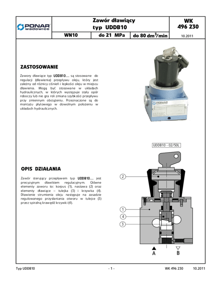 Zawór dławiący typ UDDB10 WN10 do 21 MPa WK 496 230 do 80 dm3/min 10.2011 ZASTOSOWANIE Zawory dławiące typ UDDB10… są stosowane do regulacji (dławienia) przepływu oleju, który jest zależny od różnicy ciśnień i lepkości oleju w miejscu dławienia. Mogą być stosowane w układach hydraulicznych, w których występuje stały opór roboczy lub nie gra roli zmiana szybk ości przepływu przy zmiennym obciążeniu. Przeznaczone są do montażu płytowego w dowolnym położeniu w układach hydraulicznych. UDDB10 - 02/50L OPIS DZIAŁANIA 2 Zawór sterujący przepływem typ UDDB10… jest precyzyjnym dławikiem regulacyjnym. Główne elementy zaworu to: korpus (1), nastawa (2) oraz elementy dławiące – tulejka (3) i krzywka (4). Dławienie strumienia oleju następuje na zasadzie regulowanego przysłaniania otworu w tulejce (3) przez spiralną krawędź krzywk i (4). 1 4 3 A Typ UDDB10 -1- B WK 496 230 10.2011 DANE TECHNICZNE Rodzaj cieczy hydraulicznej Wymag aga Wym agana fi f iltracj ltr acja acja ciec c ieczy ieczy hydra hydraulicz icznej Zaleca lec ana fi f iltracj ltr acja acja ciec c ieczy ieczy hydra hydraulicz icznej Lepkość nominalna cieczy hydraulicznej Zakres lepkości cieczy hydraulicznej Optymalna temperatura pracy (cieczy w zbiorniku) Zakres temperatury pracy Max ciś ci śnien ienie pracy pr acy Max przepły przep ływ ływ Kąt obrotu pokrętła do 10 MPa Moment obrotu pokrętła do 20 MPa Masa olej mineralny 1 6 µm 1 0 µm o 37 mm 2 /s w temperaturze 55 C 2,8 do 328 mm2 /s o 40 do 55 C o - 30 do 70 C 21 M P a zależ leżny od wersji wersj i zaworu oru - zakresy przepły wu wg ark ark. 6 300 o 1,1 Nm 1,8 Nm 1,4 kg SCHEMATY Symbo Symb ol graf gr afic aficz iczny zaworu oru typ UDDB1 UDDB10 DB10 A WK 496 230 10.2011 B -2- Typ UDDB10 WYMIARY GABARYTOWE I PRZYŁĄCZENIOWE 43 46 O 10 6 7 A 22 27 B ~124 106 5 11 4 2 1 11 3 G1/4 gł 14 A B 60 6 5,5 - 4 otw O O 19 48 O 19 G1/4 gł 14 4 48 60 O 6 4 M5 gł 13 - 4 otw 10 (max) - 2 otw A 1 - Element nastawczy (pokrętło z zamkiem na klucz) 2 - Pierścień uszczelniający o-ring 12 x 2 - szt. 2 (A, B) 3 - Kanał A - wejście wejś cie 4 - Kanał B - wyjści w yjście yjści e 5 - Dodatkowy kanał A (G1/4) 6 - Dodatkowy kanał B (G1/4) 7 - Korek G1 G 1/4 - szt. 2 (A, B) 8 - Konfiguracja otworów powierzchni płyty przyłączeniowej śruby mocujące M5 x 50 -1 -10.9 wg PN-E N-EN ISO 4762 (PN/M-82302) - szt. 4 /komplet moment dokręcenia Md = 6 Nm UWAGA WAGA: GA: płytę przyłączeniową i śruby mocujące należy zamawiać oddzielnie - wg ark. 6 9 - Wymagany stan powierzchni płyty przyłączeniowej 10 - Przestrzeń na wyjęcie klucza z zamka nastawy 11 11 48 60 (min) 8 B 17 17 48 60 (min) r 0,01/100 mm 0,63 9 Typ UDDB10 -3- WK 496 230 10.2011 CHARAKTERYSTYKI o (dla lepkości cieczy hydraulicznej v = 41 mm 2/s i temperatury t = 50 C ) Chara arakterystyk terysty ki przep pr zepły zepływ ływu wersje UDDB10-02/...L... WK 496 230 10.2011 -4- Typ UDDB10 CHARAKTERYSTYKI o (dla lepkości cieczy hydraulicznej v = 41 mm 2/s i temperatury t = 50 C ) Chara arakterystyk terysty ki przep pr zepły zepływ ływu wersje UDDB10-02/...Q... Typ UDDB10 -5- WK 496 230 10.2011 SPOSÓB ZAMAWIANIA 10 UDDB Wielkość nominalna (WN) WN10 * =10 Numer serii konstrukcyjnej (02-09) - niezmienne wymiary przyłacza i zabudowy = 0X seria 02 = 02 Zakres przepływu (A → B) linearny 2 dm 3/min 5 dm3 /min 10 dm 3/min 16 dm 3/min 25 dm 3/min 50 dm 3/min progresywny 5 dm 3 /min 10 dm 3/min 16 dm 3/min 25 dm 3/min = 2L = 5L = 10L = 16L = 25L = 50L = 5Q = 10Q = 16Q = 25Q Rodzaj uszczelnienia NBR (dla cieczy na bazie olejów mineralnych) FKM (dla cieczy na bazie estrów fosforanowych) = bez oznaczenia =V Ewentualne dodatkowe wymagania określone w sposób opisowy (uzgodnione z producentem) UWA UWAGI: Zawór należy zamawiać wg kodu, ustalonego z symboli wg powyższego diagramu. Symbo Symb ole zaznacz aczone dru dr ukiem pogr p ogrub ogr ubi ubionym oznacz aczają ają prefero prefer owane wersje wyk wykonania dostęp dostępne stęp ne w krótk rótkim termi term inie do d osta stawy. Przykład kodu zaworu w zamówieniu: UDDB10/02 - 10L PŁYTY PRZYŁĄCZENIOWE I ŚRUBY MOCUJĄCE Płyty przyłączeniowe dla regulatora przepływu typ UDDB1 DB10 należy zamawiać wg oznaczenia typu płyty, z uwzględnieniem wymiarów przyłączy gwintowych przewodów rurowych podanych poniżej. Symbole płyt: G 44/01 - przyłącza gwintowe G 1/4 G 45/01 - przyłącza gwintowe G 1/2 Płyta przyłączeniowa i śruby do mocowania rozdzielacza M5 x 50 - 10,9 0, 9 wg PN-87/M-82302 - szt. /komplet dostarczane są na oddzielne zamówienie. Moment dokręcenia śrub Md = 6 Nm . UWA UWAGA: Symbo Symb ol płyty p łyty zaznacz aczony dru dr ukiem pogr p ogrub ogr ubi ubionym oznacz acza prefero prefer owaną wersję wyk wykonania do d ostępn stęp ną w krótk rót kim termi term inie do d osta stawy. PONAR Wadowice S.A. ul. Wojska Polskiego 29 34-100 Wadowice tel. +48 33 488 21 00 fax.+48 33 488 21 03 www.ponar-wadowice.pl WK 496 230 10.2011 -6- Typ UDDB10