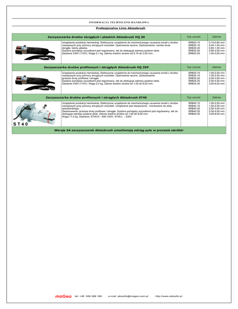 I N F O R M A C J A T E C H N I C ZN O - H A N D L O W A Profesjonalna Linia Abisobrush Zaczyszczarka drutów okrągłych i płaskich Abisobrush HQ 30 Urządzenie produkcji niemieckiej. Elektryczne urządzenie do mechanicznego usuwania emalii z drutów nawojowych przy pomocy wirujących szczotek. Operowanie ręczne. Zastosowanie: cienkie druty okrągłe, taśmy płaskie. Dystans pomiędzy szczotkami jest regulowany, tak że obsługuje zakresy podane obok. Zasilanie 230V (115V). Waga 2,1 kg. Zakres średnic drutów od 0,15 do 3,00 mm. Zaczyszczarka drutów profilowych i okrągłych Abisobrush HQ 35P Urządzenie produkcji niemieckiej. Elektryczne urządzenie do mechanicznego usuwania emalii z drutów nawojowych przy pomocy wirujących szczotek. Operowanie ręczne. Zastosowanie: grubsze druty profilowe i okrągłe. Dystans pomiędzy szczotkami jest regulowany, tak że obsługuje zakresy podane obok. Zasilanie 230V (115V). Waga 2,4 kg. Zakres średnic drutów od 1,00 do 6,00 mm. Zaczyszczarka drutów profilowych i okrągłych Abisobrush ST40 Urządzenie produkcji niemieckiej. Elektryczne urządzenie do mechanicznego usuwania emalii z drutów nawojowych przy pomocy wirujących szczotek. Urządzenie jest stacjonarne - montowane do stołu operatorskiego. Zastosowanie: grubsze druty profilowe i okrągłe. Dystans pomiędzy szczotkami jest regulowany, tak że obsługuje zakresy podane obok. Zakres średnic drutów od 1,00 do 8,00 mm. Waga 11,5 kg. Zasilanie: ST40.D - 400/ 230V, ST40.L - 230V Wersje SA zaczyszczarek Abisobrush umożliwiają odciąg pyłu w procesie obróbki tel: +48 506 586 166 e-mail: [email protected] http://www.abisofix.pl Typ szczot. Zakres SRB30.10 SRB30.15 SRB30.20 SRB30.25 SRB30.30 0,15-0,60 mm 0,40-1,00 mm 0,60-1,50 mm 0,80-2,00 mm 1,00-3,00 mm Typ szczot. Zakres SRB35.10 SRB35.15 SRB35.20 SRB35.25 SRB35.30 1,00-2,00 mm 1,50-2,50 mm 2,00-3,00 mm 2,50-4,00 mm 3,00-6,00 mm Typ szczot. Zakres SRB40.10 SRB40.15 SRB40.20 SRB40.25 SRB40.30 1,00-2,00 mm 1,50-2,50 mm 2,00-3,00 mm 2,50-4,00 mm 3,00-8,00 mm