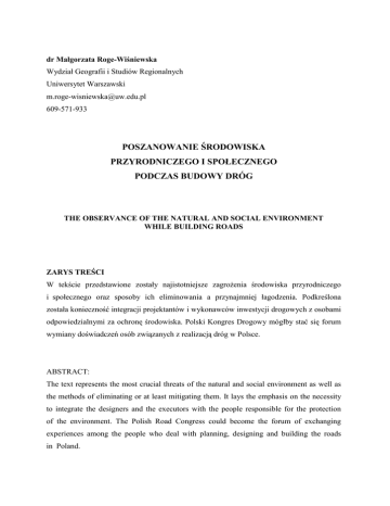 dr Małgorzata Roge-Wiśniewska Wydział Geografii i Studiów Regionalnych Uniwersytet Warszawski [email protected] 609-571-933 POSZANOWANIE ŚRODOWISKA PRZYRODNICZEGO I SPOŁECZNEGO PODCZAS BUDOWY DRÓG THE OBSERVANCE OF THE NATURAL AND SOCIAL ENVIRONMENT WHILE BUILDING ROADS ZARYS TREŚCI W tekście przedstawione zostały najistotniejsze zagroŜenia środowiska przyrodniczego i społecznego oraz sposoby ich eliminowania a przynajmniej łagodzenia. Podkreślona została konieczność integracji projektantów i wykonawców inwestycji drogowych z osobami odpowiedzialnymi za ochronę środowiska. Polski Kongres Drogowy mógłby stać się forum wymiany doświadczeń osób związanych z realizacją dróg w Polsce. ABSTRACT: The text represents the most crucial threats of the natural and social environment as well as the methods of eliminating or at least mitigating them. It lays the emphasis on the necessity to integrate the designers and the executors with the people responsible for the protection of the environment. The Polish Road Congress could become the forum of exchanging experiences among the people who deal with planning, designing and building the roads in Poland. Realizacja i eksploatacja dróg wiąŜe się ze znaczącym oddziaływaniem na środowisko, dlatego ich budowie powinien towarzyszyć proces oceny oddziaływania na środowisko. W procesie tym określa się, analizuje oraz ocenia bezpośredni wpływ danego przedsięwzięcia na środowisko oraz zdrowie i warunki Ŝycia ludzi, dobra materialne (we wzajemnym ich powiązaniu) oraz dostępność złóŜ kopalin (Obwieszczenie… 2006). W szczególności naleŜy uwzględnić oddziaływania na (Obwieszczenie… 2006): a) ludzi i zwierzęta, rośliny, wodę i powietrze, b) powierzchnię ziemi z uwzględnieniem ruchów masowych ziemi, klimat i krajobraz, c) dobra materialne, d) zabytki i krajobraz kulturowy NaleŜy przy tym zidentyfikować oddziaływania bezpośrednie, pośrednie, wtórne, skumulowane, krótko-, średnio- i długoterminowe, stałe i chwilowe wynikające z istnienia przedsięwzięcia, wykorzystania zasobów środowiska oraz emisji (Obwieszczenie… 2006). Obowiązkowe jest takŜe m.in. sporządzenie opisu przewidywanych działań zapobiegających i ograniczających prognozowane oddziaływania (Obwieszczenie… 2006). Negatywne oddziaływania związane z budową drogi występują nie tylko w bezpośrednim otoczeniu planowanej trasy. Budowa drogi powoduje trwałe zajęcie terenu pod trasę i czasowe pod drogi dojazdowe, place składowe, miejsca poboru kruszyw i inne. Z terenów tych usuwana jest roślinność, giną drobne zwierzęta, usuwana jest wierzchnia warstwa gleby. Przekształcana jest rzeźba terenu – róŜnice wysokości mogą być nawet kilkumetrowe. Modyfikowane są stosunki wodne. Dobra kultury ukryte w ziemi mogą ulec zniszczeniu, dlatego niezbędne jest wczesne wykonanie skrupulatnego rozpoznania archeologicznego. W celu ograniczenia negatywnych wpływów zaplecze budowy powinno być organizowane wyłącznie na terenach nieleśnych (najlepiej na terenach juŜ zagospodarowanych), a czas trwania prac oraz zajęcie terenu maksymalnie ograniczone – niedopuszczalne jest spontaniczne wkraczanie na tereny sąsiadujące z budową. Na terenie budowy i na jej zapleczu powinien być utrzymywany porządek przy pomocy m.in. wystarczającej ilości odpowiednio zlokalizowanych pojemników na odpady, sanitariatów, właściwej gospodarki materiałowej. Większość oddziaływań na krajobraz jest nieodwracalna. Jednak wielu z nich moŜna uniknąć, a przynajmniej złagodzić, jeśli odpowiednio wcześnie na etapie planowania wykona się studia krajobrazowe [A2… 1996]. Hałas oraz obecność ludzi, pojazdów i maszyn płoszą zwierzęta, a pozbawiony roślinności pas terenu utrudnia ich migracje. Oddziaływania te mają szczególne znaczenie w miejscach przecięcia korytarzy ekologicznych, miejsc lęgowych ptaków i innych cennych siedlisk. Korytarze – ze względu na swoją linearną i ciągłą strukturę – umoŜliwiają przepływ osobników między coraz bardziej izolowanymi biocentrami, zapobiegając niekorzystnym skutkom izolacji [Kaźmierczakowa i in. 1997]. Z tego względu ich ochrona ma niezwykle istotne znaczenie. W miejscach ich przecięcia konieczne jest wprowadzenie przejść dla zwierząt o odpowiedniej szerokości i wysokości, a w przypadku terenów o wzmoŜonej migracji małych kręgowców zmiennocieplnych (płazów i gadów) warto zamontować odpowiednie bariery uniemoŜliwiające im wejście na jezdnię i naprowadzające je w kierunku przejścia. Doliny cieków (zwłaszcza te o ponadregionalnym znaczeniu ekologicznym), stanowią podstawowy element systemu ekologicznego, dlatego drogi powinny być prowadzone na estakadzie przez całą szerokość ich dolin. Dzięki temu nie nastąpi zniszczenie funkcji korytarza ekologicznego. Hałas stanowi duŜą uciąŜliwość równieŜ dla okolicznych mieszkańców. Ich ochronie słuŜą ekrany akustyczne. NaleŜy przy tym unikać stosowania przezroczystych ekranów, ze względu na liczne wypadki zderzeń z ptakami – naklejane sylwetki ptaków drapieŜnych nie są wystarczająco skuteczne. Stan aerosanitarny powietrza pogarsza się wskutek intensywnego pylenia oraz emisji spalin z pojazdów i maszyn wykorzystywanych podczas budowy. Ich praca moŜe powodować takŜe zanieczyszczenie wód podziemnych na skutek wycieków ropopochodnych. Dodatkowo ruch cięŜkich pojazdów i składowanie materiałów prowadzi do zagęszczenia gleby. MoŜe to negatywnie wpłynąć na stan drzew, jeśli obiekty te zlokalizowane zostaną w zasięgu ich koron [Słupski i in. 1993]. Działania te mogą być równieŜ źródłem uszkodzeń rosnących w pobliŜu drzew, dlatego pnie drzew powinny być odpowiednio osłonięte, a gałęzie przycięte. Ruch cięŜkich pojazdów oraz praca maszyn jest źródłem wibracji, które mogą prowadzić do pękania murów budynków. Drogi do