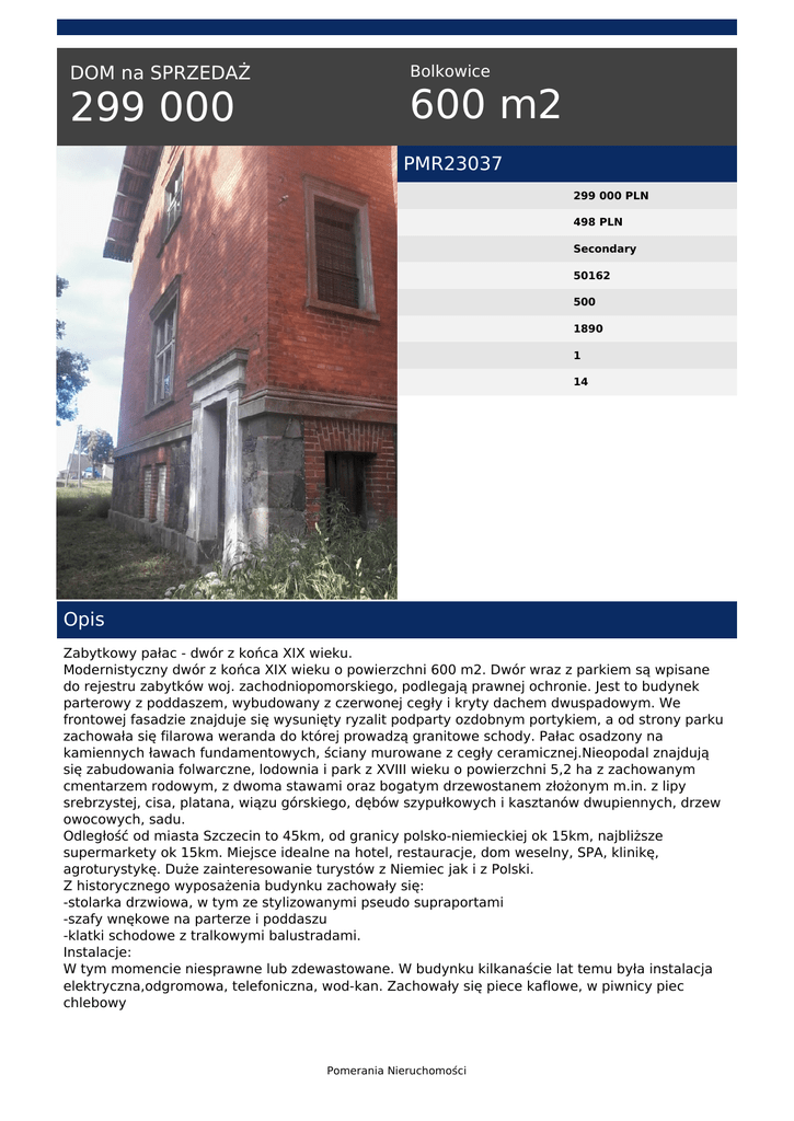 DOM na SPRZEDAŻ 299 000 Bolkowice 600 m2 PMR23037 299 000 PLN 498 PLN Secondary 50162 500 1890 1 14 Opis Zabytkowy pałac - dwór z końca XIX wieku. Modernistyczny dwór z końca XIX wieku o powierzchni 600 m2. Dwór wraz z parkiem są wpisane do rejestru zabytków woj. zachodniopomorskiego, podlegają prawnej ochronie. Jest to budynek parterowy z poddaszem, wybudowany z czerwonej cegły i kryty dachem dwuspadowym. We frontowej fasadzie znajduje się wysunięty ryzalit podparty ozdobnym portykiem, a od strony parku zachowała się filarowa weranda do której prowadzą granitowe schody. Pałac osadzony na kamiennych ławach fundamentowych, ściany murowane z cegły ceramicznej.Nieopodal znajdują się zabudowania folwarczne, lodownia i park z XVIII wieku o powierzchni 5,2 ha z zachowanym cmentarzem rodowym, z dwoma stawami oraz bogatym drzewostanem złożonym m.in. z lipy srebrzystej, cisa, platana, wiązu górskiego, dębów szypułkowych i kasztanów dwupiennych, drzew owocowych, sadu. Odległość od miasta Szczecin to 45km, od granicy polsko-niemieckiej ok 15km, najbliższe supermarkety ok 15km. Miejsce idealne na hotel, restauracje, dom weselny, SPA, klinikę, agroturystykę. Duże zainteresowanie turystów z Niemiec jak i z Polski. Z historycznego wyposażenia budynku zachowały się: -stolarka drzwiowa, w tym ze stylizowanymi pseudo supraportami -szafy wnękowe na parterze i poddaszu -klatki schodowe z tralkowymi balustradami. Instalacje: W tym momencie niesprawne lub zdewastowane. W budynku kilkanaście lat temu była instalacja elektryczna,odgromowa, telefoniczna, wod-kan. Zachowały się piece kaflowe, w piwnicy piec chlebowy Pomerania Nieruchomości Gorąco zapraszam na prezentację osoby zainteresowane ponieważ zdjęcia nie oddają ogromu i piękna tego niespotykanego obiektu. "Przegląd możliwości na postawie SOOP RPO (http://rpo.wzp.pl/sites/default/files/pliki/soop_8_0_20160510.pdf) Działanie 9.3 dedykowane rewitalizacji terenów i obiektów działanie 1.6 dedykowane tworzeniu nowych miejsc pracy na obszarze SSW - Widuchowa jest zakwalifikowana do obszaru SPecjalnej Strefy Włączenia (czyli tej zapóźnionej). Kwoty: 2mln + 200tys za każde następne miejsce pracy powyżej 10 etatów. Dofinansowanie max 55% dla MSP; brak ograniczeń czy inwestycyjny czy szkoleniowy (100% cross financingu) Nabór: nie w 2016 (nie ma daty w harmonogramie naborów) (Opracowanie przy współpracy z Urzędem Marszałkowskim Ewa Syrenicz-Tryburska POMERANIA NIERUCHOMOŚCI) Zapytaj naszego maklera o BEZPŁATNE doradztwo przy uzyskaniu KREDYTU. Współpracujemy z wieloma bankami i mamy doświadczenie w przeprowadzaniu transakcji z uwzględnieniem warunków kredytowych. Dane nie stanowią oferty handlowej w rozumieniu art. 66,§ 1 Kodeksu Cywilnego. Szczegółowych informacji udziela Biuro Nieruchomości Pomerania . Ewa Syrenicz - Tryburska tel. 535630640, 913508888 email: [email protected] Pomerania Nieruchomości Powered by TCPDF (www.tcpdf.org)