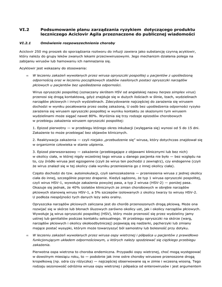 VI.2 Podsumowanie planu zarządzania ryzykiem dotyczącego produktu leczniczego Aciclovir Agila przeznaczone do publicznej wiadomości VI.2.1 Omówienie rozpowszechnienia choroby Aciclovir 250 mg proszek do sporządzania roztworu do infuzji zawiera jako substancję czynną acyklowir, który należy do grupy leków zwanych lekami przeciwwirusowymi. Jego mechanizm działania polega na zabijaniu wirusów lub hamowaniu ich namnażania się. Acyklowir jest wskazany do stosowania: • W leczeniu zakażeń wywołanych przez wirusa opryszczki pospolitej u pacjentów z upośledzoną odpornością oraz w leczeniu początkowych stadiów nasilonych postaci opryszczki narządów płciowych u pacjentów bez upośledzenia odporności. Wirus opryszczki pospolitej (oznaczany skrótem HSV od angielskiej nazwy herpes simplex virus) przenosi się drogą kontaktową, gdyż znajduje się w dużych ilościach w ślinie, łzach, wydzielinach narządów płciowych i innych wydzielinach. Zdecydowanie najczęściej do zarażenia się wirusem dochodzi w wyniku pocałowania przez osobę zakażoną. U osób bez upośledzenia odporności ryzyko zarażenia się wirusem opryszczki pospolitej w wyniku kontaktu ze skażonymi tym wirusem wydzielinami może sięgać nawet 80%. Wyróżnia się trzy rodzaje epizodów chorobowych w przebiegu zakażenia wirusem opryszczki pospolitej: 1. Epizod pierwotny — w przebiegu którego okres inkubacji (wylęgania się) wynosi od 5 do 15 dni. Zakażenie to może przebiegać bez objawów klinicznych. 2. Reaktywacja zakażenia — czyli niejako „przebudzenie się” wirusa, który dotychczas znajdował się w organizmie człowieka w stanie uśpienia. 3. Epizod pierwszorazowy — zakażenie (przebiegające z objawami klinicznymi lub bez nich) w okolicy ciała, w której nigdy wcześniej tego wirusa u danego pacjenta nie było — bez względu na to, czy źródło wirusa jest egzogenne (czyli że wirus ten pochodzi z zewnątrz), czy endogenne (czyli że wirus znalazł się w tej okolicy ciała wyniku przeniesienia go z innej okolicy ciała). Często dochodzi do tzw. autoinokulacji, czyli samozakażenia — przeniesienia wirusa z jednej okolicy ciała do innej, szczególnie poprzez drapanie. Kiedyś sądzono, że typ 1 wirusa opryszczki pospolitej, czyli wirus HSV-1, wywołuje zakażenia powyżej pasa, a typ 2 wirusa (HSV-2) — poniżej pasa. Okazuje się jednak, że 40% izolatów klinicznych ze zmian chorobowych w obrębie narządów płciowych stanowią wirusy HSV-1, a 5% szczepów izolowanych z okolicy twarzy to wirusy HSV-2. U podłoża niespójności tych danych leży seks oralny. Opryszczka narządów płciowych zaliczana jest do chorób przenoszonych drogą płciową. Może ona rozwijać się w skórze lub błonach śluzowych zarówno okolicy ust, jak i okolicy narządów płciowych. Wywołuje ją wirus opryszczki pospolitej (HSV), który może przenosić się przez wydzieliny jamy ustnej lub genitaliów podczas kontaktu seksualnego. W przebiegu opryszczki na skórze (warg, narządów płciowych i okolicy okołoodbytniczej) pojawiają się nadżerki, pęcherzyki lub zmiany mające postać wysypki, którym może towarzyszyć ból samoistny lub bolesność przy dotyku. • W leczeniu zakażeń wywołanych przez wirusa ospy wietrznej i półpaśca u pacjentów z prawidłowo funkcjonującym układem odpornościowym, u których należy spodziewać się ciężkiego przebiegu zakażenia. Pierwotna ospa wietrzna to choroba endemiczna. Przypadki ospy wietrznej, choć mogą występować w dowolnym miesiącu roku, to — podobnie jak inne ostre choroby wirusowe przenoszone drogą kropelkową (np. odra czy różyczka) — najczęściej obserwowane są w zimie i wczesną wiosną. Tego rodzaju sezonowość odróżnia wirusa ospy wietrznej i półpaśca od enterowirusów i jest argumentem wskazującym na to, że wirus ten przenosi się głównie drogą kropelkową. Półpasiec z kolei występuje sporadycznie i nie cechuje się sezonowością. Ospa wietrzna to typowa choroba wieku dziecięcego ze szczytem zachorowań między 4. a 10. rokiem życia. Podobnie jak różyczka niezbyt często występuje ona u dzieci w wieku przedszkolnym. Ospa wietrzna to choroba wysoce zaraźliwa — w przypadku bliskiego kontaktu z osobą chorą prawdopodobieństwo zarażenia się sięga 90%. Choć u większości osób do zakażenia dochodzi przed osiągnięciem wieku dorosłego, to 10% populacji młodych dorosłych nadal wykazuje podatność na zakażenie. Ten wzorzec zakażenia nie jest jednak uniwersalny, gdyż np. na obszarach wiejskich Indii na ospę wietrzną chorują głównie dorośli, a średnia wieku w momencie zakażenia wynosi 23,4 roku. Wysunięto sugestię, iż może to być spowodowane interferencją innych wirusów powodujących zakażenia dróg oddechowych, na które dzieci narażone są we wczesnych latach swojego życia. • W leczeniu opryszczkowego zapalenia mózgu. Zapalenie mózgu często poprzedza pojawienie się nieswoistego zespołu objawów prodromalnych (czyli zwiastunowych) obejmującego bóle głowy, stan podgorączkowy, dreszcze, ogólne złe samopoczucie, brak apetytu, wymioty i ból brzucha. Żaden z tych objawów nie jest swoisty, a wszystkie one występują też w wielu innych chorobach zakaźnych. • W leczeniu zakażeń wywołanych przez wirusa opryszczki pospolitej u noworodków i u niemowląt w wieku do 3 miesięcy. Zakażenie wirusem opryszczki pospolitej to jedna z najczęściej występujących na świecie wirusowych chorób przenoszonych drogą płciową. Pierwszorazowe zakażenie u kobiety ciężarnej może mieć ciężki przebieg i wiązać się z przeniesieniem wirusa na płód lub noworodka. Ponieważ częstość występowania tej choroby przenoszonej drogą płciową stale rośnie, a do zakażenia wirusem opryszczki pospolitej najczęściej dochodzi u kobiet w wieku rozrodczym, ryzyko przeniesienia wirusa z organizmu matki na organizm płodu lub noworodka stało się is
