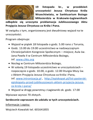 19 listopada br., w przeddzień uroczystości Jezusa Chrystusa Króla Wszechświata, w Sanktuarium Bożego Miłosierdzia w Krakowie-Łagiewnikach odbędzie się uroczysta proklamacja Jubileuszowego Aktu Przyjęcia Jezusa Chrystusa za Króla i Pana. W związku z tym, organizowany jest dwudniowy wyjazd na te uroczystości. Program obejmuje: Wyjazd w piątek 18 listopada o godz. 5.00 rano z Torunia, Godz. 13.00 do 19.00 uczestnictwo w nadzwyczajnym Chrześcijańskim Kongresie Społecznym – miejsce; Aula św. Jana Pawła II w Centrum Miłosierdzia Bożego, inf. www.chks.org Nocleg w Centrum Miłosierdzia Bożego, W sobotę 19 listopada uczestnictwo w uroczystościach – rozpoczęcie o godz. 10.00, o godz. 12.00 liturgia Mszy św. z Aktem Przyjęcia Jezusa Chrystusa za Króla i Pana, inf. www.intronizacja.pl , http://episkopat.pl/list-pasterskiepiskopatu-przed-jubileuszowym-aktem-przyjecia-jezusaza-krola-i-pana/ Wyjazd w drogę powrotną z Łagiewnik ok. godz. 17.00 Wpisowe wynosi 70 złotych. Serdecznie zapraszam do udziału w tych uroczystościach. Informacje i zapisy: Wojciech Kowalski tel. 601641855