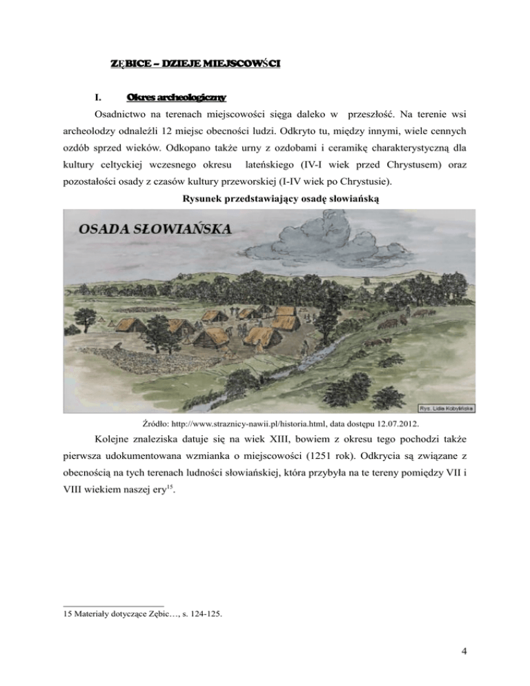 ZĘBICE – DZIEJE MIEJSCOWŚCI I. Okres archeologiczny Osadnictwo na terenach miejscowości sięga daleko w przeszłość. Na terenie wsi archeolodzy odnaleźli 12 miejsc obecności ludzi. Odkryto tu, między innymi, wiele cennych ozdób sprzed wieków. Odkopano także urny z ozdobami i ceramikę charakterystyczną dla kultury celtyckiej wczesnego okresu lateńskiego (IV-I wiek przed Chrystusem) oraz pozostałości osady z czasów kultury przeworskiej (I-IV wiek po Chrystusie). Rysunek przedstawiający osadę słowiańską Źródło: http://www.straznicy-nawii.pl/historia.html, data dostępu 12.07.2012. Kolejne znaleziska datuje się na wiek XIII, bowiem z okresu tego pochodzi także pierwsza udokumentowana wzmianka o miejscowości (1251 rok). Odkrycia są związane z obecnością na tych terenach ludności słowiańskiej, która przybyła na te tereny pomiędzy VII i VIII wiekiem naszej ery15. 15 Materiały dotyczące Zębic…, s. 124-125. 4