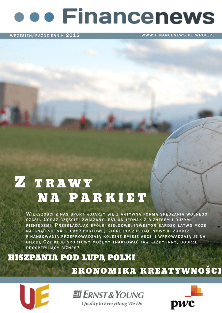 WRZESI EŃ /PAŹDZI ERN I K Z 2 0 12 WWW. FI N AN CEN EWS. U E. WROC. PL TRAWY NA PARKIET WI ĘKS ZO Ś CI Z N AS S P O R T KO J AR ZY S I Ę Z AKTYWN Ą FO R M Ą S P ĘD ZAN I A WO LN E G O C Z A S U . C O R A Z C Z Ę Ś C I E J Z W I ĄZ A N Y J E S T O N J E D N A K Z B I Z N E S E M I D U Ż Y M I P I E N I Ę D Z M I . P R Z E G L ĄD A J ĄC S P Ó Ł K I G I E Ł D O W E , I N W E S T O R B A R D Z O Ł A T W O M O Ż E N A T K N ĄĆ S I Ę N A K L U B Y S P O R T O W E , K T Ó R E P O S Z U K U J ĄC N O W Y C H Ź R Ó D E Ł FI N AN SOWAN I A PRZEPROWADZAJ Ą KOLEJ N E EM I SJ E AKCJ I I WPROWADZAJ Ą J E N A G I E ŁD Ę C ZY KLU B S P O R TO WY M O ŻE M Y TR AKTO WAĆ J AK KAŻD Y I N N Y, D O B R ZE P R O S P E R U J ĄC Y B I Z N E S ? HISZPANIA POD LUPĄ POLKI E KONOMI KA KRE ATYWNOŚCI W TYM NUMERZE kontrargumenty 5 hiszpania pod lupą polki 6 nowości w bankowości 8 ekonomika kreatywności 10 efekt barceloński 12 patenty są passé 13 ile warte jest drzewo? 14 wycena klubu sportowego 16 z trawy na parkiet 19 kryzys w budowlance 21 podatek od zysków giełdowych 23 FSO - bo by było... 24 Po studiach należy się praca 25 zarobki po studiach 26 O hiszpańskim kryzysie mówi się w mediach coraz częściej i więcej. Hiszpania jest zadłużona po uszy i w nowych reformach szuka rozwiązania, które pomoże jej nie powielić losu Greków. Jednak jak kryzys wygląda w praktyce? Czy chcielibyście zarabiać wydając swoje pieniądze? Co powiecie na wypłatę z bankomatu bez użycia karty? Co zyskuje bank pogłębiając naszą wiedzę na temat zarządzania finansami? Czy przyszłe pokolenia będą znały jeszcze poczciwą świnkę skarbonkę? Po organizacji igrzysk olimpijskich w 1992 roku, Barcelona, miasto z europejskiej drugiej ligi , z wielkim hukiem weszło do ścisłej czołówki europejskich centrów turystyki i biznesu. Ludzie, którzy przyjechali do tego miasta z okazji igrzysk olimpijskich wywieźli bardzo dobre wspomnienia i zapragnęli tam wrócić. Niewtajemniczonych zapewne zdziwi fakt, iż przez giełdy przewinęło się całkiem sporo drużyn. W 1983 roku drogę przetarł angielski Tottenham Hotspur. Pod koniec 2007 roku w samej Wielkiej Brytanii notowanych było 26 klubów. Polskie prawo podatkowe reguluje obowiązek płacenia podatku od zysków każdego inwestora giełdowego. Początkujący gracze zatem zadają sobie pytania: Jak to zrobić? Jak się go oblicza? Październik to czas powrotu na uczelnię - wszyscy, niezależnie od studenckiego stażu, jesteśmy tu po to, by w przyszłości zwiększyć swoje szanse na rynku pracy. Na dobry początek roku akademickiego zainteresowaliśmy się zarobkami osób po studiach. słowo wstępu GŁOSUJESZ GOTÓWKĄ. Wybory odbywają się znacznie częściej, niż raz na cztery lata. Głosujemy każdego dnia, wybierając rzeczywistość która będzi nas otaczała. Ale zamiast głosu do urny, oddajemy kasjerce pieniądze. Przyznam, trudno jest dostrzec związek pomiędzy codziennymi zakupami a sytuacją geopolityczną bądź kondycją społeczeństwa. Jednak idąc po nitce do kłębka, dostrzeżemy, że każdy wybór w który wplątane są nasze pieniądze jest w istocie głosem za lub przeciw. Za lub przeciw czemu, spytacie. Odpowiem przykładowo : jakie jest Wasze podejście do natury? Chcecie ją chronić czy uważacie, że nie ma nic złego w czerpaniu z niej? Swoje zdanie nieświadomie wyrażacie przy każdych zakupach, choćby w sytuacji gdy macie do wyboru skórę sztuczną i prawdziwą. Nie jest przypadkiem, że coraz więcej firm tworzy linie produktów „eko”, chwali się certyfikatami Greenpeace czy stara się przy produkcji nie szkodzić środowisku. Dyrektorzy zauważyli, że znaczek „eko” przyciąga klientów i zwiększa zyski. Dlatego uwzględniają to w swoich strategiach. Twój głos zadziałał, świat staje się bardziej przyjazny środowisku. Inny przykład : narzekamy, że wędliny i mięsa są pełne chemikaliów, sztuczne, oszukane. Ale jako społeczeństwo jesteśmy sami sobie winni – idąc do sklepu, wybieramy cenę nad jakość. Dyrektorzy i prezesi widzą, że droższe produkty radzą sobie gorzej i wychodzą naprzeciw oczekiwaniom konsumentów, wtłaczając w mięsa jeszcze więcej wody, żeby były tańsze. Niestety, rynku nie da się oszukać. Popyt determinuje to, jak zachowują się przedsiębiorcy. Jeśli będziemy unikać produktów firm, których zachowania nie popieramy, to w obliczu spadku zysków będą zmuszeni się zmienić. Jesteś przeciwny wyzyskowi w Foxconn? Nie kupuj Apple. Chcesz, żebyśmy rozwijali alternatywne źródła energii? Kup auto hybrydowe. Jesteś przeciwny umowom śmieciowym? Starannie dobieraj zakupy. Hubert Guzera redaktor naczelny Redakcj a magazynu Finance News Redaktor naczelny Hubert Guzera • Zastępca redaktora naczelnego Jakub Mazurek Oprawa merytoryczna dr Bogusław Półtorak | dr Wawrzyniec Michalczyk Skład DTP Kuba Wozowczyk Redaktorzy wydania Anna Skopowska | Weronika Burlińska | Aleksandra Ej fler | Anna Diduch | Maciej Stasiewicz | Hubert Guzera | Marcin Mosiądź | Damian Słomski | Mateusz Zubin | Karolina Czerwińska | Piotr Korzeniowski | Kamil Kania | Michał Żuławiński Dystrybucj a Maciej Stasiewicz | Agnieszka Sowińska Marketing Piotr Korzeniowski | Ola Podcerkiewny • Finanse i administracj a Rafał Nowak Kontakty zewnętrzne Monika Perucka • eventy Michał Szczurek | Anna Skopowska HR Anna Żurek Adres Uniwersytet Ekonomiczny we Wrocławiu , Magazyn Finance News ul. Komandorska 118/120 , 53-345 Wrocław financenewsUE@gmail. com www. financenews. ue. wroc. pl Pay as you go ! Wielu studentów narzeka na studiowanie w Polsce. Twierdzenia o niepraktyczności studiów, uczeniu teorii itd. są powszechne. Z częścią zarzutów można się oczywiście zgodzić, ale wszystko zależy od uczelni i wydziału. Pojawia się bardzo istotne pytanie czy studia mają być praktyczne, co zresztą nie jest pytaniem oczywistym, bo 