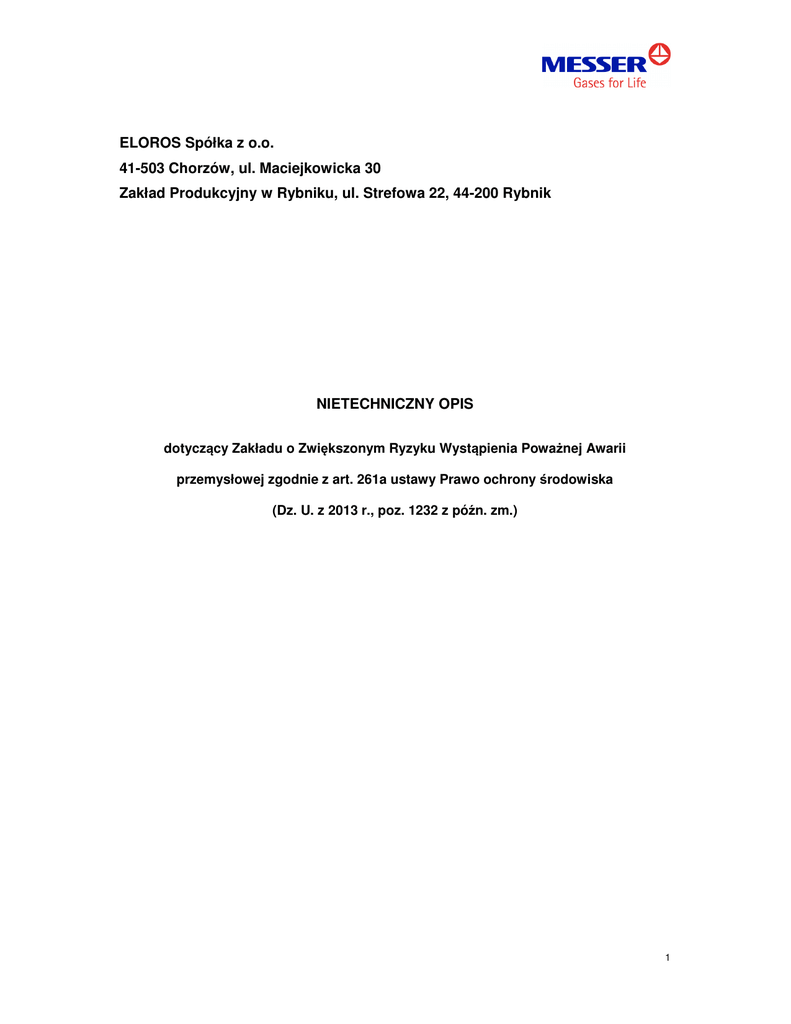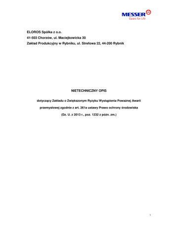 ELOROS Spółka z o.o. 41-503 Chorzów, ul. Maciejkowicka 30 Zakład Produkcyjny w Rybniku, ul. Strefowa 22, 44-200 Rybnik NIETECHNICZNY OPIS dotyczący Zakładu o Zwiększonym Ryzyku Wystąpienia Poważnej Awarii przemysłowej zgodnie z art. 261a ustawy Prawo ochrony środowiska (Dz. U. z 2013 r., poz. 1232 z późn. zm.) 1 1. Oznaczenie prowadzącego zakład. Dane firmy: ELOROS Sp. z o. o. ul. Maciejkowicka 30 41-503 Chorzów REGON: 140640449 NIP: 525-23-72-100 tel.: +48 32 73 62 064; fax: +48 32 77 26 115 e-mail: [email protected] www.eloros.pl Adres zakładu: ELOROS Sp. z o.o. Zakład Produkcyjny w Rybniku ul. Strefowa 22 44-207 Rybnik Kierujący zakładem: Tadeusz Mateja ul. Strefowa 22 44-207 Rybnik tel.: +48 32 73 91 910, fax.: +48 32 73 91 911 2. Kategoria zakładu. Zgodnie z Rozporządzeniem Ministra Rozwoju z dnia 29 stycznia 2016 roku w sprawie rodzajów i ilości znajdujących się w zakładzie substancji niebezpiecznych, decydujących o zaliczeniu zakładu o zwiększonym lub dużym ryzyku wystąpienia poważnej awarii przemysłowej (Dz. U. 2016 poz. 138), Eloros Sp. z o.o. 41-503 Chorzów, ul. Maciejkowicka 30, Zakład w Rybniku, ul. Strefowa 22 zalicza się do kategorii zakładów o Zwiększonym Ryzyku Wystąpienia Poważnej Awarii Przemysłowej (ZZR). Eloros Sp. z o.o. 41-503 Chorzów, ul. Maciejkowicka 30, Zakład w Rybniku, ul. Strefowa 22 dokonał zgłoszenia oraz przekazał program zapobiegania awariom właściwym organom zgodnie z art. 250 ust. 1 ustawy Prawo ochrony środowiska (Dz. U. z 2013 r., poz. 1232 z późn. zm.). 2 3. Opis działalności zakładu. Eloros Sp. z o.o. 41-503 Chorzów, ul. Maciejkowicka 30, Zakład w Rybniku, ul. Strefowa 22 zajmuje się produkcją gazów pochodzących z niskotemperaturowego rozdziału powietrza atmosferycznego, w wyniku czego otrzymuje się azot, tlen oraz argon. Końcowe produkty wytwarzane w zakładzie są gazami skroplonymi, silnie schłodzonymi, przechowywanymi w izolowanych termicznie zbiornikach magazynowych. Odbiór produktów realizowany jest za pomocą specjalistycznych cystern drogowych. 4. Charakterystyka składowanych na terenie zakładu substancji decydujących o zaliczeniu zakładu do zakładów o zwiększonym ryzyku wystąpienia poważnej awarii przemysłowej oraz krótki opis procesów, które mają miejsce na terenie zakładu z ich udziałem. Charakterystyka: Nazwa substancji/mieszaniny: Tlen Kategoria: Substancja utleniająca (P4 – Gazy utleniające) Rodzaj zagrożenia: Może spowodować lub intensyfikować pożar; utleniacz. Produkcja tlenu skroplonego silnie schłodzonego: Proces produkcji polega na silnym schłodzeniu powietrza atmosferycznego oraz rozdziale skroplonego gazu w specjalnej kolumnie rektyfikacyjnej na czyste produkty, między innymi tlen, który przesyłany jest systemem rurociągów do zbiornika magazynowego. Magazynowanie: Gazy są magazynowane w izolowanych termicznie zbiornikach magazynowych. Napełnianie cystern drogowych: Produkt skroplony, silnie schłodzony, ma postać cieczy o barwie błękitnej, która wrze w temperaturze minus 183°C. Proces napełniania prowadzony jest przy pomocy zespołu urządzeń spełniających najwyższe wymagania w zakresie bezpieczeństwa, przez personel systematycznie szkolony w zakresie umiejętności obsługi i reagowania na sytuacje awaryjne. Stanowiska wyposażone są w systemy całkowicie zabezpieczające ewentualne wycieki na skutek błędów personelu (tzw. zawory zrywalne) oraz system kontroli kierowcy, wymuszający jego stałą obecność w trakcie całego procesu, który w przypadku wykrycia braku reakcji kierowcy na sygnały systemu wyłącza automatycznie proces napełniania i informuje o tym obsługę instalacji. 3 Informacje dodatkowe: − ewentualne widzialne w okolicy cystern i innych urządzeń technologicznych krótkotrwałe "chmury" silnie schłodzonych gazów mają nieistotną z punktu widzenia zagrożeń dla ludzi i środowiska objętość i są efektem bezpośredniego kontaktu silnie schłodzonego gazu z powietrzem atmosferycznym. − efekt oszronienia i "parowania" elementów instalacji to również efekt wizualny wynikający ze zmiany stanu skupienia pary wodnej zawartej w powietrzu przy bezpośrednim kontakcie ze schłodzonymi elementami urządzeń i instalacji. 5. Informacje dotyczące sposobów ostrzegania i postępowania społeczeństwa w przypadku wystąpienia awarii przemysłowej, uzgodnione z właściwymi organami Państwowej Straży Pożarnej. W przypadku wystąpienia awarii przemysłowej przewiduje się wykorzystanie specjalistycznych sił i środków Państwowej Straży Pożarnej. Zgodnie z zapisami Planu Zapobiegania Poważnym Awariom Przemysłowym oraz Instrukcji Bezpieczeństwa Pożarowego, w przypadku wystąpienia poważnej awarii przemysłowej obowiązuje następująca procedura postępowania: − Identyfikacja zagrożenia, − Powiadomienie zewnętrznych służb ratowniczych, w tym jednostki Państwowej Straży Pożarnej, − Wyłączenie zasilania oraz ogłoszenie alarmu i ewakuacja. Dalsze postępowanie odbywa się zgodnie z wytycznymi dowódcy Akcji RatowniczoGaśniczej Państwowej Straży Pożarnej. Zgodnie z Zarządzeniem Nr 237/2014 Prezydenta Miasta Rybnika z dnia 16 maja 2014 r. Zakład jest zakwalifikowany do przedsiębiorstw przewidzianych do prowadzenia przygotowań i realizacji przedsięwzięć w zakresie Obrony Cywilnej na terenie Miasta Rybnika i realizuje procedury Wydziału Zarządzania Kryzysowego Urzędu Miasta Rybnika m.in. w zakresie organizacji monitorowania zagrożeń, ostrzegania i alarmowania oraz organizacji ewakuacji ludności. 4