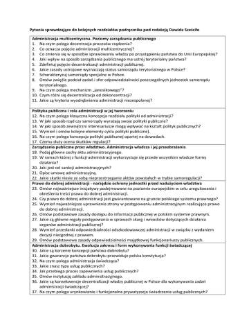 Pytania sprawdzające do kolejnych rozdziałów podręcznika pod redakcją Dawida Sześciło Administracja multicentryczna. Poziomy zarządzania publicznego 1. Na czym polega decentracja procesów rządzenia? 2. Co oznacza pojęcie administracji multicentrycznej? 3. Co zmienia się w sposobie sprawowaniu władzy po przystąpieniu państwa do Unii Europejskiej? 4. Jaki wpływ na sposób zarządzania publicznego ma ustrój terytorialny państwa? 5. Zdefiniuj pojęcie decentralizacji administracji publicznej. 6. Jakie zasady ustrojowe wyznaczają status samorządu terytorialnego w Polsce? 7. Scharakteryzuj samorządy specjalne w Polsce. 8. Omów zwięźle podział zadań i sfer odpowiedzialności poszczególnych jednostek samorządu terytorialnego. 9. Na czym polega mechanizm „janosikowego”? 10. Czym różni się decentralizacja od dekoncentracji? 11. Jakie są kryteria wyodrębnienia administracji niezespolonej? Polityka publiczna i rola administracji w jej tworzeniu 12. Na czym polega klasyczna koncepcja rozdziału polityki od administracji? 13. W jaki sposób rząd czy samorządy wyrażają swoje polityki publiczne? 14. W jaki sposób zewnętrzni interesariusze mogą wpływać na kształt polityk publicznych? 15. Wymień i omów kolejne elementy cyklu polityki publiczne). 16. Na czym polega koncepcja polityki publicznej opartej na dowodach. 17. Czemu służy ocena skutków regulacji? Zarządzanie publiczne przez władztwo. Administracja władcza i jej przeobrażenia 18. Podaj główne cechy aktu administracyjnego. 19. W ramach której z funkcji administracji wykorzystuje się przede wszystkim władcze formy działania? 20. Jaki jest cel sankcji administracyjnych? 21. Opisz umowę administracyjną. 22. Jakie skutki niesie ze sobą nieprzestrzeganie aktów powstałych w trybie samoregulacji? Prawo do dobrej administracji - narzędzie ochrony jednostki przed nadużyciem władztwa 23. Omów najważniejsze inicjatywy podejmowane na poziomie europejskim w celu uregulowania i określenia treści prawa do dobrej administracji. 24. Czy prawo do dobrej administracji jest gwarantowane na gruncie polskiego systemu prawnego? 25. Wymień najważniejsze uprawnienia strony w postępowaniu administracyjnym realizujące prawo do dobrej administracji. 26. Omów podstawowe zasady dostępu do informacji publicznej w polskim systemie prawnym. 27. Jakie są główne reguły postępowania w sprawach skarg i wniosków dotyczących działania organów administracji publicznej? 28. Wymień przesłanki odpowiedzialności odszkodowawczej administracji w związku z wydaniem decyzji niezgodnej z prawem. 29. Omów podstawowe zasady odpowiedzialności majątkowej funkcjonariuszy publicznych. Administracja dobrobytu. Ewolucja zakresu i form wykonywania funkcji świadczącej 30. Jakie są korzenie koncepcji państwa dobrobytu? 31. Jakie gwarancje państwa dobrobytu przewiduje polska konstytucja? 32. Na czym polega administracja świadcząca? 33. Jakie znasz typy usług publicznych? 34. Jak przebiega proces zapewnienia usług publicznych? 35. Omów instytucję zakładu administracyjnego. 36. Jakie są konsekwencje decentralizacji władzy publicznej w Polsce dla wykonywania zadań administracji świadczącej? 37. Na czym polega urynkowienie i funkcjonalna prywatyzacja świadczenia usług publicznych? Mechanizmy rynkowe jako główna metoda zapewnienia usług publicznych 38. Na czym polega urynkowienie i prywatyzacja usług publicznych? 39. Opisz główne tryby kontraktowania usług publicznych przez jednostki samorządu terytorialnego w Polsce. 40. Czy w polskim prawie występuje obowiązkowy outsourcing usług publicznych? 41. Opisz główne schematy (modele) partnerstwa publiczno-prywatnego. 42. Jak przebiega realizacja przedsięwzięcia PPP na podstawie ustawy o partnerstwie publicznoprywatnym? 43. Omów typy voucherów na usługi publiczne. 44. Omów przykład programu voucherowego w wybranym sektorze usług publicznych. 45. Które sektory usług publicznych w Polsce funkcjonują w oparciu o model zbliżony do voucherów? 46. Jakie są główne zagrożenia i niedoskonałości mechanizmów rynkowych w zapewnieniu usług publicznych? Zarządzanie przez rezultaty. Administracja zorientowana na wyniki 47. Na czym polega zarządzanie przez rezultaty w administracji publicznej? 48. Czym różni się zarządzanie przez rezultaty od zarządzania zorientowanego na procesy i procedury? 49. Jak definiuje się rezultaty w systemie performance management? 50. Czym różni się budżet zadaniowy od tradycyjnej metody tworzenia i wykonywania budżetów publicznych? 51. Na czym polega system kontroli zarządczej w polskiej administracji publicznej? 52. Czy w jednostkach samorządu terytorialnego funkcjonuje system kontroli zarządczej? 53. Przedstaw konstrukcję budżetu zadaniowego w Polsce. Zarządzanie zasobami ludzkimi w administracji publicznej 54. Podaj cechy charakterystyczne modelu kariery. 55. Jakie są wady modelu kariery? 56. Podaj cechy charakterystyczne modelu pozycyjnego. 57. Jakie są wady modelu pozycyjnego? 58. Wymień cechy charakterystyczne modelu służby cywilnej w Polsce. 59. Opisz zasady mianowania i status urzędnika służby cywilnej. 60. Omów status pracownika samorządowego. 61. Wymień podstawowe założenia „Strategii Zarządzania Zasobami Ludzkimi w Służbie Cywilnej do 2020 roku”. 62. Wymień przykłady zachowań nieetycznych urzędników. 63. Wymień siedem Zasad Nolana. Rewolucja technologiczna w zarządzaniu publicznym. E-administracja 64. Podaj definicję rejestru publicznego i trzy przykłady rejestrów publicznych. 65. Jakie główne funkcje spełniają technologie informatyczne w administracji publicznej? 66. Czym jest i jakie informacje zawiera Biuletyn Informacji Publicznej? 67. Jakie dokumenty powinien opracować administrator danych osobowych? 68. Jakie zagrożenia wiążą się z przetwarzaniem danych w modelu cloud computing. Nowa formuła kontroli w administracji. Od klasycznej kon