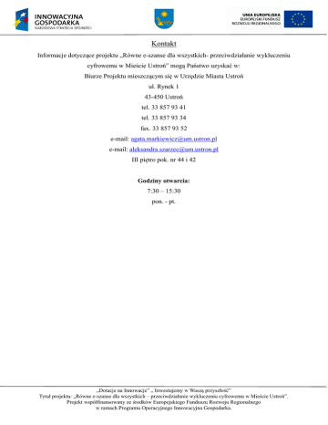 Kontakt Informacje dotyczące projektu „Równe e-szanse dla wszystkich- przeciwdziałanie wykluczeniu cyfrowemu w Mieście Ustroń” mogą Państwo uzyskać w: Biurze Projektu mieszczącym się w Urzędzie Miasta Ustroń ul. Rynek 1 43-450 Ustroń tel. 33 857 93 41 tel. 33 857 93 34 fax. 33 857 93 52 e-mail: [email protected] e-mail: [email protected] III piętro pok. nr 44 i 42 Godziny otwarcia: 7:30 – 15:30 pon. - pt. „Dotacje na Innowacje” „ Inwestujemy w Waszą przyszłość” Tytuł projektu: „Równe e-szanse dla wszystkich – przeciwdziałanie wykluczeniu cyfrowemu w Mieście Ustroń”. Projekt współfinansowany ze środków Europejskiego Funduszu Rozwoju Regionalnego w ramach Programu Operacyjnego Innowacyjna Gospodarka.