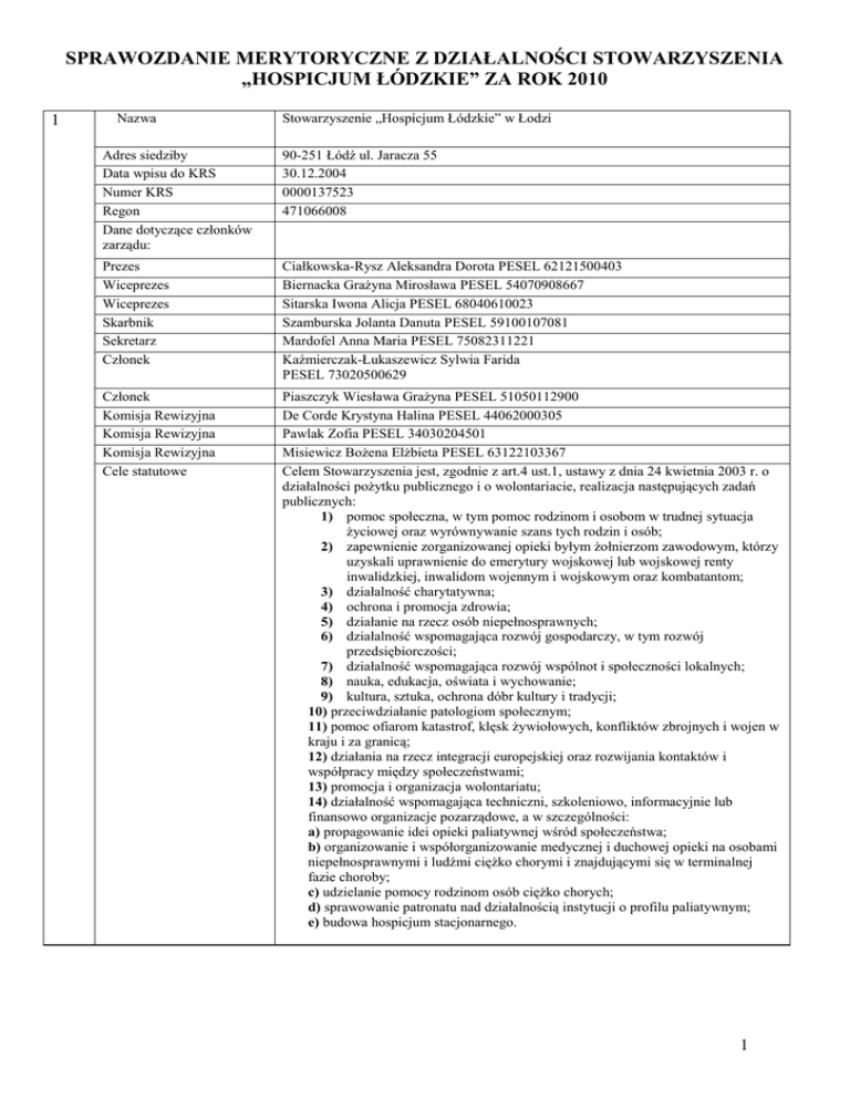SPRAWOZDANIE MERYTORYCZNE Z DZIAŁALNOŚCI STOWARZYSZENIA „HOSPICJUM ŁÓDZKIE” ZA ROK 2010 1 Nazwa Stowarzyszenie „Hospicjum Łódzkie” w Łodzi Adres siedziby Data wpisu do KRS Numer KRS Regon Dane dotyczące członków zarządu: 90-251 Łódź ul. Jaracza 55 30.12.2004 0000137523 471066008 Prezes Wiceprezes Wiceprezes Skarbnik Sekretarz Członek Ciałkowska-Rysz Aleksandra Dorota PESEL 62121500403 Biernacka Grażyna Mirosława PESEL 54070908667 Sitarska Iwona Alicja PESEL 68040610023 Szamburska Jolanta Danuta PESEL 59100107081 Mardofel Anna Maria PESEL 75082311221 Kaźmierczak-Łukaszewicz Sylwia Farida PESEL 73020500629 Członek Komisja Rewizyjna Komisja Rewizyjna Komisja Rewizyjna Cele statutowe Piaszczyk Wiesława Grażyna PESEL 51050112900 De Corde Krystyna Halina PESEL 44062000305 Pawlak Zofia PESEL 34030204501 Misiewicz Bożena Elżbieta PESEL 63122103367 Celem Stowarzyszenia jest, zgodnie z art.4 ust.1, ustawy z dnia 24 kwietnia 2003 r. o działalności pożytku publicznego i o wolontariacie, realizacja następujących zadań publicznych: 1) pomoc społeczna, w tym pomoc rodzinom i osobom w trudnej sytuacja życiowej oraz wyrównywanie szans tych rodzin i osób; 2) zapewnienie zorganizowanej opieki byłym żołnierzom zawodowym, którzy uzyskali uprawnienie do emerytury wojskowej lub wojskowej renty inwalidzkiej, inwalidom wojennym i wojskowym oraz kombatantom; 3) działalność charytatywna; 4) ochrona i promocja zdrowia; 5) działanie na rzecz osób niepełnosprawnych; 6) działalność wspomagająca rozwój gospodarczy, w tym rozwój przedsiębiorczości; 7) działalność wspomagająca rozwój wspólnot i społeczności lokalnych; 8) nauka, edukacja, oświata i wychowanie; 9) kultura, sztuka, ochrona dóbr kultury i tradycji; 10) przeciwdziałanie patologiom społecznym; 11) pomoc ofiarom katastrof, klęsk żywiołowych, konfliktów zbrojnych i wojen w kraju i za granicą; 12) działania na rzecz integracji europejskiej oraz rozwijania kontaktów i współpracy między społeczeństwami; 13) promocja i organizacja wolontariatu; 14) działalność wspomagająca techniczni, szkoleniowo, informacyjnie lub finansowo organizacje pozarządowe, a w szczególności: a) propagowanie idei opieki paliatywnej wśród społeczeństwa; b) organizowanie i współorganizowanie medycznej i duchowej opieki na osobami niepełnosprawnymi i ludźmi ciężko chorymi i znajdującymi się w terminalnej fazie choroby; c) udzielanie pomocy rodzinom osób ciężko chorych; d) sprawowanie patronatu nad działalnością instytucji o profilu paliatywnym; e) budowa hospicjum stacjonarnego. 1 2 Zasady, formy i zakres działalności statutowej W celu realizacji określonych wyżej zadań, Stowarzyszenie stosuje następujące środki: 1) organizuje kursy, konferencje, seminaria dla swych członków i sympatyków, 2) udziela informacji w zakresie swojej działalności statutowej, współdziałając z prasą, radiem, telewizją, wydaje własne wydawnictwa oraz stosuje inne środki w tym zakresie, 3) zbiera środki finansowe potrzebne na realizacje celów Stowarzyszenia. 4) współpracuje z organami władzy publicznej dla realizacji celów statutowych, 5) współpracuje z krajowymi i zagranicznymi instytucjami naukowymi, społecznymi i publicznymi o podobnym zakresie działania, 6) w sposób aktywny wspomaga osoby ciężko chore i ich rodziny, 7) rehabilitacja osób niepełnosprawnych 8) działania na rzecz integracji niepełnosprawnych ze społeczeństwem, 9) podejmuje inne działania niezbędne dla realizacji celów Stowarzyszenia. 3 4 5 Informacja o prowadzonej działalności gospodarczej Odpisy uchwał Walnego Zgromadzenia Stowarzyszenie nie prowadzi działalności gospodarczej. Informacja o wysokości uzyskanych przychodów z wyodrębnieniem ich źródeł W roku sprawozdawczym przychody składały się z: I. wpłaty z NFZ 693.009,20 II. przychody finansowe z lat ubiegłych 486.330,99 III. wpływy z tytułu szkoleń 31.380,00 IV. dotacja RITA 24.618,00 V. licytacja Allegro 1.615,59 VI. dotacja Fundacji BRE BANKU 5.000,00 VII. zbiórki publiczne 9.412,41 VIII. Składki członkowskie 110,00 IX. Darowizny 1% podatku dochodowego od osób fizycznych 80.236,14 likwidacja ROR-ów 9,48 darowizny osób fizycznych – pozostałe 3.578,26 otrzymane darowizny rzeczowe 56.942,48 darowizny pieniężne osoby prawne 7.750,00 X. Badania kliniczne 1.881,67 XI. Refundacja wynagrodzeń z PEFRON 11.254,32 XII. Refundacja wynagrodzeń z Urzędu Pracy 359,01 W załączniku: 1.Uchwała nr 1 z dn. 14.01.2010 r. 2. Uchwała nr 2 z dn. 26.03.2010 r. 3. Uchwała nr 3 z dn. 28.04.2010 r. 4. Uchwała nr 4 z dn. 12.05.2010 r. 5. Uchwała nr 5 z dn. 12.05.2010 r. 6. Uchwała nr 6 z dn. 15.06.2010 r. 7. Uchwała nr 7 z dn. 30.09.2010 r. 8. Uchwała nr 8 z dn. 15.11.2010 r. 9. Uchwała nr 9 z dn. 16.12.2010 r. 10. Uchwała nr 10 z dn. 16.12.2010 r. Przychody finansowe (odsetki bankowe) 6.808,01 Pozostałe przychody (drobne różnice w zapłacie, równowartość odpisów amortyzacyjnych) 10.411,04 Razem przychody: 1.430.706,60 2 6 Informacje o poniesionych kosztach 7 Dane o: a Liczba zatrudnionych Koszty: Realizacja działalności statutowej 664.829,27 Koszty administracyjne240.143,07 Pozostałe koszty operacyjne 0,69 Koszty finansowe 24,56 -----------------------------Razem koszty 904.997,59 zł Liczba zatrudnionych na 31.XII.2010 r. - umowa o pracę – 9 osób - umowy zlecone – 17 osób b c d e f g h i j Łączna kwota wynagrodzeń, bez prac zleconych Wysokość przeciętnego wynagrodzenia/mc Wydatki na wynagrodzenie z umów-zleceń Udzielone pożyczki pieniężne Kwoty ulokowane na rachunkach bankowych Wartości nabytych obligacji i akcji Nabyte nieruchomości Nabyte pozostałe środki trwałe Wartość aktywów i zobowiązań 273.424,09 zł 3.108,50 zł 178.238,15 zł 0 - rachunek lokata FORTIS 31.XII.2010 - rachunek bieżący PKO BP 31.XII.2010. - rachunek bieżący FORTIS 31.XII.2010 - 270.000,00 - 127.877,93 - 19.032,83 0 
