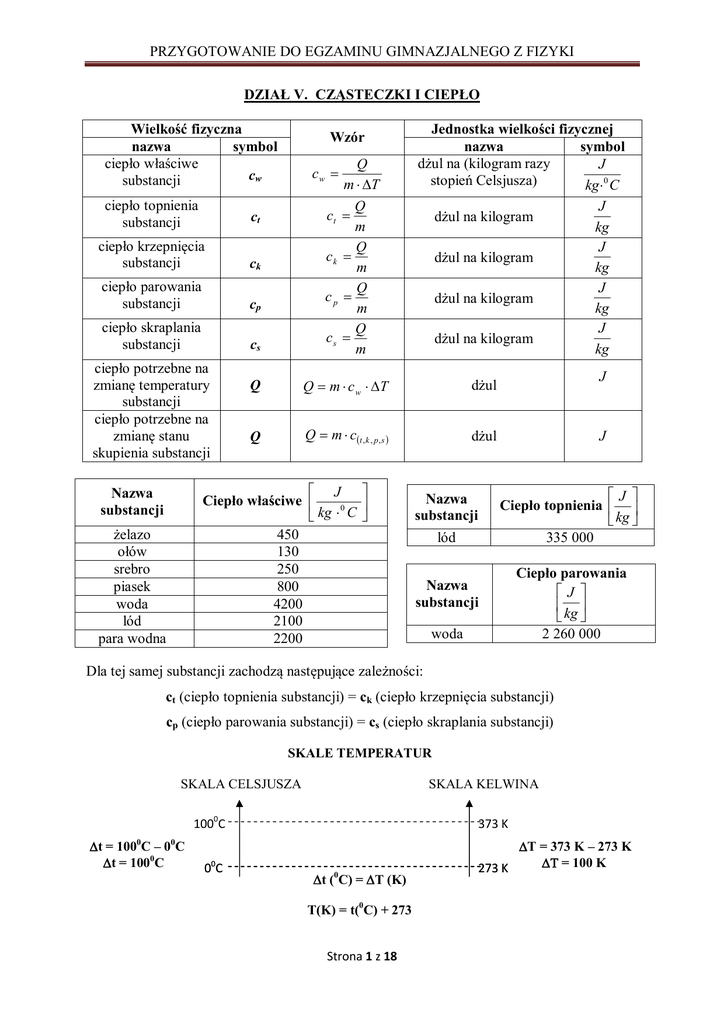 PRZYGOTOWANIE DO EGZAMINU GIMNAZJALNEGO Z FIZYKI DZIAŁ V. CZĄSTECZKI I CIEPŁO Wielkość fizyczna nazwa symbol ciepło właściwe cw substancji Wzór cw ciepło topnienia substancji ct ct ciepło krzepnięcia substancji ck ck ciepło parowania substancji cp cp ciepło skraplania substancji cs cs ciepło potrzebne na zmianę temperatury substancji ciepło potrzebne na zmianę stanu skupienia substancji Q m T Q m Q m Q m Q m Q Q m c w T dżul Q Q m c t , k , p , s dżul J Ciepło właściwe 0 kg C 450 130 250 800 4200 2100 2200 Nazwa substancji żelazo ołów srebro piasek woda lód para wodna Jednostka wielkości fizycznej nazwa symbol dżul na (kilogram razy J stopień Celsjusza) kg 0 C J dżul na kilogram kg J dżul na kilogram kg J dżul na kilogram kg J dżul na kilogram kg Nazwa substancji lód J J J Ciepło topnienia kg 335 000 Nazwa substancji woda Ciepło parowania J kg 2 260 000 Dla tej samej substancji zachodzą następujące zależności: ct (ciepło topnienia substancji) = ck (ciepło krzepnięcia substancji) cp (ciepło parowania substancji) = cs (ciepło skraplania substancji) SKALE TEMPERATUR SKALA CELSJUSZA SKALA KELWINA 1000C 0 373 K 0 t = 100 C – 0 C t = 1000C 0 0C t (0C) = T (K) T(K) = t(0C) + 273 Strona 1 z 18 T = 373 K – 273 K = 100 K 273 K PRZYGOTOWANIE DO EGZAMINU GIMNAZJALNEGO Z FIZYKI ZADANIA POWTÓRZENIOWE Zadanie 1. W naczyniach przedstawiono modele cząsteczkowe ciał stałych, cieczy i gazów. Podaj nazwy zjawisk fizycznych zaznaczonych odpowiednimi strzałkami. A – …………………………………… D – …………………………………… B – …………………………………… E – …………………………………… C – …………………………………… F – …………………………………… Zadanie 2. Dlaczego można przelewać wodę, a nie można tego samego zrobić z kawałkiem drewna? Zadanie 3. Dlaczego można włożyć palca w miód, a nie można tego zrobić z żelazem? Strona 2 z 18 PRZYGOTOWANIE DO EGZAMINU GIMNAZJALNEGO Z FIZYKI Zadanie 4. Opisz cechy ciała stałego uwzględniając jego zachowanie pod działaniem sił. a) twardość – b) kruchość – c) plastyczność – d) sprężystość – Zadanie 5. Podkreśl nazwy tych ciał, które są dobrymi przewodnikami ciepła. miedź, szkło, aluminium, żelazo, porcelana, styropian Zadanie 6. Podkreśl nazwy tych ciał, które są izolatorami elektrycznymi. miedź, grafit, żelazo, guma, szkło, srebro, porcelana, platyna, tworzywo sztuczne Zadanie 7. Którą cechę substancji stałych (kruchość, sprężystość, czy plastyczność) wykorzystuje się w niżej wymienionych sytuacjach? ● rozbijania bloków skalnych w kamieniołomach na mniejsze kamienie, ● napinania łuku, ● rysowania rysunków ołówkiem na kartce papieru, ● wytłaczania z blach elementów karoserii samochodowych, ● wykonywania skoku z trampoliny, Zadanie 8. Dlaczego do skoków bungee nie używa się liny stalowej? Strona 3 z 18 PRZYGOTOWANIE DO EGZAMINU GIMNAZJALNEGO Z FIZYKI Zadanie 9. Wyjaśnij pojęcia: a) konwekcja – b) elektrolity – c) nieelektrolity – d) kontrakcja objętości – e) dyfuzja – f) ruchy Browna – Zadanie 10. Odczytaj, jakie objętości mają ciecze w naczyniach przedstawionych na rysunkach. Oceń niepewność pomiaru. …………………….. …………………….. …………………….. …………………….. Zadanie 11. Co to jest powierzchnia swobodna cieczy? Zaznacz ją na rysunkach. Strona 4 z 18 PRZYGOTOWANIE DO EGZAMINU GIMNAZJALNEGO Z FIZYKI Zadanie 12. W jaki sposób można odmierzyć 1 litr wody, mając do dyspozycji garnek o pojemności 2 litrów? Wykonaj odpowiedni rysunek. Zadanie 13. Jaka jest przyczyna przyklejenia się wilgotnego spodka do szklanki z herbatą? Zadanie 14. Dwa szkiełka mikroskopowe można swobodnie rozdzielić, gdy są suche. Dlaczego po wkropleniu między te szkiełka wody powyższa czynność jest dużo trudniejsza? Zadanie 15. Dlaczego woda tworzy pojedyncze krople, a gdy płynie z kranu, tworzy ciągłą strugę? Zadanie 16. Jaka jest przyczyna występowania menisku wklęsłego i wypukłego w naczyniach z wodą i rtęcią? Strona 5 z 18 PRZYGOTOWANIE DO EGZAMINU GIMNAZJALNEGO Z FIZYKI Zadanie 17. Jak to się dzieje, że ciała stałe, np. kreda, szklanka, gumka stanowią pewną całość i same nie rozsypują się na pojedyncze cząsteczki w odróżnieniu od suchego piasku, który rozsypuje się na pojedyncze ziarenka? Zadanie 18. Na czym polega rozszerzalność temperaturowa ciał? Zadanie 19. Co to jest bimetal i do czego służy? Wymień urządzenia, w których ma zastosowanie. Zadanie 20. Na rysunku przedstawiono linie wysokiego napięcia latem i zimą. Jak wyjaśnić następujące rysunki? Zadanie 21. Szyny kolejowe i tramwajowe układa się w taki sposób, że między nimi pozostawia się małą przerwę. Jak ta przerwa się nazywa i dlaczego jest ona pozostawiana? Strona 6 z 18 PRZYGOTOWANIE DO EGZAMINU GIMNAZJALNEGO Z FIZYKI Zadanie 22. Dlaczego szklanki wykonane z grubego szkła, przy wlewaniu do nich gorącej wody, pękają częściej niż cienkie? Zadanie 23. Wpisz w ramki nazwy poszczególnych części termometru lekarskiego (rtęciowego). Zadanie 24. Przelicz ze 0C na K: Przelicz z K na 0C: – 200C - ………………………………….. 268 K - …………………………………….... 300C - ………………………………….. 288 K - ……………………………………… 0 120 C - ………………………………….. 315 K - ……………………………………… Zadanie 25. Co to jest temperatura zera bezwzględnego? Zadanie 26. Wyjaśnij, dlaczego nie wolno ogrzewać, ani wrzucać do ognia opakowań aerozolowych? Zadanie 27. Dlaczego kowal silnie ogrzewa metalową obręcz przed nałożeniem jej na drewniane koło? Strona 7 z 18 PRZYGOTOWANIE DO EGZAMINU GIMNAZJALNEGO Z FIZYKI Zadanie 28. Wytłumacz, dlaczego w wypadku t