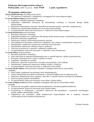 Edukacja dla bezpieczeństwa klasa I Podręcznik: EDB. Po prostu. wyd. WSiP 1 godz. tygodniowo Wymagania edukacyjne: Ocenę niedostateczną otrzymuje uczeń, który: Nie opanował wiadomości i umiejętności wymaganych na ocenę dopuszczającą Na ocenę dopuszczającą uczeń powinien: Częściowo rozumieć polecenia i instrukcje; Zapamiętać wiadomości konieczne do elementarnej orientacji w treściach danego działu tematycznego; Poprawnie rozpoznawać, nazywać i klasyfikować poznane pojęcia, zjawiska, urządzenia itp.; Wykonywać samodzielnie podstawowe ćwiczenia resuscytacyjne; Ze sprawdzianów testowych otrzymywać w większości oceny dopuszczające; Na ocenę dostateczną uczeń powinien: Rozumieć polecenia i instrukcje; Zapamiętać podstawowe wiadomości dla danego działu tematycznego i samodzielnie je prezentować; Rozumieć omawiane zagadnienia; Dokonywać selekcji i porównania poznanych zjawisk; Znać podstawowe procedury zachowań i regulaminy oraz umieć je samodzielnie zastosować; Samodzielnie i poprawnie wykonywać ćwiczenia resuscytacyjne; Samodzielnie zastosować zdobytą wiedzę w praktyce; Aktywnie uczestniczyć w pracach i zadaniach zespołowych; Ze sprawdzianów testowych otrzymać w większości oceny dostateczne; Na ocenę dobrą uczeń powinien: Rozumieć polecenia i instrukcje; Znać omawianą na zajęciach problematykę oraz w sposób logiczny i spójny ją prezentować; Rozumieć omawiane treści i umieć wyjaśnić je innym; Uogólniać i formułować wnioski; Poprawnie i sprawnie wykonywać ćwiczenia resuscytacyjne i inne zadania; Samodzielnie i poprawnie zastosować zdobytą wiedzę w praktyce; Ze sprawdzianów testowych otrzymać w większości oceny dobre; Na ocenę bardzo dobrą uczeń powinien wypełniać wymagania takie jak na ocenę dobrą i ponadto: Mieć bogate wiadomości na poziomie treści dopełniających; Umieć samodzielnie poszukiwać informacji w różnych źródłach oraz je selekcjonować; Właściwie interpretować nowe sytuacje i zjawiska, w sposób twórczy rozwiązywać problemy; Kierować pracą zespołu rówieśników; Ze sprawdzianów testowych otrzymać oceny dobre i bardzo dobre; Na ocenę celującą uczeń powinien wypełniać wymagania takie jak na ocenę bardzo dobrą i ponadto: Wykazywać szczególne zainteresowanie przedmiotem i literaturą popularnonaukową; Ze sprawdzianów testowych otrzymać oceny bardzo dobre; Uczestniczyć w konkursach i zawodach właściwych dla przedmiotu i uzyskiwać wyróżniające wyniki, godnie reprezentując szkołę; Podejmować się wykonania zadań dodatkowych (indywidualnie lub w zespole), znacznie wykraczających poza podstawę programową Wiesław Perucki