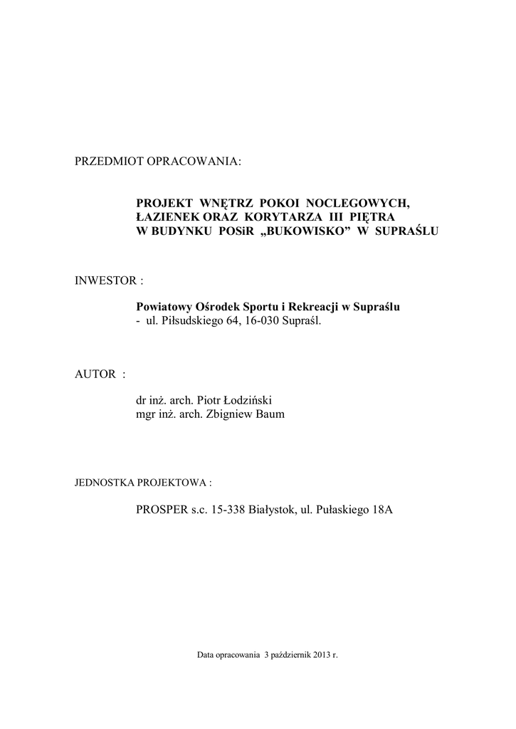 PRZEDMIOT OPRACOWANIA: PROJEKT WNĘTRZ POKOI NOCLEGOWYCH, ŁAZIENEK ORAZ KORYTARZA III PIĘTRA W BUDYNKU POSiR „BUKOWISKO” W SUPRAŚLU INWESTOR : Powiatowy Ośrodek Sportu i Rekreacji w Supraślu - ul. Piłsudskiego 64, 16-030 Supraśl. AUTOR : dr inż. arch. Piotr Łodziński mgr inż. arch. Zbigniew Baum JEDNOSTKA PROJEKTOWA : PROSPER s.c. 15-338 Białystok, ul. Pułaskiego 18A Data opracowania 3 październik 2013 r. Zawartość opracowania : Opis Rys. nr 1 – Inwentaryzacja pomieszczeń – wyburzenia /III piętro/ 1 : 50 Rys. nr 2 – Inwentaryzacja pomieszczeń – wyburzenia /IV piętro/ 1 : 50 Rys. nr 3 – Rozwiązania docelowe /III piętro/ 1 : 50 Rys. nr 4 – Rozwiązania docelowe /IV piętro/ 1 : 50 Rys. nr 5 – Wykończenie łazienki 1 : 50 Rys. nr 6 – Wykończenie łazienki 1 : 50 OPIS. 1. Stan istniejący – cel inwestycji. Prace remontowe będą przeprowadzone w budynku internatu „Bukowisko”. Do tego celu inwestor wytypował cztery pokoje noclegowe z łazienkami oraz korytarz na III piętrze i dwa pokoje noclegowe z łazienkami na IV piętrze. Wytypowane pomieszczenia - pokoje noclegowe posiadają wspólne łazienki. Taki stan rzeczy znacznie obniżył standard użytkowy oferowanych usług turystycznych. Inwestycja ma na celu wyodrębnienie pomieszczeń sanitarnych – łazienek i przypisanie ich indywidualnie pokojom noclegowych. 2. Opis przyjętych rozwiązań. Obecnie pomieszczenie korytarza III piętra wymagają przeprowadzenia remontu ze względu na zużycie elementów wykończenia jak również, podniesienie standardu użytkowego. Zakłada się przyjęcie prostych, oszczędnych rozwiązań skutkujących maksymalizacją efektu wizualnego, poprzez kolor, kompozycję ułożenia elementów wykończenia posadki i ścian, przede wszystkim likwidację niekorzystnych elementów wykończenia stanu istniejącego. Projekt zakłada przeprowadzenia prac remontowych polegających na : 1. Remoncie 6 pokoi noclegowych /4 na III piętrze i 2 na piętrze IV/. 2. Wydzielenie nowych i remoncie istniejących łazienek połączoną z wymianą wyposażenia. 3. Remoncie korytarza III piętra / bez zmiany wykończenia posadzki/ 4. Wymianę stolarki drzwiowej w w/w pokojach noclegowych i łazienekach. 3. Dane powierzchniowe /po realizacji inwestycji/. korytarz III piętra 57.9 m2 pokój 1 łazienka korytarz 23.9 m2 3.4 m2 3.0 m2 pokój 2 łazienka korytarz 23.4 m2 4.0 m2 2.9 m2 pokój 3 łazienka korytarz 23.5 m2 3.4 m2 3.5 m2 pokój 4 łazienka korytarz 23.5 m2 3.7 m2 2.8 m2 pokój 5 łazienka korytarz 20.1 m2 3.7 m2 3.3 m2 pokój 6 łazienka korytarz 20.5 m2 3.3 m2 3.2 m2 4. Rozwiązania materiałowe. Projekt wnętrz - obejmuje następujący zakres robót i rozwiązań materiałowych : w łazienkach : - dokonanie wyburzeń części ścianek działowych i wymurowanie nowych /kratówka, silikat, gazobeton/ oraz poszerzenia istniejących otworów drzwiowych wg rysunków projektu, - posadzka w łazienkach – zakłada się demontaż istniejącego wykończenia i wykonania nowego wykończenia posadzki z płyt gresowych: prod. Opoczno „Kando Grey Satinated” 59.4x59.4 i 29.55x59.4 /cm/ z cokolikiem z tych płyt wysokości 10cm wykończonym listwą aluminiową anodowaną (kątownik), zakładana fuga 2mm „Kerakoll Zementgrau 44”, - w łazienkach ściany wykończone do wysokości 200cm płytką ceramiczną prod. Opoczno” – model „Inwencja” 20x20cm /biała i pistacja wg rysunków/, fuga 2mm Zementgrau 44, powyżej 200cm ściany szpachlowane i malowane na kolor biały. - w łazienkach zakłada się montaż : kabin prysznicowych prod. Koło model „Geo 6” „90” z drzwiami rozsuwanymi i brodzikiem; umywalek prod. Koło model „Rekord” 60cm z półpostumentem, zestawów wc prod. Koło model „Record” – kompakt. - rozmieszczenie oświetlenia i gniazdek – wg rysunku. w pokojach noclegowych : - w pokojach noclegowych projektuje się ułożenie wykładziny „Rivoli” prod. ITC wraz z olistwowaniem /kolor do ustalenia z inwestorem i autorem/, - jedna ściana wg rysunku wykończona Fassadenschpachtel „P” i malowana na ciemno w kolorze do ustalenia z inwestorem i autorem projektu, pozostałe ściany i sufit szpachlowane i malowane w kolorze jasnym w kolorze do ustalenia z inwestorem i autorem projektu, - wykonanie nadproży w ścianie 25cm - z wykorzystaniem ceowników 100 obustronnie skręconych śrubami o14mm osiatkowanych i otynkowanych; w zakresie ochrony korozyjnej zakłada się pokrycie elementów stalowych farbami antykorozyjnymi; w zakresie ochrony p.poż. zakłada się obudowę konstrukcji nadproży systemem płytowym zapewniającym kl. REI60 np. prod. Farmacel, Rigips, Knauf. w korytarzu głównym III piętra: - pozostawienie istniejącego wykończenia posadzki, - poszerzenie otworów do minimalnej szerokości 90cm po wykończeniu, zgodnie z rysunkami projektu, - posadzka w powstałych wnękach korytarza głównego przed drzwiami wejściowymi do pokoi uzupełnić płytką ceramiczną gresową zbliżoną do ułożonej w tym korytarzu. - ściany wykończone Fassadenschpachtel „P” i malowane w kolorze do ustalenia z inwestorem i autorem projektu, sufit szpachlowany i malowany w kolorze jasnym do ustalenia z inwestorem i autorem projektu. Stolarka drzwiowa – zakłada się wymianę stolarki drzwiowej na nową stolarkę prod. Porta model „Nowa natura”, wzór 7.1; płaskie usłojenie poziome; zamki z kluczem do pokoi, zamki wc do łazienek; okleina – Bianco satin naturalna – Porta; ościeżnica – Porta system; klamka – stal nierdzewna; nakładki na zawiasy – dopasowane do klamki; wentylacja na dole skrzydła; drzwi do pokoi noclegowych o podwyższonych właściwościach akustycznych. Zakłada się możliwość modyfikacji kompozycji ułożenia posadzek i cokołów oraz zmiany odcienia płyt, wykładzin w ramach przyjętych rozwiązań materiałowych, w uzgodnieniu z inwestorem. Opracował: dr inż. arch. Piotr Łodziński mgr inż. arch. Z