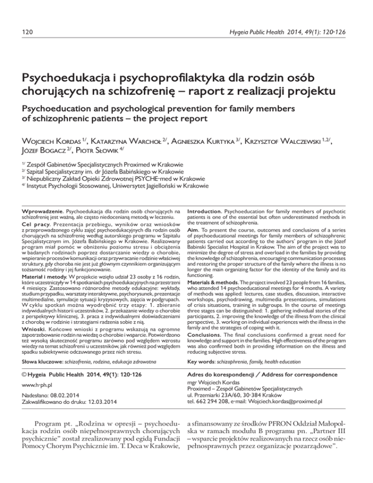 Hygeia Public Health 2014, 49(1): 120-126 120 Psychoedukacja i psychoprofilaktyka dla rodzin osób chorujących na schizofrenię – raport z realizacji projektu Psychoeducation and psychological prevention for family members of schizophrenic patients – the project report Wojciech Kordas 1/, Katarzyna Warchoł 2/, Agnieszka Kurtyka 3/, Krzysztof Walczewski 1,2/, Józef Bogacz 2/, Piotr Słowik 4/ Zespół Gabinetów Specjalistycznych Proximed w Krakowie Szpital Specjalistyczny im. dr Józefa Babińskiego w Krakowie 3/ Niepubliczny Zakład Opieki Zdrowotnej PSYCHE-med w Krakowie 4/ Instytut Psychologii Stosowanej, Uniwersytet Jagielloński w Krakowie 1/ 2/ Wprowadzenie. Psychoedukacja dla rodzin osób chorujących na schizofrenię jest ważną, ale często niedocenianą metodą w leczeniu. Cel pracy. Prezentacja przebiegu, wyników oraz wniosków z przeprowadzonego cyklu zajęć psychoedukacyjnych dla rodzin osób chorujących na schizofrenię według autorskiego programu w Szpitalu Specjalistycznym im. Józefa Babińskiego w Krakowie. Realizowany program miał pomóc w obniżeniu poziomu stresu i obciążenia w badanych rodzinach poprzez dostarczanie wiedzy o chorobie, wspieranie procesów komunikacji oraz przywracanie rodzinie właściwej struktury, gdy choroba nie jest już głównym czynnikiem organizującym tożsamość rodziny i jej funkcjonowanie. Materiał i metody. W projekcie wzięło udział 23 osoby z 16 rodzin, które uczestniczyły w 14 spotkaniach psychoedukacyjnych na przestrzeni 4 miesięcy. Zastosowano różnorodne metody edukacyjne: wykłady, studium przypadku, warsztaty interaktywne, psychorysunek, prezentacje multimedialne, symulacje sytuacji kryzysowych, zajęcia w podgrupach. W cyklu spotkań można wyodrębnić trzy etapy: 1. zbieranie indywidualnych historii uczestników, 2. przekazanie wiedzy o chorobie z perspektywy klinicznej, 3. praca z indywidualnymi doświadczeniami z chorobą w rodzinie i strategiami radzenia sobie z nią. Wnioski. Końcowe wnioski z programu wskazują na ogromne zapotrzebowanie rodzin na wiedzę o chorobie i wsparcie. Potwierdzono też wysoką skuteczność programu zarówno pod względem wzrostu wiedzy na temat schizofrenii u uczestników, jak również pod względem spadku subiektywnie odczuwanego przez nich stresu. Introduction. Psychoeducation for family members of psychotic patients is one of the essential but often underestimated methods in the treatment of schizophrenia. Aim. To present the course, outcomes and conclusions of a series of psychoeducational meetings for family members of schizophrenic patients carried out according to the authors’ program in the Józef Babinski Specialist Hospital in Krakow. The aim of the project was to minimize the degree of stress and overload in the families by providing the knowledge of schizophrenia, encouraging communication processes and restoring the proper structure of the family where the illness is no longer the main organizing factor for the identity of the family and its functioning. Materials & methods. The project involved 23 people from 16 families, who attended 14 psychoeducational meetings for 4 months. A variety of methods was applied: lectures, case studies, discussion, interactive workshops, psychodrawing, multimedia presentations, simulations of crisis situations, training in subgroups. In the course of meetings three stages can be distinguished: 1. gathering individual stories of the participants, 2. improving the knowledge of the illness from the clinical perspective, 3. working on individual experiences with the illness in the family and the strategies of coping with it. Conclusions. The final conclusions confirmed a great need for knowledge and support in the families. High effectiveness of the program was also confirmed both in providing information on the illness and reducing subjective stress. Słowa kluczowe: schizofrenia, rodzina, edukacja zdrowotna Key words: schizophrenia, family, health education © Hygeia Public Health 2014, 49(1): 120-126 Adres do korespondencji / Address for correspondence www.h-ph.pl Nadesłano: 08.02.2014 Zakwalifikowano do druku: 12.03.2014 mgr Wojciech Kordas Proximed – Zespół Gabinetów Specjalistycznych ul. Przemiarki 23A/60, 30-384 Kraków tel. 662 294 208, e-mail: [email protected] Program pt. „Rodzina w opresji – psychoedukacja rodzin osób niepełnosprawnych chorujących psychicznie” został zrealizowany pod egidą Fundacji Pomocy Chorym Psychicznie im. T. Deca w Krakowie, a sfinansowany ze środków PFRON Oddział Małopolska w ramach modułu B programu pn. „Partner III – wsparcie projektów realizowanych na rzecz osób niepełnosprawnych przez organizacje pozarządowe”. Kordas W i wsp. Psychoedukacja i psychoprofilaktyka dla rodzin osób chorujących na schizofrenię – raport ... Wprowadzenie Psychoedukacja i psychoprofilaktyka dla rodzin osób chorujących na schizofrenię są ważnymi, ale często niedocenianymi metodami, które warto wykorzystywać w procesie leczenia. Jak podaje Grzesiuk [1] w ostatnich latach, zwłaszcza w nurcie behawioralnopoznawczym, pojawiły się nowe podejścia w terapii osób z rozpoznaniem schizofrenii, a jednym z takich sposobów pracy jest psychoedukacja. Psychoedukacja „jest metodą pomocy psychologicznej osobom psychotycznym i ich rodzinom” [1]. Jak zauważa Sęk [2], ogólnie można powiedzieć, że psycholog kliniczny może zajmować się promocją zdrowia w dwóch obszarach, z jednej strony przez „upowszechnianie wiedzy psychologicznej przydatnej do promocji zdrowia”, a z drugiej strony poprzez „kształtowanie zasobów zdrowotnych i zachowań prozdrowotnych” [2]. Pierwszy obszar będzie miał charakter psychoedukacji, która służy upowszechnianiu wiedzy psychologicznej m.in. wśród zawodów medycznych, ale także wśród rodziców (czy też rodzin) osób chorych, co może być przydatne w procesie leczenia. Przydatna w tym procesie wydaje się także wiedza o czy