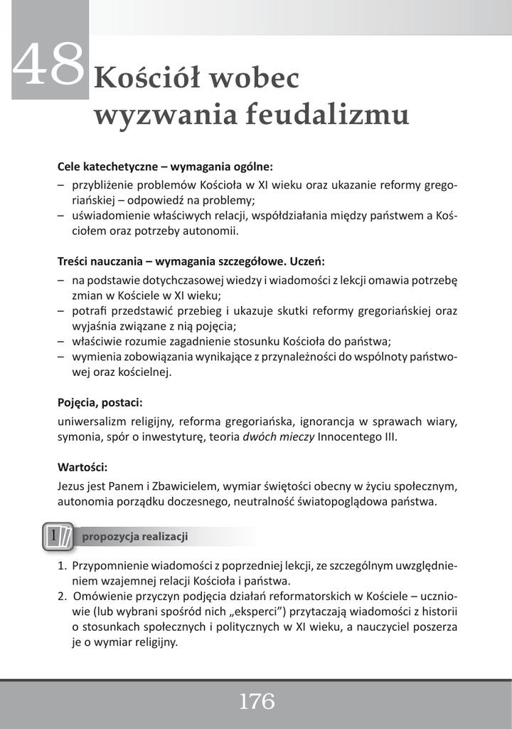 48 Kościół wobec wyzwania feudalizmu Cele katechetyczne – wymagania ogólne: – przybliżenie problemów Kościoła w XI wieku oraz ukazanie reformy gregoriańskiej – odpowiedź na problemy; – uświadomienie właściwych relacji, współdziałania między państwem a Kościołem oraz potrzeby autonomii. Treści nauczania – wymagania szczegółowe. Uczeń: – na podstawie dotychczasowej wiedzy i wiadomości z lekcji omawia potrzebę zmian w Kościele w XI wieku; – potrafi przedstawić przebieg i ukazuje skutki reformy gregoriańskiej oraz wyjaśnia związane z nią pojęcia; – właściwie rozumie zagadnienie stosunku Kościoła do państwa; – wymienia zobowiązania wynikające z przynależności do wspólnoty państwowej oraz kościelnej. Pojęcia, postaci: uniwersalizm religijny, reforma gregoriańska, ignorancja w sprawach wiary, symonia, spór o inwestyturę, teoria dwóch mieczy Innocentego III. Wartości: Jezus jest Panem i Zbawicielem, wymiar świętości obecny w życiu społecznym, autonomia porządku doczesnego, neutralność światopoglądowa państwa. realizacji: propozycja realizacji 1Propozycja 1. Przypomnienie wiadomości z poprzedniej lekcji, ze szczególnym uwzględnieniem wzajemnej relacji Kościoła i państwa. 2. Omówienie przyczyn podjęcia działań reformatorskich w Kościele – uczniowie (lub wybrani spośród nich „eksperci”) przytaczają wiadomości z historii o stosunkach społecznych i politycznych w XI wieku, a nauczyciel poszerza je o wymiar religijny. 176 3. Zapis do zeszytu o przyczynach reformy Kościoła. 4. Kamienie mozaikowe – uczniowie podzieleni na grupy otrzymują zestaw karteczek kamieni z głównymi pojęciami związanymi z daną lekcją, np. feudalizm, inwestytura, reforma gregoriańska, symonia, konkordat wormacki itd. (można nadać kartkom nieregularne kształty). Bazując na lekturze tekstów z podręcznika, skopiowanego tekstu źródłowego z materiałów do wykorzystania z poradnika, ewentualnie słownika, encyklopedii itp. grupy mają ułożyć karteczki w „sensowny” związek i nakleić na papier (np. zagadnienia bezpośrednio związane ze sobą i wynikające z siebie umieścić obok). Dodatkowe związki i odniesienia można zaznaczyć jednakowymi kolorami lub połączyć ze sobą strzałkami kamienie oddalone od siebie. 5. Przedstawiciele grup wyjaśniają proponowane przez zespoły mozaiki, następuje porównanie i omówienie różnych możliwości ułożenia kamieni. 6. Zapis do zeszytu o skutkach reformy gregoriańskiej. 7. Zależnie od pozostałego czasu – dyskusja na temat relacji między państwem i Kościołem. propozycja pracypracy na lekcji: propozycja na lekcji 3 inna 12Inna Materiał przedstawiony w podręczniku jest trudny. Rozpoczyna się on od bardzo ważnej uwagi historiozoficznej: historia polityczna nie nadaje się do pełnego przedstawienia sensu ewangelizacji. Nauczyciel winien to zrozumieć, by w sposób przystępny i w odpowiednim momencie wyjaśnić to uczniom w trakcie lekcji. Następny fragment podręcznika dotyczy rozwoju idei na przestrzeni wieków. Uczniowie są skłonni do uczenia się wyrywkowo, do segregowania pewnych treści w odrębnych szufladkach. Otóż chodzi tu o rzecz bardzo istotną: racjonalne myślenie historyczne. Średniowieczna idea jedności, idea władcy jako pomazańca Bożego – nie wzięły się nie wiadomo skąd. Są one wynikiem ciągłego rozwoju myśli ludzkiej. W prezentowaniu przyczyn przeprowadzenia reformy gregoriańskiej nauczyciel powinien wprost powiedzieć, że do Kościoła zakradło się wielkie zło. Tylko takie ujęcie potrafi skłonić uczniów do przemyślenia własnej odpowiedzialności za Kościół. Uczniowie winni zrozumieć, że te wszystkie opisane w podręczniku przyczyny mogą grozić również współczesnemu Kościołowi. W trakcie dyskusji zapewne pojawią się bardzo współczesne zarzuty. Nie należy ich ignorować ani tym bardziej ośmieszać. Tam, gdzie są słuszne, należy wspólnie się zastanawiać, jak odnawiać oblicze Kościoła, który powierzył nam Chrystus. 177 Z całą pewnością dojdzie też do dyskusji na temat Kościół a polityka. Fundamentem, na którym można budować porozumienie, jest tekst przemówienia Jana Pawła II z roku 1991 z Lubaczowa. Nauczyciel religii może nawiązać do prześladowań, jakie były prowadzone pod pretekstem obrony państwa przed Kościołem. Uczniowie wierzący winni zrozumieć, że obrona praw ludzi wierzących w pierwszym rzędzie dotyczy ich samych. Modlitwa: Ps 1. Szczęśliwy mąż, który nie idzie za radą występnych, nie wchodzi na drogę grzeszników i nie siada w kole szyderców, lecz ma upodobanie w Prawie Pana, nad Jego Prawem rozmyśla dniem i nocą. Jest on jak drzewo zasadzone nad płynącą wodą, które wydaje owoc w swoim czasie, a liście jego nie więdną: co uczyni, pomyślnie wypada. Nie tak występni, nie tak: są oni jak plewa, którą wiatr rozmiata. Toteż występni nie ostoją się na sądzie ani grzesznicy – w zgromadzeniu sprawiedliwych, bo Pan uznaje drogę sprawiedliwych, a droga występnych zaginie. Pisemna odpowiedź na pytanie 1. z sekcji zastanów się z podręcznika ucznia oraz pytanie 3. z sekcji praca domowa. Korelacja z innymi przedmiotami: język polski – krytyka ignorancji religijnej w literaturze; historia – reforma gregoriańska: przyczyny, przebieg, skutki, organizacja społeczeństwa feudalnego; wiedza o społeczeństwie – neutralność światopoglądowa państwa i miejsce wiary w życiu społecznym, gwarancje praw ludzi wierzących; godziny do dyspozycji wychowawcy – zakres prawa do manifestowania swoich przekonań światopoglądowych. 178 komentarz W reformie tej widoczna jest wyraźnie dążność do oderwania się Kościoła od systemu feudalnego, z którym związane były struktury kościelne, odziedziczone po czasach karolińskich. Sformułowana przez papieża Grzegorza VII doktryna o wyższości władzy papieskiej n