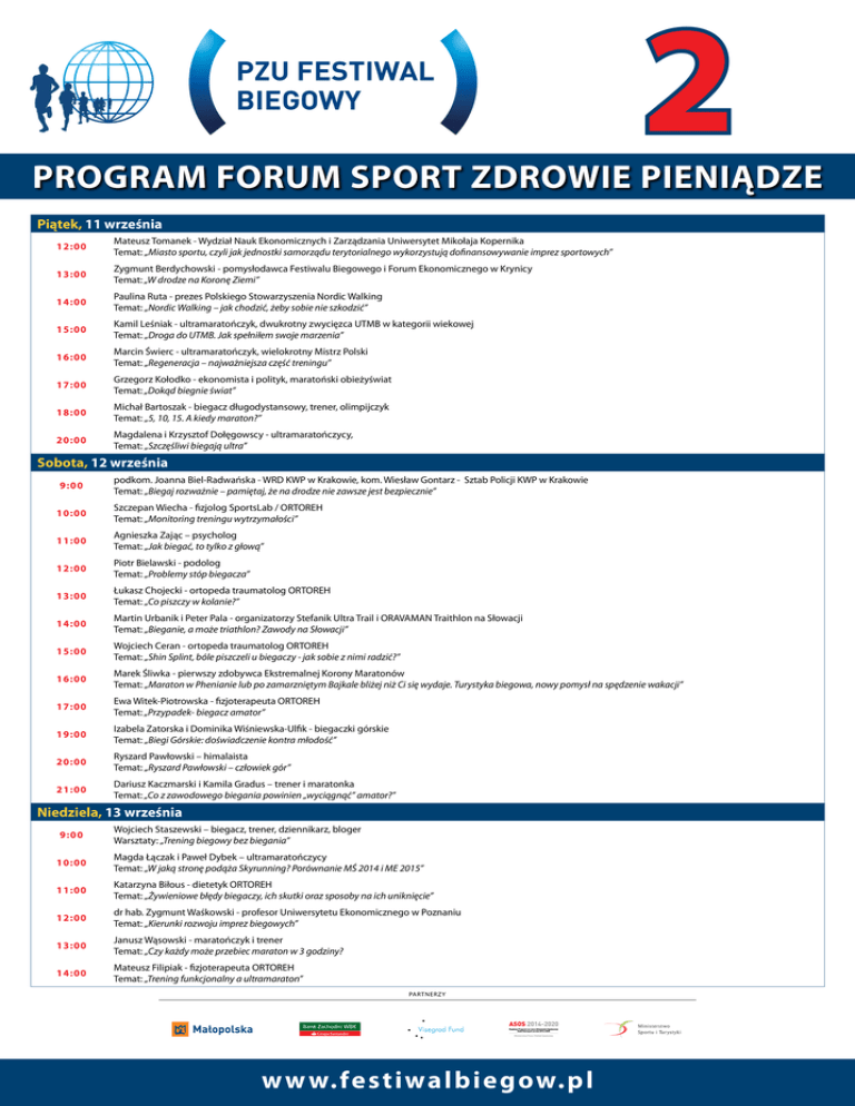 2 PROGRAM FORUM SPORT ZDROWIE PIENIĄDZE Piątek, 11 września 1 2 :0 0 Mateusz Tomanek - Wydział Nauk Ekonomicznych i Zarządzania Uniwersytet Mikołaja Kopernika Temat: „Miasto sportu, czyli jak jednostki samorządu terytorialnego wykorzystują dofinansowywanie imprez sportowych” 1 3 :0 0 Zygmunt Berdychowski - pomysłodawca Festiwalu Biegowego i Forum Ekonomicznego w Krynicy Temat: „W drodze na Koronę Ziemi” 1 4 :0 0 Paulina Ruta - prezes Polskiego Stowarzyszenia Nordic Walking Temat: „Nordic Walking – jak chodzić, żeby sobie nie szkodzić” 1 5 :0 0 Kamil Leśniak - ultramaratończyk, dwukrotny zwycięzca UTMB w kategorii wiekowej Temat: „Droga do UTMB. Jak spełniłem swoje marzenia” 1 6 :0 0 Marcin Świerc - ultramaratończyk, wielokrotny Mistrz Polski Temat: „Regeneracja – najważniejsza część treningu” 1 7 :0 0 Grzegorz Kołodko - ekonomista i polityk, maratoński obieżyświat Temat: „Dokąd biegnie świat” 1 8 :0 0 Michał Bartoszak - biegacz długodystansowy, trener, olimpijczyk Temat: „5, 10, 15. A kiedy maraton?” 2 0 :0 0 Magdalena i Krzysztof Dołęgowscy - ultramaratończycy, Temat: „Szczęśliwi biegają ultra” Sobota, 12 września 9 :0 0 podkom. Joanna Biel-Radwańska - WRD KWP w Krakowie, kom. Wiesław Gontarz - Sztab Policji KWP w Krakowie Temat: „Biegaj rozważnie – pamiętaj, że na drodze nie zawsze jest bezpiecznie” 1 0 :0 0 Szczepan Wiecha - fizjolog SportsLab / ORTOREH Temat: „Monitoring treningu wytrzymałości” 1 1 :0 0 Agnieszka Zając – psycholog Temat: „Jak biegać, to tylko z głową” 1 2 :0 0 Piotr Bielawski - podolog Temat: „Problemy stóp biegacza” 1 3 :0 0 Łukasz Chojecki - ortopeda traumatolog ORTOREH Temat: „Co piszczy w kolanie?” 1 4 :0 0 Martin Urbanik i Peter Pala - organizatorzy Stefanik Ultra Trail i ORAVAMAN Traithlon na Słowacji Temat: „Bieganie, a może triathlon? Zawody na Słowacji” 1 5 :0 0 Wojciech Ceran - ortopeda traumatolog ORTOREH Temat: „Shin Splint, bóle piszczeli u biegaczy - jak sobie z nimi radzić?” 1 6 :0 0 Marek Śliwka - pierwszy zdobywca Ekstremalnej Korony Maratonów Temat: „Maraton w Phenianie lub po zamarzniętym Bajkale bliżej niż Ci się wydaje. Turystyka biegowa, nowy pomysł na spędzenie wakacji” 1 7 :0 0 Ewa Witek-Piotrowska - fizjoterapeuta ORTOREH Temat: „Przypadek- biegacz amator” 1 9 :0 0 Izabela Zatorska i Dominika Wiśniewska-Ulfik - biegaczki górskie Temat: „Biegi Górskie: doświadczenie kontra młodość” 2 0 :0 0 Ryszard Pawłowski – himalaista Temat: „Ryszard Pawłowski – człowiek gór” 2 1 :0 0 Dariusz Kaczmarski i Kamila Gradus – trener i maratonka Temat: „Co z zawodowego biegania powinien „wyciągnąć” amator?” Niedziela, 13 września 9 :0 0 Wojciech Staszewski – biegacz, trener, dziennikarz, bloger Warsztaty: „Trening biegowy bez biegania” 1 0 :0 0 Magda Łączak i Paweł Dybek – ultramaratończycy Temat: „W jaką stronę podąża Skyrunning? Porównanie MŚ 2014 i ME 2015” 1 1 :0 0 Katarzyna Biłous - dietetyk ORTOREH Temat: „Żywieniowe błędy biegaczy, ich skutki oraz sposoby na ich uniknięcie” 1 2 :0 0 dr hab. Zygmunt Waśkowski - profesor Uniwersytetu Ekonomicznego w Poznaniu Temat: „Kierunki rozwoju imprez biegowych” 1 3 :0 0 Janusz Wąsowski - maratończyk i trener Temat: „Czy każdy może przebiec maraton w 3 godziny? 1 4 :0 0 Mateusz Filipiak - fizjoterapeuta ORTOREH Temat: „Trening funkcjonalny a ultramaraton” w w w. fe stiwa l b i eg ow. p l