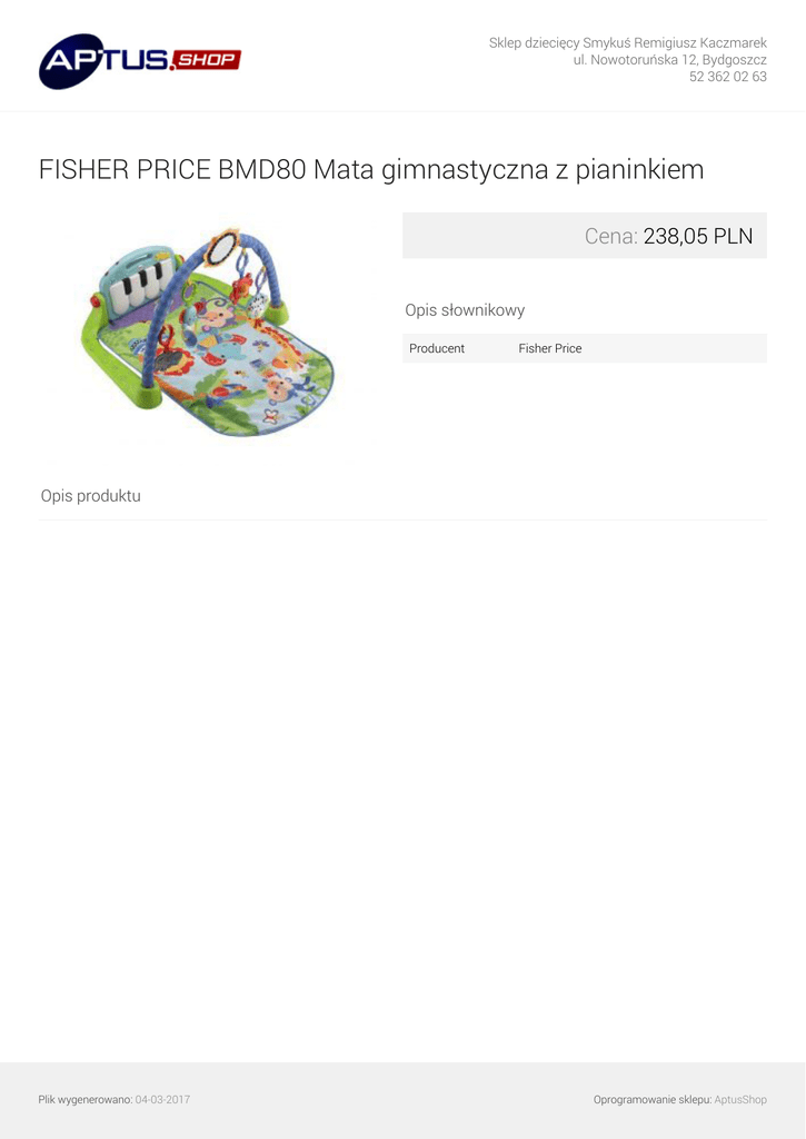 Sklep dziecięcy Smykuś Remigiusz Kaczmarek ul. Nowotoruńska 12, Bydgoszcz 52 362 02 63 FISHER PRICE BMD80 Mata gimnastyczna z pianinkiem Cena: 238,05 PLN Opis słownikowy Producent Fisher Price Opis produktu Plik wygenerowano: 04-03-2017 Powered by TCPDF (www.tcpdf.org) Oprogramowanie sklepu: AptusShop