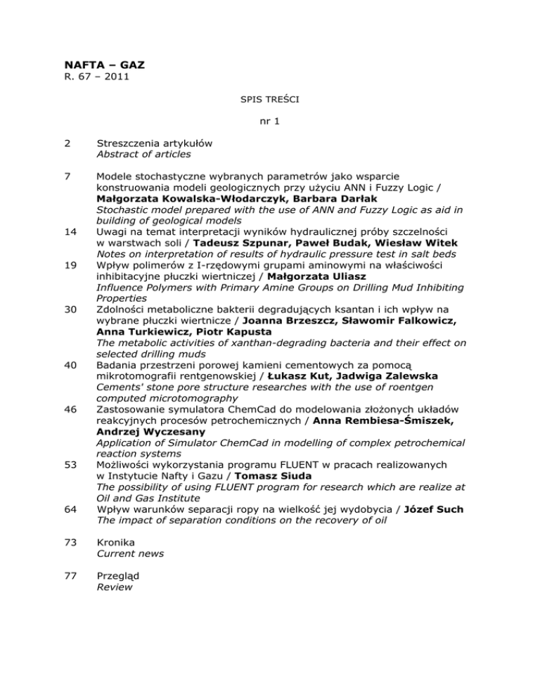NAFTA – GAZ R. 67 – 2011 SPIS TREŚCI nr 1 2 Streszczenia artykułów Abstract of articles 7 Modele stochastyczne wybranych parametrów jako wsparcie konstruowania modeli geologicznych przy użyciu ANN i Fuzzy Logic / Małgorzata Kowalska-Włodarczyk, Barbara Darłak Stochastic model prepared with the use of ANN and Fuzzy Logic as aid in building of geological models Uwagi na temat interpretacji wyników hydraulicznej próby szczelności w warstwach soli / Tadeusz Szpunar, Paweł Budak, Wiesław Witek Notes on interpretation of results of hydraulic pressure test in salt beds Wpływ polimerów z I-rzędowymi grupami aminowymi na właściwości inhibitacyjne płuczki wiertniczej / Małgorzata Uliasz Influence Polymers with Primary Amine Groups on Drilling Mud Inhibiting Properties Zdolności metaboliczne bakterii degradujących ksantan i ich wpływ na wybrane płuczki wiertnicze / Joanna Brzeszcz, Sławomir Falkowicz, Anna Turkiewicz, Piotr Kapusta The metabolic activities of xanthan-degrading bacteria and their effect on selected drilling muds Badania przestrzeni porowej kamieni cementowych za pomocą mikrotomografii rentgenowskiej / Łukasz Kut, Jadwiga Zalewska Cements' stone pore structure researches with the use of roentgen computed microtomography Zastosowanie symulatora ChemCad do modelowania złożonych układów reakcyjnych procesów petrochemicznych / Anna Rembiesa-Śmiszek, Andrzej Wyczesany Application of Simulator ChemCad in modelling of complex petrochemical reaction systems Możliwości wykorzystania programu FLUENT w pracach realizowanych w Instytucie Nafty i Gazu / Tomasz Siuda The possibility of using FLUENT program for research which are realize at Oil and Gas Institute Wpływ warunków separacji ropy na wielkość jej wydobycia / Józef Such The impact of separation conditions on the recovery of oil 14 19 30 40 46 53 64 73 Kronika Current news 77 Przegląd Review nr 2 86 89 98 107 113 120 125 Streszczenia artykułów Zastosowanie modelu Xu-White do określania prędkości propagacji fal podłużnych i poprzecznych, na przykładzie skał czerwonego spągowca / Irena Gąsior Method of application of the Xu-White model to determine the propagation velocity of longitudal and transverse waves developed on the example of the Rotliegend sediments Badania procesu mieszania wód zatłaczanych z wodami złożowymi o zróżnicowanych potencjałach elektrochemicznych / Dorota Kluk Research the process of mixing the reservoir and injected waters with different electrochemical potentials Dobór wgłębnych filtrów przeciwpiaskowych w odwiertach gazowych / Tadeusz Szpunar, Paweł Budak Slot screens selection to avoid sand control problems in gas wells Zaczyny cementowe o wysokiej elastyczności kamienia cementowego / Marcin Rzepka Cement slurry about the high elasticity of the cement stone Badanie procesów dyfuzji i rozpuszczania się gazu ziemnego w strefie kontaktu z ropą naftową / Jerzy Kuśnierczyk Natural gas diffusion and dissolution study in the phase boundary with oil Wykorzystanie gazu ziemnego w gospodarstwach domowych w Polsce / Maciej Kaliski, Sylwia Sikora, Adam Szurlej, Piotr Janusz Natural gas consumption by households in Poland 135 Przegląd wiadomości News review 143 Polskie Normy Polish Standards 145 Aprobaty Techniczne Technical aprovals nr 3 150 Streszczenia artykułów Summary of articles 153 Symulacyjne modelowanie procesu konwersji złoża na PMG i regularnej jego pracy, z udziałem CO2 jako gazu buforowego; Część I - Konstrukcja i weryfikacja modelu, symulacja procesu wytwarzania buforu magazynu / Andrzej Gołąbek, Krzysztof Miłek, Wiesław Szott Simulation modeling of the natural gas to UGS reservoir conversion with C02 as cushion gas. Part I. Model construction and calibration, UGS generation Automatyczna kalibracja symulacyjnego modelu złożowego w bliskim otoczeniu odwiertu / Piotr Łętkowski Automatic history matching of reservoir simulation models in well's surroundings area Badania procesów korozji w odwiertach o dużej zawartości rtęci / Andrzej Janocha Studies of corrosion in wells with high mercury content Proces migracji gazu w trakcie wiązania zaczynu cementowego / Marcin Kremieniewski Process of gas migration during the bonding of the cement slurry Zapobieganie zanikom płuczek w formacje skalne w procesie wiercenia / Sławomir Błaż Preventing drilling fluid losses in the formations rock in the drilling process Zastosowanie metody statystycznej do oszacowania zapasu strategicznego PMG, z uwzględnieniem niepewności wyznaczenia parametrów pracy systemu gazowniczego / Tadeusz Kwilosz The use of the statistic methods in UGS strategic gas reserves estimation based on uncertainties connected to pressure in gas pipelines and gas storage production rates Influences of biocomponents (RME) on emissions of a Diesel engine with SCR / Jan Czerwiński, Zbigniew Stępień, Stanisław Oleksiak, Andersen Otto Wpływ biokomponentów (RME) na emisję silnika Diesla z układem SCR Zastosowanie metod termograwimetrycznych do oceny stabilności termicznej dodatków detergentowych do oleju napędowego / Grażyna Żak The application of thermogravimetric methods to evaluate thermal stability of diesel oil detergent additives 163 171 175 182 192 198 209 215 Prace naukowe INiG Scientific works of INiG 218 Kronika Chronicle 221 Przegląd wiadomości News review nr 4 230 Streszczenia artykułów Summary of articles 233 Evaluation of Carbonate Rock Permeability, with the Use of X-ray Computed Microtomography / Jan Kaczmarczyk, Marek Dohnalik, Jadwiga Zalewska Ocena przepuszczalności skał węglanowych przy użyciu rentgenowskiej mikrotomografii komputerowej Symulacyjne modelowanie procesu konwersji złoża na PMG i regularnej jego pracy, z udziałem CO2 jako gazu buforowego. Część II - Symulacyjne prognozy pracy magazynu / Andrzej Gołąbek, Krzysztof Miłek, Wiesław Szott Simulation modeling of the natural gas to UGS reservoir conversion with CO2