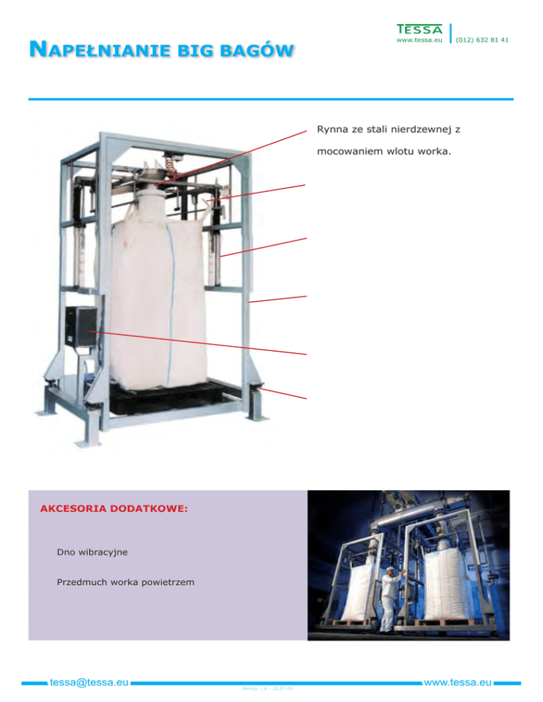 NAPEŁNIANIE BIG BAGÓW www.tessa.eu 31-354 Kraków ul. Pasternik 94A (012) 632 81 41 Prezentowane stacje umożliwiają wydajny załadunek worków typu big bag przy minimalnym zaangażowaniu personelu. Wbudowany system ważenie zapewnia precyzyjne wypełnienie worka do zadanej wagi. Konstrukcja rynny spustowej zapewnia bezpyłowe napełnianie worków o różnej wysokości. Stacja posiada certyfikat ATEX. Rynna ze stali nierdzewnej z pneumatycznym lub ręcznym mocowaniem wlotu worka. Haki naciągające big bag. Regulacja pozwalająca obsługiwać worki o różnej wysokości. Wolnostojąca rama wykonana ze stali miękkiej lub nierdzewnej. Urządzenie sterujące elektronicznym systemem ważenia. Celki ważące. AKCESORIA DODATKOWE: • Uszczelnienie wlotu worka pasujące do big-bagów różnego typu • Dno wibracyjne • Wyłącznik pełnienia worka po osiągnięciu zadanej wagi • Przedmuch worka powietrzem • Przyłącze odpowietrzające • Pneumatyczne lub ręczne mocowanie wlotu worka • Regulacja dla worków o różnej wysokości • Elektroniczny system ważenia [email protected] Wersja 1.0 - 20.07.09 www.tessa.eu NAPEŁNIANIE ZBIORNIKÓW POŚREDNICH Stacja napełniania zbiorników pośrednich materiałami sypkimi posiada analogiczne funkcji do opisanej wyżej stacji napełniania big bagów. Urządzenie przeznaczone jest do wydajnego, bezpyłowego dozowania produktu do zbiorników o różnej wysokości. Stacja może pracować w strefach zagrożonych wybuchem. Sito ze stali nierdzewnej Rynna ze stali nierdzewnej z pneumatycznym lub ręcznym mocowaniem wlotu worka Rama ze stali nierdzewnej Sztywny zbiornik pośredni Celki ważące Informacje na temat stacji załadunku big bagów oraz zbiorników pośrednich SPECYFIKACJA: KOLEJNOŚĆ OPERACJI: • Możliwość pełnienia zarówno big bagów jak i sztywnych zbiorników pośrednich • Pneumatyczne mocowanie wlotu worka do rynny zapewnia brak pylenia w czasie napełniania worka • Pneumatyczne cylindry regulują położenie rynny spustowej dzięki czemu urządzenie może obsługiwać worki i zbiorniki o różnej wysokości • System ważący umożliwia pomiar wagi do 4000kg • System ważący zarządzany przez sterownik PLC • Worek lub zbiornik jest wprowadzany w drgania poprzez silniczki z masami niewyważonymi 1. Umieszczenie worka/zbiornika na platformie ważącej 2. Założenie pętli worka na haki (tylko w przypadku worka) 3. Podpięcie worka/zbiornika do rynny spustowej stacji 4. Tarowanie wagi 5. Rozpoczęcie napełniania 6. Osiągnięcie zadanej wagi powoduje przerwanie procesu napełniania [email protected] Wersja 1.0 - 20.07.09 www.tessa.eu