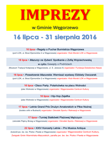 IMPREZY w Gminie Węgorzewo 16 lipca - 31 sierpnia 2016 16 lipca • Regaty o Puchar Burmistrza Węgorzewa (port LOK, ul. Braci Ejsmontów 2 w Węgorzewie) organizator: Klub Morski LOK w Węgorzewie 16 lipca • Mazurzy na Syberii. Spotkanie z Zofią Wojciechowską w cyklu Gawędy o Podróżach (Muzeum Tradycji Kolejowej w Węgorzewie, ul. S. Jaracza 4) organizator: Fundacja Dziedzictwo Nasze 16 lipca • Przestrzenie Mazurskie. Wernisaż wystawy Elżbiety Owczarek (port LOK, ul. Braci Ejsmontów 2 w Węgorzewie) organizator: Klub Morski LOK w Węgorzewie 16 lipca • Disco Party. Potańcówka na placu Wolności (plac Wolności w Węgorzewie) organizator: Węgorzewskie Centrum Kultury 16 lipca • Hip-Hop Zajafka (plac Wolności w Węgorzewie) organizator: Węgorzewskie Centrum Kultury 17 lipca • Letnie Grand Prix Drużyn Amatorskich w Piłce Nożnej (boisko orlik w Budrach) organizator: Ośrodek Sportu i Rekreacji w Węgorzewie 17 lipca • Turniej Siatkówki Plażowej Mężczyzn (ośrodek Piękny Brzeg w Węgorzewie) organizator: Ośrodek Sportu i Rekreacji w Węgorzewie 22 lipca • XXIV Koncerty Letnie – Pro Musica Antiqua (kościół pw. św. św. Piotra i Pawła w Węgorzewie) organizator: Węgorzewskie Centrum Kultury, Związek Gmin Warmińsko-Mazurskich, parafia pw. św. św. Piotra i Pawła w Węgorzewie 23 lipca • Polska gwiazdka na afrykańskim niebie. Spotkanie z Zofią Wojciechowską w cyklu Gawędy o Podróżach (Muzeum Tradycji Kolejowej w Węgorzewie, ul. S. Jaracza 4) organizator: Fundacja Dziedzictwo Nasze 23 lipca • Turniej Piłki Nożnej Oldbojów 35+, 45+ (stadion miejski w Węgorzewie) organizator: Ośrodek Sportu i Rekreacji w Węgorzewie 24 lipca • Światowe Dni Młodzieży: Biesiada Warszawsko-Lwowska (plac Wolności w Węgorzewie) organizator: Węgorzewskie Centrum Kultury 29-30 lipca • Dni Węgorzewa (plac Wolności w Węgorzewie) organizator: Węgorzewskie Centrum Kultury 30 lipca • Indie: Ahmadabad. Hinduskie wesele z polskim akcentem. Spotkanie z Barbarą i Ryszardem Chodakowskimi w cyklu Gawędy o Podróżach (Muzeum Tradycji Kolejowej w Węgorzewie, ul. S. Jaracza 4) organizator: Fundacja Dziedzictwo Nasze 31 lipca • Niedziela na Plaży (w ramach Dni Węgorzewa) (Plaża Miejska Mamry w Węgorzewie) organizator: Ośrodek Sportu i Rekreacji w Węgorzewie 6-7 sierpnia • XXXIX Międzynarodowy Jarmark Folkloru (plac Wolności w Węgorzewie) organizator: Muzeum Kultury Ludowej w Węgorzewie 7 sierpnia • Letnie Grand Prix Drużyn Amatorskich w Piłce Nożnej (boisko orlik w Pozezdrzu) organizator: Ośrodek Sportu i Rekreacji w Węgorzewie 13 sierpnia • Podróż do Nepalu. Spotkanie z Barbarą i Krzysztofem Rytkami w cyklu Gawędy o Podróżach (Muzeum Tradycji Kolejowej w Węgorzewie, ul. S. Jaracza 4) organizator: Fundacja Dziedzictwo Nasze 13 sierpnia • Turniej Trójek Siatkarskich (ośrodek Piękny Brzeg w Węgorzewie) organizator: Ośrodek Sportu i Rekreacji w Węgorzewie 13 sierpnia • Spływ Kajakowy Wegorapą Węgorzewskie Bractwo Wodniaków 14 sierpnia • Niedziela na Plaży (Plaża Miejska Mamry w Węgorzewie) organizator: Ośrodek Sportu i Rekreacji w Węgorzewie 15 sierpnia • koncert Królewskiej Orkiestry Symfonicznej (plac przy Klubie 11. Mazurskiego Pułku Artylerii) organizator: Węgorzewskie Centrum Kultury 19 sierpnia • Turniej Disco Polo o Grand Prix Burmistrza Węgorzewa (plac Wolności w Węgorzewie) organizator: Węgorzewskie Centrum Kultury 20 sierpnia • W cyklu Gawędy o Podróżach: spotkanie z Ludmiłą Kalininą-Kowal „O parkach Sankt-Petersburga” (Muzeum Tradycji Kolejowej w Węgorzewie, ul. S. Jaracza 4) organizator: Fundacja Dziedzictwo Nasze 20 sierpnia • Turniej Piłkarski dla Dzieci i Młodzieży o Puchar Grzegorza Laty (stadion miejski w Węgorzewie) organizator: Akademia Piłkarska Węgorzewo 23 sierpnia • Turnieje Piłkarskie dla Dzieci i Młodzieży (roczniki 2000-2009) (boisko orlik w Węgorzewie, ul. Pionierów 6) organizator: Ośrodek Sportu i Rekreacji w Węgorzewie 27 sierpnia • Parki Moskwy. Spotkanie z Ludmiłą Kalininą-Kowal w cyklu Gawędy o Podróżach (Muzeum Tradycji Kolejowej w Węgorzewie, ul. S. Jaracza 4) organizator: Fundacja Dziedzictwo Nasze 28 sierpnia • Letnie Grand Prix Drużyn Amatorskich w Piłce Nożnej (z turniejem Czar PRL-u) (boisko orlik w Węgorzewie) organizator: Ośrodek Sportu i Rekreacji w Węgorzewie Zapraszamy! Więcej, szczegółowo: www.wegorzewo.pl Węgorzewskie Centrum Kultury – tel.: 87 427 26 41 Ośrodek Sportu i Rekreacji w Węgorzewie – tel.: 87 428 52 34 Muzeum Kultury Ludowej w Węgorzewie – tel.: 87 427 32 42 Klub Morski LOK – tel.: 603 20 20 20 Fundacja Dziedzictwo Nasze – tel.: 662 488 696 Zapraszamy w podróż koleją z Węgorzewa do Kętrzyna i z powrotem! Godziny odjazdów: 8.37, 12.12, 16.22 Codziennie z dworca kolejowego Węgorzewo! Po drodze pociąg zatrzymuje się w Przystani, w Kamionku Wielkim, w Radziejach, dwa razy w Gierłoży (przy Parku Miniatur Mazurolandia i przy Wilczym Szańcu) oraz w Karolewie Bilety (cały z Węgorzewa do Kętrzyna: 12 zł) do nabycia u kierownika pociągu Trasę obsługuje SKPL. Kursy w 2016 r. wykonywane będą przynajmniej do 28 sierpnia